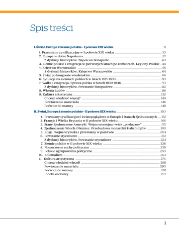 Spis treści I. Świat, Europa i ziemie polskie – I połowa XIX wieku ..................................................................................................... 8 1. P rzemiany cywilizacyjne w I połowie XIX wieku ............................................................................................... 10 2. Europa w dobie Napoleona................................................................................................................................................................ 27 Z dyskusji historyków. Napoleon Bonaparte......................................................................................................... 40 3. Ziemie polskie i emigracja w pierwszych latach po rozbiorach. Legiony Polskie ....44 4. Księstwo Warszawskie ........................................................................................................................................................................... 55 Z dyskusji historyków. Księstwo Warszawskie ................................................................................................... 64 5. Świat po kongresie wiedeńskim ................................................................................................................................................ 66 6. Sytuacja na ziemiach polskich w latach 1815–1830............................................................................................ 80 7. Walka i emigracja. Sprawa polska w latach 1830–1846 ................................................................................. 93 Z dyskusji historyków. Powstanie listopadowe ................................................................................................. 112 8. Wiosna Ludów ................................................................................................................................................................................................. 116 9. Kultura artystyczna .................................................................................................................................................................................. 132 Chcesz wiedzieć więcej? ................................................................................................................................................................ 144 Powtórzenie materiału ................................................................................................................................................................... 146 Poćwicz do matury .............................................................................................................................................................................. 148 II. Świat, Europa i ziemie polskie – II połowa XIX wieku ......................................................................................... 150 1. Przemiany cywilizacyjne i światopoglądowe w Europie i Stanach Zjednoczonych ......... 152 2. Francja i Wielka Brytania w II połowie XIX wieku ....................................................................................... 166 3. Stany Zjednoczone Ameryki. Wojna secesyjna i wiek „pozłacany” ....................................... 175 4.Zjednoczenie Włoch i Niemiec. Przebudowa monarchii Habsburgów .............................190 5. Rosja. Wojna krymska i przemiany w państwie .............................................................................................204 6. Powstanie styczniowe ......................................................................................................................................................................... 212 Z dyskusji historyków. Powstanie styczniowe .................................................................................................. 224 7. Ziemie polskie w II połowie XIX wieku ...................................................................................................................... 226 8. Nowoczesne ruchy polityczne ............................................................................................................................................... 239 9. Polskie ugrupowania polityczne ......................................................................................................................................... 250 10. Kolonializm ...................................................................................................................................................................................................... 263 11. Kultura artystyczna ............................................................................................................................................................. 274 Chcesz wiedzieć więcej? .................................................................................................................................................................. 288 Powtórzenie materiału ..................................................................................................................................................................... 290 Poćwicz do matury .................................................................................................................................................................................. 291 Indeks osobowy ........................................................................................................................................................................................... 293 3