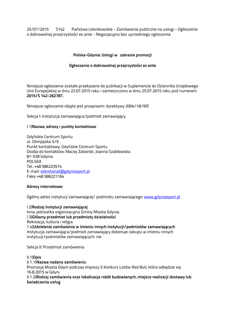 25/07/2015 S142 Państwa członkowskie - Zamówienie publiczne na usługi - Ogłoszenie o dobrowolnej przejrzystości ex ante - Negocjacyjna bez uprzedniego ogłoszenia Polska-Gdynia: Usługi w zakresie promocji Ogłoszenie o dobrowolnej przejrzystości ex ante Niniejsze ogłoszenie zostało przekazane do publikacji w Suplemencie do Dziennika Urzędowego Unii Europejskiej w dniu 22.07.2015 roku i zamieszczono w dniu 25.07.2015 roku pod numerem 2015/S 142-262787. Niniejsze ogłoszenie objęte jest przepisami: dyrektywy 2004/18/WE Sekcja I: Instytucja zamawiająca/podmiot zamawiający I.1)Nazwa, adresy i punkty kontaktowe Gdyńskie Centrum Sportu ul. Olimpijska 5/9 Punkt kontaktowy: Gdyńskie Centrum Sportu Osoba do kontaktów: Maciej Zaborski, Joanna Szabłowska 81-538 Gdynia POLSKA Tel.: +48 586223574 E-mail: [email protected] Faks: +48 586221164 Adresy internetowe: Ogólny adres instytucji zamawiającej/ podmiotu zamawiającego: www.gdyniasport.pl I.2)Rodzaj instytucji zamawiającej Inna: jednostka organizacyjna Gminy Miasta Gdynia I.3)Główny przedmiot lub przedmioty działalności Rekreacja, kultura i religia 1.4)Udzielenie zamówienia w imieniu innych instytucji/podmiotów zamawiających Instytucja zamawiająca/podmiot zamawiający dokonuje zakupu w imieniu innych instytucji/podmiotów zamawiających: nie Sekcja II: Przedmiot zamówienia II.1)Opis II.1.1)Nazwa nadana zamówieniu Promocja Miasta Gdyni podczas imprezy 5 Konkurs Lotów Red Bull, która odbędzie się 16.8.2015 w Gdyni. II.1.2)Rodzaj zamówienia oraz lokalizacja robót budowlanych, miejsce realizacji dostawy lub świadczenia usług Usługi Kategoria usług: nr 13: Usługi reklamowe Główne miejsce lub lokalizacja robót budowlanych, miejsce realizacji dostawy lub świadczenia usług: Polska. Kod NUTS PL II.1.3)Informacje na temat umowy ramowej lub dynamicznego systemu zakupów (DSZ) II.1.4)Krótki opis zamówienia lub zakupu Promocja Miasta Gdyni podczas imprezy 5 Konkurs Lotów Red Bull, która odbędzie się 16.8.2015 w Gdyni. II.1.5)Wspólny Słownik Zamówień (CPV) 79342200 II.6)Informacje na temat Porozumienia w sprawie zamówień rządowych (GPA) Zamówienie jest objęte Porozumieniem w sprawie zamówień rządowych (GPA): nie II.2)Całkowita końcowa wartość zamówienia (zamówień) II.2.1)Całkowita końcowa wartość zamówienia (zamówień) Sekcja IV: Procedura IV.1)Rodzaj procedury Negocjacyjna bez publikacji ogłoszenia o zamówieniu/uprzedniego ogłoszenia Uzasadnienie wyboru procedury negocjacyjnej bez uprzedniej publikacji ogłoszenia o zamówieniu w Dz.U.. UE zgodnie z art. 31 dyrektywy 2004/18/WE Roboty budowlane/towary/usługi mogą być zrealizowane lub dostarczone tylko przez określonego oferenta z przyczyn: technicznych, związanych z ochroną wyłącznych praw Art. 67 ust 1 pkt 1 a i b ustawy Prawo zamówień publicznych – zamówienie może być świadczone tylko przez jednego wykonawcę z przyczyn technicznych o obiektywnym charakterze i z przyczyn związanych z ochroną praw wyłącznych, wynikających z odrębnych przepisów. Zlecenie wykonania tego zadania Red Bull Spółce z ograniczoną odpowiedzialnościąz siedzibą w Warszawie jest zasadne, ponieważ spółka ta jest jedynym organizatorem 5 Konkursu Lotów Red Bull. Zawody Red Bull Flugtag, znane są w Polsce pod nazwą Konkurs Lotów Red Bull. Uczestniczą w nich ekipy uzdolnionych konstruktorów i śmiałych pilotów. Ekipa musi zaprojektować, zbudować i polecieć własnoręcznie wykonaną maszyną latającą, która po wybiciu z 6-metrowej platformy poszybuje lub, do czego dochodzi znacznie częściej, zaliczy spektakularne lądowanie na wodzie. Flugtag po niemiecku znaczy „dzień lotu”, jednak nie tylko o latanie za pomocą ludzkich mięśni tu chodzi. Ekipy oceniane są w trzech kategoriach: długość lotu, kreatywność konstrukcji oraz wrażenie artystyczne. Kryteria te zainspirowały uczestników poprzednich edycji do zbudowania latających naleśników, domów, pterodaktyli, bocianów, kamperów ze skrzydłami, a nawet szybujących postaci z kreskówek. Od czasu pierwszych zawodów Red Bull Flugtag, zorganizowanych w Wiedniu w 1992 roku, na całym świecie odbyło się już ponad 100 edycji Konkursu, a każda z nich przyciąga ok. 300 tysięcy widzów. Widowiskowe zmagania, które rozgrywane będą w samym sercu naszego miasta, spotkają się zapewne z żywym odbiorem licznej publiczności, zarówno mieszkańców, jak i turystów, która z zapartym tchem śledzić będzie zaciętą rywalizację zawodników z całej Polski. Miasto Gdynia od kilku lat, stanowi dla wielu różnego rodzaju eventów dobry i nierzadko stały adres, czemu sprzyja przyjazny duch miasta, zauważany i doceniany przez organizatorów wielu rozgrywanych w naszym mieście zawodów. IV.2)Kryteria udzielenia zamówienia IV.2.1)Kryteria udzielenia zamówienia IV.2.2)Informacje na temat aukcji elektronicznej Wykorzystana będzie aukcja elektroniczna: nie IV.3)Informacje administracyjne IV.3.1)Numer referencyjny nadany sprawie przez instytucję zamawiającą /podmiot zamawiający GCS.DZPI.2711.18.2015 IV.3.2)Poprzednie publikacje dotyczące tego samego zamówienia nie Sekcja V: Udzielenie zamówienia V.1)Data decyzji o udzieleniu zamówienia: V.2)Informacje o ofertach V.3)Nazwa i adres wykonawcy, na rzecz którego została wydana decyzja o udzieleniu zamówienia Red Bull Sp. z o.o. al. Wyścigowa 8 A 02-681 Warszawa POLSKA V.4)Informacje na temat wartości zamówienia V.5)Informacje na temat podwykonawstwa Przewidywane jest zlecenie podwykonawstwa w ramach zamówienia: nie Sekcja VI: Informacje uzupełniające VI.1)Informacje o funduszach Unii Europejskiej Zamówienie dotyczy projektu/programu finansowanego ze środków Unii Europejskiej: nie VI.2)Informacje dodatkowe: VI.3)Procedury odwoławcze VI.3.1)Organ odpowiedzialny za procedury odwoławcze Prezes Krajowej Izby Odwoławczej ul. Postępu 17A 02-676 Warszawa POLSKA VI.3.2)Składanie odwołań Dok