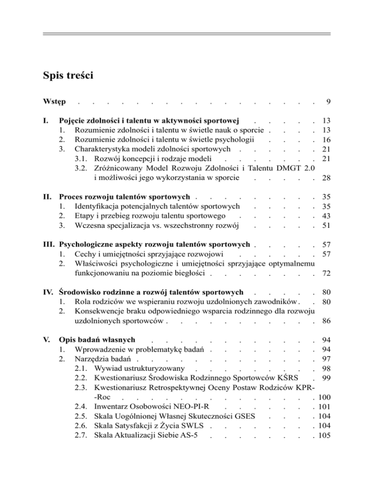 Spis treści Wstęp . . . . . . . . . . . . . . . . . . . 9 I.. . . . . Pojęcie . . zdolności . . i. talentu . .w aktywności . . . sportowej . . . . . . . . 13 1.. Rozumienie . . . zdolności . . .i talentu . .w świetle . . nauk . o .sporcie . . . . . 13 . . . zdolności . . .i talentu . .w świetle . . psychologii . . . . . . . 16 2.. Rozumienie . . . . . . . . . . . . . . . . . . 21 3. Charakterystyka modeli zdolności sportowych . 3.1. . .Rozwój . .koncepcji . . i rodzaje . . modeli . . . . . . . . . 21 3.2. Zróżnicowany Model Rozwoju Zdolności i Talentu DMGT 2.0 . . . .i możliwości . . . jego. wykorzystania . . . w. sporcie . . . . . . . 28 II.. . . . . . rozwoju . . talentów . . sportowych . . . . . . . Proces . . kacja . potencjalnych . . . . talentów . . sportowych . . . 1.. Identyfi . . i przebieg . . rozwoju . . talentu . . sportowego . . . . 2.. Etapy . . specjalizacja . . . .vs. wszechstronny . . . . rozwój . . 3.. Wczesna . . . . III. . Psychologiczne . . . . aspekty . . rozwoju . . talentów . . sportowych . . . . . 1.. Cechy . . i umiejętności . . . sprzyjające . . . rozwojowi . . . . . 2. Właściwości psychologiczne i umiejętności sprzyjające . . funkcjonowaniu . . . . na. poziomie . . biegłości . . . . . . . . . . . . . . . . . . . . . . 35 35 43 51 . . . . 57 . . . . 57 optymalnemu . . . . 72 IV. . Środowisko . . . rodzinne . . a. rozwój . . talentów . . sportowych . . . . . . . . 80 . 1.. Rola . .rodziców . . we .wspieraniu . . rozwoju . . uzdolnionych . . . .zawodników . . . . 80 2. Konsekwencje braku odpowiedniego wsparcia rodzinnego dla rozwoju . . uzdolnionych . . . .sportowców . . . . . . . . . . . . . 86 V.. Opis . badań . . własnych . . . . . . . . . . . . . . . . 1.. Wprowadzenie . . . . w problematykę . . . . badań . . . . . . . . . . 2.. Narzędzia . . . badań . . . . . . . . . . . . . . . . 2.1. . .Wywiad . .ustrukturyzowany . . . . . . . . . . . . . . . 2.2. . .Kwestionariusz . . . Środowiska . . . Rodzinnego . . . Sportowców . . . KŚRS . . . 2.3. Kwestionariusz Retrospektywnej Oceny Postaw Rodziców KPR. . . .-Roc. . . . . . . . . . . . . . . . . 2.4. . .Inwentarz . . Osobowości . . . NEO-PI-R . . . . . . . . . . . . 2.5. . .Skala . Uogólnionej . . . Własnej . . Skuteczności . . . GSES . . . . . . . . 2.6. . .Skala . Satysfakcji . . . z Życia . .SWLS . . . . . . . . . . . 2.7. . .Skala . Aktualizacji . . . Siebie . AS-5 . . . . . . . . . . 94 94 97 98 99 100 101 104 104 105 6 Małgorzata Siekańska ▪ Talent sportowy. Psychologiczne i środowiskowe... . . . . . 107 107 107 108 114 VI. . Prezentacja . . . wyników . . .badań . własnych . . . . . . . . . . . . 1.. Analizy . . opisowe . . . . . . . . . . . . . . . . . 1.1. . .Psychologiczna . . . charakterystyka . . . . badanych . . zawodników . . . . . . . . 1.2. . .Środowisko . . rodzinne . . .sportowców . . . . . . . . . . . . 1.3. . .Przebieg . . procesu . . rozwojowego . . . talentów . . sportowych . . . . . . 2. Wyniki badań – właściwości psychologiczne a przebieg procesu rozwo. . jowego . . talentów . . sportowych . . . . . . . . . . . . . . . 2.1. . .Hipotezy . . badawcze . . . . . . . . . . . . . . . 2.2. . .Analiza . .wyników . . . . . . . . . . . . . . . 2.3. . .Weryfi . kacja . .hipotez . i.podsumowanie . . . wyników . . . . . . . 3. Wyniki badań – czynniki środowiska rodzinnego a przebieg procesu . . rozwojowego . . . .talentów . .sportowych . . . . . . . . . . . . . 3.1. . .Hipotezy . . badawcze . . . . . . . . . . . . . . . 3.2. . .Analiza . .wyników . . . . . . . . . . . . . . . 3.3. . .Weryfi . kacja . .hipotez . i.podsumowanie . . . wyników . . . . . . . 4. Wyniki badań – wczesne ukierunkowanie vs. rozwój wszechstronny a przebieg procesu rozwojowego i jego środowiskowe uwarunkowania . . 4.1. . .Hipotezy . . badawcze . . . . . . . . . . . . . . . 4.2. . .Analiza . .wyników . . . . . . . . . . . . . 4.2.1. Rodzaj doświadczeń związanych z uprawianiem sportu (wczesne ukierunkowanie vs. wszechstronny rozwój) . . . . . a .wskaźniki . . procesu . . rozwojowego . . . . . . . . . 4.2.2. Wpływ rodzaju doświadczeń związanych z uprawianiem sportu na siłę i kierunek związku między czynnikami śro. . . . . dowiska . . rodzinnego . . . i elementami . . . procesu . . rozwojowego . . . . . . 4.3. . .Weryfi . kacja . .hipotez . i.podsumowanie . . . wyników . . . . . . . . 5.. Wyniki . . badań . .– poziom . . rozwoju . . kompetencji . . . . . . . . . 6. Wyniki badań – właściwości psychologiczne a poziom rozwoju kompe. . tencji . . potwierdzonych . . . .osiągnięciami . . . sportowymi . . . . . . . . . . 6.1. . .Pytanie . badawcze . . . . . . . . . . . . . . . . 6.2. . .Analiza . .wyników . . . . . . . . . . . . . . . 6.3. . .Dyskusja . . i podsumowanie . . . . wyników . . . . . . . . . 7. Wyniki badań – czynniki środowiska rodzinnego a poziom rozwoju . . kompetencji . . . potwierdzonych . . . . osiągnięciami . . . sportowymi . . . . . . . . . 7.1. . .Pytanie . badawcze . . . . . . . . . . . . . . 116 117 117 120 122 . 3.. . . . . . . . 4.. . .badanych . . osób . . . . . . Opis . .Kryteria . . doboru . . . . . . 3.1. . .Procedura . . i teren . . badań . . . . 3.2. 3.3. . .Charakterystyka . . . .uczestników . . .badań . Analizy . . statystyczne . . . . . . . . . . . . . . . . . . . . . . . . . . . . . . . . . . . . . . 128 128 130 155 164 164 167 180 191 192 193 194 196 216 221 224 225 225 235 238 238 7 Spis treści . . . . . . . . 8. . . . . 7.2. . .Analiza . .wyników . . . . . . . . . . . . . 239 7.3. . .Dyskusja . . i podsumowanie . . . . wyników . . . . . . . . . 242 Wyniki badań – przebieg procesu rozwojowego a poziom kompetencji . . . . osiągnięciami . . . sportowymi . . . . . . . . . . 244 potwierdzonych 8.1. . .Pytanie . badawcze . . . . . . . . . . . . . . 244 8.2. . .Analiza . .wyników . . . . . . . . . . . . . 245 8.3. . .Dyskusja . . i podsumowanie . . . . wyników . . . . . . . . . 252 .