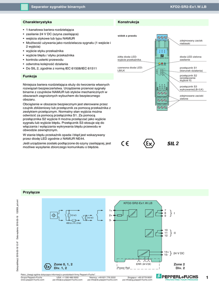 Separator sygnałów binarnych KFD2-SR2-Ex1.W.LB Charakterystyka Konstrukcja • • • • widok z przodu • • • • • 1-kanałowa bariera rozdzielająca zasilanie 24 V DC (szyna zasilająca) wejścia stykowe lub typu NAMUR Możliwość używania jako rozdzielacza sygnału (1 wejście i 2 wyjścia) wyjście styku przekaźnika wyjście błędu / styku przekaźnika kontrola usterki przewodu odwrotna kolejność działania Do SIL 2, zgodnie z normą IEC 61508/IEC 61511 zdejmowany zacisk niebieski 1 2 4 5 żółta dioda LED: wyjście przekaźnika 3 6 dioda LED zielona: zasilanie KFD2-SR2-Ex1.W.LB OUT CHK PWR czerwona dioda LED: LB/LK Funkcja przełącznik S1 (kierunek działania) S1 S2 S3 I Niniejsza bariera rozdzielająca służy do tworzenia własnych rozwiązań bezpieczeństwa. Urządzenie przenosi sygnały binarne z czujników NAMUR lub styków mechanicznych w obszarach zagrożonych wybuchem do bezpiecznego obszaru. przełącznik S2 (przełączanie wyjście II) II 7 8 9 10 11 12 13 14 15 przełącznik S3 wykrywanie(LB-/LK) zdejmowane zaciski zielone Obciążenie w obszarze bezpiecznym jest sterowane przez czujnik zbliżeniowy lub przełącznik za pomocą przekaźnika z zestykiem przełącznym. Normalny stan wyjścia można odwrócić za pomocą przełącznika S1. Za pomocą przełącznika S2 wyjście II można przełączać jako wyjście sygnału lub wyjście błędu. Przełącznik S3 stosuje się do włączania i wyłączania wykrywania błędu przewodu w obwodzie zewnętrznym. W stanie błędu przekaźnik opada i błąd jest wskazywany przez diodę LED zgodnie z NAMUR NE44. 2 Jeśli urządzenie zostało podłączone do szyny zasilającej, jest możliwe wysyłanie zbiorczego komunikatu o błędzie. Data publikacji 2016-05-18 12:47 Data wydania 2016-05-18 132959_pol.xml Przyłącze KFD2-SR2-Ex1.W.LB 1+ 10 kΩ 400 Ω ≤ R ≤ 2 kΩ Zone 0, 1, 2 Div. 1, 2 10 kΩ 2+ 7 8 9 I 10 11 12 II 14+ 15- 24 V DC 3- ERR 24 V DC Power Rail Patrz „Uwagi ogólne dotyczące informacji o produktach firmy Pepperl+Fuchs”. Grupa Pepperl+Fuchs USA: +1 330 486 0002 Niemcy: +49 621 776 2222 www.pepperl-fuchs.com [email protected] [email protected] Singapur: +65 6779 9091 [email protected] Zone 2 Div. 2 1 Dane techniczne KFD2-SR2-Ex1.W.LB Dane ogólne typ sygnału Wejżcie binarne Zasilanie Przyłącze Napięcie znamionowe tętnienie prądu Prąd znamionowy Strata mocy szyna zasilająca lub zaciski 14+, 15Un 20 ... 30 V DC In ≤ 50 mA Pobór mocy ≤ 10 % 1W < 1,3 W wejście Przyłącze zaciski 1+, 2+, 3- Wartożci znamionowe wg EN 60947-5-6 (NAMUR) Napięcie pracy jałowej / prąd zwarcia ok. 8 V DC / ok. 8 mA Punkt przełączania / histereza przełączania 1,2 ... 2,1 mA / ok. 0,2 mA Kontrola usterki przewodu przerwa I ≤ 0,1 mA , zwarcie I > 6 mA stosunek pulsów / pauz ≥ 20 ms / ≥ 20 ms Wyjście Przyłącze wyjżcie I: zaciski 7, 8, 9 ; wyjżcie II: zaciski 10, 11, 12 wyjżcie I sygnał ; przekaźnik wyjżcie II sygnał lub komunikat o błędzie ; przekaźnik obciążenie styku 253 V AC / 2 A / cos φ > 0,7; 126,5 V AC / 4 A / cos φ > 0,7; obciążenie opornościowe 40 V DC / 2 A Minimalny prąd przełączania 2 mA / 24 V DC Opóżnienie przyciągania / opadania kotwiczki ok. 20 ms / ok. 20 ms Trwałożć mechaniczna 107 cykle przełączania właściwości transmisji Częstotliwość przełączania ≤ 10 Hz Izolacja elektryczna wejście / wyjście wzmocniona izolacja zgodnie z normą IEC/EN 61010-1, napięcie znamionowe izolacji 300 Veff wejście / zasilanie wzmocniona izolacja zgodnie z normą IEC/EN 61010-1, napięcie znamionowe izolacji 300 Veff Wyjżcie / zasilanie wzmocniona izolacja zgodnie z normą IEC/EN 61010-1, napięcie znamionowe izolacji 300 Veff Wyjżcie / wyjżcie wzmocniona izolacja zgodnie z normą IEC/EN 61010-1, napięcie znamionowe izolacji 300 Veff Zgodność z dyrektywami Kompatybilność elektromagnetyczna Dyrektywa 2014/30/UE EN 61326-1:2013 (lokalizacja ośrodków przemysłowych) Niskie napięcie Dyrektywa 2014/35/UE EN 61010-1:2010 Zgodnożć Kompatybilność elektromagnetyczna NE 21:2006 Stopień ochrony IEC 60529:2001 wejście EN 60947-5-6:2000 Warunki otoczenia Temperatura otoczenia -20 ... 60 °C (-4 ... 140 °F) Data publikacji 2016-05-18 12:47 Data wydania 2016-05-18 132959_pol.xml Specyfikacja mechaniczna Stopień ochrony IP 20 Masa ok. 150 g Wymiary 20 × 119 × 115 mm , typ obudowy B2 Montaż montaż na szynie znormalizowanej 35 mm wg EN 60715:2001 Dane dotyczące stosowania w obszarach Ex Certyfikat badania typu WE PTB 00 ATEX 2080 Grupa, kategoria, stopień ochrony przed zapłonem ¬ II (1)G [Ex ia Ga] IIC ¬ II (1)D [Ex ia Da] IIIC ¬ I (M1) [Ex ia Ma] I wejście Ex ia Napięcie Prąd Zasilanie Zasilanie Uo 10,5 V Po 34 mW (charakterystyka liniowa) Io 13 mA maksymalne napięcie bezpieczne Um 253 V AC / 125 V DC (Uwaga! Um nie jest napięciem znamionowym) obciążenie styku 253 V AC / 2 A / cos φ > 0,7; 126,5 V AC / 4 A / cos φ > 0,7; obciążenie opornościowe 40 V DC / 2 A maksymalne napięcie bezpieczne Um 253 V AC (Uwaga! Napięcie znamionowe może być mniejsze) Wyjście Patrz „Uwagi ogólne dotyczące informacji o produktach firmy Pepperl+Fuchs”. Grupa Pepperl+Fuchs USA: +1 330 486 0002 Niemcy: +49 621 776 2222 www.pepperl-fuchs.com [email protected] [email protected] Singapur: +65 6779 9091 [email protected] 2 Dane techniczne KFD2-SR2-Ex1.W.LB wyjście komunikatu o błędach maksymalne napięcie bezpieczne Um 40 V DC (Uwaga! Um nie jest napięciem znamionowym) Grupa, kategoria, stopień ochrony przed zapłonem ¬ II (3)G [Ex ic Gc] IIC Deklaracja zgodności wejście Napięcie Prąd Zasilanie Wyjście PF 08 CERT 0803 Ex ic Uo 10,5 V Po 34 mW (charakterystyka liniowa) Io obciążenie styku Deklaracja zgodności Grupa, kategoria, typ ochrony, klasa temperaturowa 13 mA 253 V AC / 2 A / cos φ > 0,7; 126,5 V AC / 4 A / cos φ > 0,7; obciążenie opornościowe 40 V DC / 2 A TÜV 99 ATEX 1493 X ¬ II 3G Ex nA nC IIC T4 Wyjście obciążenie styk