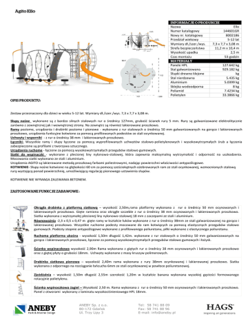 Nazwa Numer katalogowy Nowy nr. katalogowy Przedział wiekowy Wymiary dł./szer./wys. Strefa bezpieczeństwa Wysokość upadku Czas montażu Panele HPL Stal galwanizowana Słupki drewno klejone Stal nierdzewna Aluminium Sklejka wodoodporna Poliamid Polietylen Ello 144601GR 8002186 5-12 lat 7,3 x 7,7 x 3,08 m 11,2 m x 10,4 m 2,5 m 53 godzin 127.642 kg 929.182 kg kg 5.435 kg 5.0399 kg 8 kg 7.4234 kg 33.3866 kg Zestaw przeznaczony dla dzieci w wieku 5-12 lat. Wymiary dł./szer./wys. 7,3 x 7,7 x 3,08 m. Słupy nośne wykonane są z bardzo silnych stalowych rur o średnicy 127mm, grubość ścianek rury 5 mm. Rury są galwanizowane elektrolitycznie zarówno z zewnętrznej jak i wewnętrznej strony. Na zewnątrz są również lakierowane proszkowo. Ramy poziome, urządzenia i drabinki poziome i pionowe - wykonane z rur stalowych o średnicy 50 mm galwanizowanych na gorąco i lakierowanych proszkowo, urządzenia funkcyjne kotwione za pomocą profilowanych podestów ze stali ocynkowanej. Uchwyty i wsporniki - z rur o średnicy 38 mm i lakierowanych proszkowo. Łączniki- Wszystkie ramy i słupy łączone za pomocą wyprofilowanych uchwytów stalowo-polietylenowych i wysokowytrzymałych śrub a łączenia zabezpieczone są profilami z tworzywa sztucznego. Urządzenia ruchome - łączone za pomocą wysokowytrzymałych przegubów stalowo gumowych. Siatki do wspinaczki - wykonane z plecionej liny nylonowo-stalowej, która zapewnia maksymalną wytrzymałość i odporność na uszkodzenia. Mocowania siatki wykonano ze stali i aluminium. Urządzenia AGITO są lakierowane metodą proszkową farbami poliestrowymi, nadając powierzchni właściwości antypoślizgowe. KOTWIENIE- Słupy nośne kotwione na głębokości 60 cm za pomocą sześciokątnych ożebrowanych ram ze stali ocynkowanej, wzmocnionych stalową rurą wystającą ponad powierzchnię, umożliwiającą regulację pionowego ustawienia słupów. KOTWIENIE NIE WYMAGA ZALEWANIA BETONEM. Okrągła drabinka z platformą siatkową – wysokość 2,50m,rama platformy wykonana z rur o średnicy 50 mm ocynowanych i lakierowanych proszkowo. Gięte ramiona oraz okrągłe szczeble z rur o średnicy 38 mm ocynowanych i lakierowanych proszkowo. Siatka wykonana z wytrzymałej plecionej liny nylonowo-stalowej 18 mm z zaczepami ze stali i aluminium. Równoważnia -2,3 x 0,5 x 0,47 m gięte ramy w kształcie łuków wykonane z rur o średnicy 38mm ze stali galwanizowanej na gorąco i lakierowanej proszkowo. Wszystkie ruchome podesty mocowane do ram kotwiących za pomocą elastycznych przegubów stalowo gumowych. Podesty stopnie antypoślizgowe wykonane z profilowanego poliuretanu, piłki wykonane z elastycznego poliuretanu. Ruchoma platforma ukośna - wysokość 1,50m długość 1,42m. wykonane z rur stalowych o średnicy 50 mm galwanizowanych na gorąco i lakierowanych proszkowo, łączone za pomocą wysokowytrzymałych przegubów stalowo gumowych i łożysk. Ścianka wspinaczkowa wysokość 2,90m Rama wykonana z giętych rur o średnicy 38 mm ocynowanych i lakierowanych proszkowo oraz z giętej płyty o grubości 18mm. Uchwyty wykonane z masy kruszyw polimerowych. Drabinka siatkowa pionowa – wysokość 2,40m rama wykonana z rury 38mm ocynkowanej i lakierowanej proszkowo. Siatka wykonana z odpornego na rozciąganie łańcucha 6mm ze stali ocynkowanej w powłoce poliuretanowej. Zjeżdżalnia – wysokość 1,50m długość 2,55m szerokość 1,20m w kształcie banana wykonana wysokiej gęstości formowanego rotacyjnie polietylenu. Ścianka wspinaczkowa żagiel – Wysokość 2,50 m. Rama wykonana z rur o średnicy 50 mm ocynowanych i lakierowanych proszkowo. Panel z otworami wykonany z laminatu wysokociśnieniowego HPL 18mm. ANEBY Sp. z o.o. 80-172 Gdańsk Ul. Trzy Lipy 3 Tel: 58 741 88 09 Fax: 58 741 88 96 E-mail: [email protected] Drabinka pionowa- rama i poręcze wykonane z rur o średnicy 50mm galwanizowanej i lakierowanej proszkowo. Piłki wspinaczkowe - wysokość 2,70m, gięte rury o średnicy 38 mm ocynowane i lakierowane proszkowo, piłki wykonane z elastycznej mikrokomórkowej pianki poliuretanowej. Worek treningowy – wysokość 2,45m. rura o średnicy 38 mm ocynowana i lakierowana proszkowo, worek wykonany z elastycznej mikrokomórkowej pianki poliuretanowej. Rura strażaka – wysokość 3,06m - uchwyt wykonany ze stali ø 38 mm galwanizowanej elektrolitycznie i lakierowanej proszkowo, rura zjazdowa wykonana z anodowanego aluminium. Produkt został poddany kontroli pod kątem zgodności z normami EN 1176 i oznaczony znakiem TÜV SÜD Germany