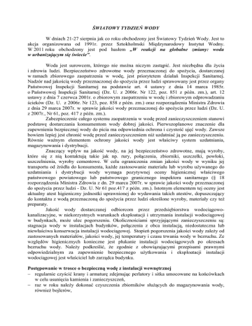ŚWIATOWY TYDZIEŃ WODY W dniach 21-27 sierpnia jak co roku obchodzony jest Światowy Tydzień Wody. Jest to akcja organizowana od 1991r. przez Sztokholmski Międzynarodowy Instytut Wodny. W 2011 roku obchodzony jest pod hasłem „W reakcji na globalne zmiany: woda w urbanizującym się świecie”. Woda jest surowcem, którego nie można niczym zastąpić. Jest niezbędna dla życia i zdrowia ludzi. Bezpieczeństwo zdrowotne wody przeznaczonej do spożycia, dostarczanej w ramach zbiorowego zaopatrzenia w wodę, jest priorytetem działań Inspekcji Sanitarnej. Nadzór nad jakością wody przeznaczonej do spożycia przez ludzi sprawowany jest przez organy Państwowej Inspekcji Sanitarnej na podstawie art. 4 ustawy z dnia 14 marca 1985r. o Państwowej Inspekcji Sanitarnej (Dz. U. z 2006r. Nr 122, poz. 851 z późn. zm.), art. 12 ustawy z dnia 7 czerwca 2001r. o zbiorowym zaopatrzeniu w wodę i zbiorowym odprowadzaniu ścieków (Dz. U. z 2006r. Nr 123, poz. 858 z późn. zm.) oraz rozporządzenia Ministra Zdrowia z dnia 29 marca 2007r. w sprawie jakości wody przeznaczonej do spożycia przez ludzi (Dz. U. z 2007r., Nr 61, poz. 417 z późn. zm.). Zabezpieczenie całego systemu zaopatrzenia w wodę przed zanieczyszczeniem stanowi podstawę dostarczania konsumentom wody dobrej jakości. Pierwszoplanowe znaczenie dla zapewnienia bezpiecznej wody do picia ma odpowiednia ochrona i czystość ujęć wody. Zawsze bowiem lepiej jest chronić wodę przed zanieczyszczeniem niż uzdatniać ją po zanieczyszczeniu. Równie ważnym elementem ochrony jakości wody jest właściwy system uzdatniania, magazynowania i dystrybucji. Znaczący wpływ na jakość wody, na jej bezpieczeństwo zdrowotne, mają wyroby, które się z nią kontaktują takie jak np. rury, połączenia, zbiorniki, uszczelki, powłoki, uszczelnienia, wyroby cementowe. W celu ograniczenia zmian jakości wody w wyniku jej transportu od źródła do konsumenta, każde zastosowanie materiału lub wyrobu używanego do uzdatniania i dystrybucji wody wymaga pozytywnej oceny higienicznej właściwego państwowego powiatowego lub państwowego granicznego inspektora sanitarnego (§ 18 rozporządzenia Ministra Zdrowia z dn. 29 marca 2007r. w sprawie jakości wody przeznaczonej do spożycia przez ludzi - Dz. U. Nr 61 poz.417 z późn. zm.). Istotnym elementem tej oceny jest aktualny atest higieniczny jednostki uprawnionej do wydawania takich atestów, dopuszczający do kontaktu z wodą przeznaczoną do spożycia przez ludzi określone wyroby, materiały czy też preparaty. Jakość wody dostarczanej odbiorcom przez przedsiębiorstwa wodociągowokanalizacyjne, w niekorzystnych warunkach eksploatacji i utrzymania instalacji wodociągowej w budynkach, może ulec pogorszeniu. Okolicznościami sprzyjającymi zanieczyszczeniu są: stagnacja wody w instalacjach budynków, połączenia z obca instalacją, niedostateczna lub niewłaściwa konserwacja instalacji wodociągowej. Stopień pogorszenia jakości wody zależy od zastosowanych materiałów, jakości wody, jej temperatury i czasu trwania wody w bezruchu. Ze względów higienicznych konieczne jest płukanie instalacji wodociągowych po okresach bezruchu wody. Należy podkreślić, że zgodnie z obowiązującymi przepisami prawnymi odpowiedzialnym za zapewnienie bezpiecznego użytkowania i eksploatacji instalacji wodociągowej jest właściciel lub zarządca budynku. Postępowanie w trosce o bezpieczną wodę z instalacji wewnętrznej − regularnie czyścić krany i armaturę zdejmując perlatory i sitka umocowane na końcówkach w celu usunięcia kamienia i zanieczyszczeń, − raz w roku należy dokonać czyszczenia zbiorników służących do magazynowania wody, również bojlerów, − w przypadku dłuższej stagnacji wody i nie używania jej należy pamiętać o przepłukaniu instalacji przed ponownym korzystaniem z wody, − zachować odpowiedni odstęp lub izolację pomiędzy rurami wody ciepłej i zimnej, − utrzymywać temperaturę wody ciepłej powyżej 55°C a zimnej poniżej 20°C. Zgodnie z rozporządzeniem „woda jest bezpieczna dla zdrowia ludzkiego, jeżeli jest wolna od mikroorganizmów chorobotwórczych i pasożytów w liczbie stanowiącej potencjalne zagrożenie dla zdrowia ludzkiego, wszelkich substancji w stężeniach stanowiących potencjalne zagrożenie dla zdrowia ludzkiego oraz nie ma właściwości korozyjnych i spełnia wymagania określone w rozporządzeniu Ministra Zdrowia z dnia 29 marca 2007r.w sprawie jakości wody przeznaczonej do spożycia przez ludzi.”. Zanieczyszczenia chemiczne mogą powstawać na skutek korozji instalacji wodociągowych lub też migracji do wody różnego rodzaju substancji organicznych z materiałów użytych do budowy rurociągu. Korozji sprzyjają wody miękkie, kwaśne, zawierające znaczne ilości chlorków, siarczków, azotanów. Wewnętrzna korozja rur i armatury ma bezpośredni wpływ na stężenie związków kadmu, miedzi, żelaza, ołowiu i cynku. Wszystkie substancje przekraczające dopuszczalne zawartości mogą mieć ujemne skutki dla zdrowia, ale szereg tych substancji może okazać się szkodliwymi dopiero po długotrwałym spożywaniu, dlatego też substancje toksyczne mające właściwości kumulacyjne w organizmie oraz związki o długotrwałym działaniu mutagennym lub rakotwórczym wymagają szczególnej uwagi przy ustalaniu NDS (najwyższe dopuszczalne stężenie). Dawniej do dystrybucji wody stosowano powszechnie rury azbestowo-cementowe, których obecnie nie stosuje się. Mimo powszechnej obawy przed azbestem, eksperci Światowej Organizacji Zdrowia uznali, że włókna azbestu obecne w wodzie nie stanowią zagrożenia zdrowotnego – azbest jest związkiem rakotwórczym dla człowieka przy wprowadzeniu go organizmu drogą inhalacji, poprzez wdychanie, nie drogą pokarmową. Powszechne zastosowanie miały i nadal są używane rury żeliwne, ze stali ocynkowanej i miedziane, które należą do materiałów podatnych na 
