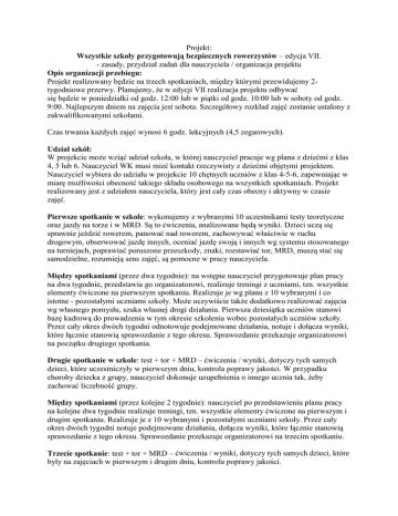 Projekt: Wszystkie szkoły przygotowują bezpiecznych rowerzystów – edycja VII. - zasady, przydział zadań dla nauczyciela / organizacja projektu Opis organizacji przebiegu: Projekt realizowany będzie na trzech spotkaniach, między którymi przewidujemy 2tygodniowe przerwy. Planujemy, że w edycji VII realizacja projektu odbywać się będzie w poniedziałki od godz. 12:00 lub w piątki od godz. 10:00 lub w soboty od godz. 9:00. Najlepszym dniem na zajęcia jest sobota. Szczegółowy rozkład zajęć zostanie ustalony z zakwalifikowanymi szkołami. Czas trwania każdych zajęć wynosi 6 godz. lekcyjnych (4,5 zegarowych). Udział szkół: W projekcie może wziąć udział szkoła, w której nauczyciel pracuje wg planu z dziećmi z klas 4, 5 lub 6. Nauczyciel WK musi mieć kontakt rzeczywisty z dziećmi objętymi projektem. Nauczyciel wybiera do udziału w projekcie 10 chętnych uczniów z klas 4-5-6, zapewniając w miarę możliwości obecność takiego składu osobowego na wszystkich spotkaniach. Projekt realizowany jest z udziałem nauczyciela, który jest cały czas obecny i aktywny w czasie zajęć. Pierwsze spotkanie w szkole: wykonujemy z wybranymi 10 uczestnikami testy teoretyczne oraz jazdy na torze i w MRD. Są to ćwiczenia, analizowane będą wyniki. Dzieci uczą się sprawnie jeździć rowerem, panować nad rowerem, zachowywać właściwie w ruchu drogowym, obserwować jazdę innych, oceniać jazdę swoją i innych wg systemu stosowanego na turniejach, poprawiać poruszone przeszkody, znaki, rozstawiać tor, MRD, muszą stać się samodzielne, rozumieją sens zajęć, są pomocne w pracy nauczyciela. Między spotkaniami (przez dwa tygodnie): na wstępie nauczyciel przygotowuje plan pracy na dwa tygodnie, przedstawia go organizatorowi, realizuje treningi z uczniami, tzn. wszystkie elementy ćwiczone na pierwszym spotkaniu. Realizuje je wg planu z 10 wybranymi i co istotne - pozostałymi uczniami szkoły. Może oczywiście także dodatkowo realizować zajęcia wg własnego pomysłu, szuka własnej drogi działania. Pierwsza dziesiątka uczniów stanowi bazę kadrową do prowadzenia w tym okresie szkolenia wobec pozostałych uczniów szkoły. Przez cały okres dwóch tygodni odnotowuje podejmowane działania, notuje i dołącza wyniki, które łącznie stanowią sprawozdanie z tego okresu. Sprawozdanie przekazuje organizatorowi na początku drugiego spotkania. Drugie spotkanie w szkole: test + tor + MRD – ćwiczenia / wyniki, dotyczy tych samych dzieci, które uczestniczyły w pierwszym dniu, kontrola poprawy jakości. W przypadku choroby dziecka z grupy, nauczyciel dokonuje uzupełnienia o innego ucznia tak, żeby zachować liczebność grupy. Między spotkaniami (przez kolejne 2 tygodnie): nauczyciel po przedstawieniu planu pracy na kolejne dwa tygodnie realizuje treningi, tzn. wszystkie elementy ćwiczone na pierwszym i drugim spotkaniu. Realizuje je z 10 wybranymi i pozostałymi uczniami szkoły. Przez cały okres dwóch tygodni notuje podejmowane działania, dołącza wyniki, które łącznie stanowią sprawozdanie z tego okresu. Sprawozdanie przekazuje organizatorowi na trzecim spotkaniu. Trzecie spotkanie: test + tor + MRD – ćwiczenia / wyniki, dotyczy tych samych dzieci, które były na zajęciach w pierwszym i drugim dniu, kontrola poprawy jakości. Po trzecim spotkaniu: Oczekujemy na daleko idącą aktywność nauczyciela i postęp między wynikami na kolejnych spotkaniach, co jest potwierdzeniem, że realizacja projektu przyniosła efekty. Po zakończeniu projektu nauczyciel przesyła do Stowarzyszenia odnotowane w czasie realizacji projektu wnioski. Do udziału szkoły w projekcie potrzebne jest spełnienie następujących warunków: Zapewnienie pomieszczenia (klasa) + zaplecze socjalne, Z uwagi na nie zawsze możliwą pracę na dworze - możliwość pracy w budynku szkoły – niezbędna sala gimnastyczna i (lub) odpowiednio szerokie korytarze. Oczywiście nie muszą to być wyłącznie pomieszczenia szkolne. Możliwość podbicia delegacji, Możliwość sprawnego korespondowania z nauczycielem z użyciem aktywnego e-maila. DO PODJĘCIA DECYZJI O ZAKWALIFIKOWANIU SZKOŁY DO PROJEKTU NIEZBĘDNA JEST TEŻ INFORMACJA: • Czy szkoła posiada rowery typu Wigry (koło 20 cali). Ile sztuk? • Jaki jest dostęp do innych rowerów? Możliwość skorzystania z rowerów dzieci. Jakie to są rowery, ile ich jest? • Czy szkoła posiada przeszkody do toru wg OTBwRD. Jakie ? • Proszę krótko wskazać, co skłoniło Panią, Pana do zgłoszenia szkoły do projektu? • Ile w szkole jest dzieci w klasach 4, 5, 6. Ile tych klas jest w szkole? • W której klasie realizowane są zagadnienia WK? • Czy szkoła posiada znaki drogowe z możliwością ich przestawiania, jakie konkretnie ? • Aktywny adres e-mail do nauczyciela; • Aktywny telefon do nauczyciela; • Zgłaszając szkołę proszę wskazać na możliwe do realizacji terminy ( lub lepiej wskazać terminy, gdy realizacja na pewno nie jest możliwa). P od 12:00 20.X 27.X 3.XI 17.XI 24.XI 1.XII 8.XII w ś Propozycje możliwych terminów: c P od 10:00 17.X 24.X S od 9:00 18.X 25.X 7.XI 14.XI 8.XI 15.XI 5.XII 12.XII 6.XII 13.XII n Informacja o zakwalifikowaniu szkoły do projektu zostanie przesłana na adres mailowy nauczyciela. Marek Pasek