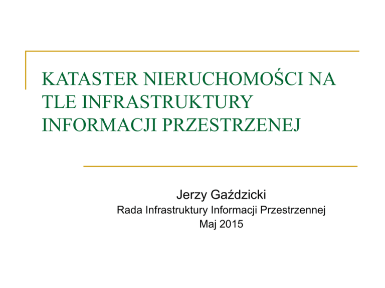 KATASTER NIERUCHOMOŚCI NA TLE INFRASTRUKTURY INFORMACJI PRZESTRZENEJ Jerzy Gaździcki Rada Infrastruktury Informacji Przestrzennej Maj 2015 WSTĘP W wydanej ostatnio wspólnej publikacji FIG/World Bank Fit-ForPurpose Land Administration podkreśla się, że 75% mieszkańców Ziemi nie ma możliwości zapewnienia sobie praw do nieruchomości, ze względu na brak odpowiednich systemów katastralnych. Celem polepszenia tej sytuacji postuluje się projektowanie i wdrażanie systemów dostosowanych do potrzeb (fit-for-purpose), zgodnie z podejściem umożliwiającym ich wieloetapowy rozwój, z tym, że już pierwszy etap powinien dawać konkretne rezultaty. Polska należy do państw rozwiniętych i dobrze funkcjonujących pod tym względem. Niemniej jednak, wiele jeszcze pozostaje do zrobienia, warto dyskutować o naszym fit-for-purpose podejściu uwzględniającym polskie i europejskie uwarunkowania oraz tendencje rozwojowe. Maj 2015 Jerzy Gaździcki, Rada IIP 2 PODSTAWOWE POJĘCIA Katastrem nieruchomości (Real Estate Cadastre) nazywa się w Polsce ewidencję gruntów i budynków podlegającą obecnie modernizacji. Z katastrem nieruchomości powiązany jest zintegrowany system informacji o nieruchomościach ZSIN (Integrated Real Estate Information System) , który jest systemem teleinformatycznym umożliwiającym utrzymanie łączności, wymiany i spójności danych pomiędzy katastrem nieruchomości oraz innymi rejestrami i systemami publicznymi. Kataster nieruchomości stanowi jeden z systemów administracji gruntami (Land Administration). Maj 2015 Jerzy Gaździcki, Rada IIP 3 ZARZĄDZANIE PRZESTRZENIĄ PAŃSTWA(1) Zarządzanie przestrzenią państwa należy rozumieć jako całokształt polityk oraz zmierzających do ich wdrażania działań organów rządowych i samorządowych w zakresie gospodarowania zasobami przestrzeni z uwzględnieniem potrzeb i wymogów społecznych, gospodarczych i przyrodniczych. Zasoby te obejmują ziemię oraz powiązane z nią obiekty naturalne i antropogeniczne w tym nieruchomości, stanowiąc bogactwo narodowe, którego wartość może być pomnażana przez racjonalne zarządzanie. Proponowany wyżej termin nawiązuje do angielskiego terminu Land Governance przyjętego przez Bank Światowy wespół z instytucjami ONZ dla holistycznego ujęcia i oceny rozwoju poszczególnych państw w tym zakresie. Maj 2015 Jerzy Gaździcki, Rada IIP 4 ZARZĄDZANIE PRZESTRZENIĄ PAŃSTWA (2) W podejściu Banku Światowego zwrócono uwagę przede wszystkim na następujące newralgiczne obszary, które mogą wymagać reform oraz pomocy międzynarodowej: Ramy prawne i instytucjonalne Planowanie i zagospodarowanie przestrzenne oraz opodatkowanie nieruchomości Zarządzanie własnością publiczną Dostępność informacji przestrzennej Rozstrzyganie sporów oraz zarządzanie konfliktami W Polsce, państwie członkowskim UE, podejście holistyczne musi uwzględniać interdyscyplinarność, wielotematyczność, wieloresortowość oraz wielopodmiotowość informacji geoprzestrzennej w aspekcie lokalnym, regionalnym, państwowym i unijnym. Maj 2015 Jerzy Gaździcki, Rada IIP 5 IIP W ZARZĄDZANIU PRZESTRZENIĄ PAŃSTWA Współczesne zarządzanie przestrzenią realizowane jest przy użyciu odpowiedniej infrastruktury informacji przestrzennej. W Polsce na mocy ustawy stanowiącej transpozycję dyrektywy INSPIRE tworzona i rozbudowywana jest infrastruktura informacji przestrzennej (IIP), która obejmuje systemy i bazy danych informacji przestrzennej prowadzone zgodnie z odrębnymi przepisami przez odpowiednie organy i instytucje. Wyniki wdrażania dyrektywy INSPIRE potwierdzają słuszność przyjętych w niej zasad oraz celowość stosowania ich do całokształtu problematyki zarządzania przestrzenią, a więc przy szerokim rozumieniu zapisu w art.1 o przeznaczeniu infrastruktury …dla celów polityk wspólnotowych w zakresie ochrony środowiska oraz polityk lub działań mogących oddziaływać na środowisko. Maj 2015 Jerzy Gaździcki, Rada IIP 6 ROLA KATASTRU NIERUCHOMOŚCI W ZARZĄDZANIU PRZESTRZENIĄ PAŃSTWA Jednym z systemów wchodzących w skład IIP i mających na celu zarządzanie przestrzenią państwa jest kataster nieruchomości, który w połączeniu z systemem ZSIN służy do: Udostępniania wiarygodnej informacji o nieruchomościach do różnorakich celów publicznych i prywatnych wiążących się z użytkowaniem nieruchomości oraz rynkiem nieruchomości Zapewniania interoperacyjności systemów i rejestrów państwowych w zakresie informacji o nieruchomościach Wnoszenia wkładu do IIP polegającego na dostarczaniu szczegółowej informacji referencyjnej niezbędnej do tworzenia i funkcjonowania tematycznych baz danych zarówno na potrzeby krajowe (komponent IIP/PL) jak też europejskie (komponent IIP/INSPIRE) Maj 2015 Jerzy Gaździcki, Rada IIP 7 ZSIN, IIP, INSPIRE KOMPONENT EUROPEJSKI IIP (IIP/INSPIRE) JAKO POLSKI WKŁAD DO INSPIRE ZBIORY I USŁUGI DANYCH PRZESTRZENNYCH ZGODNE Z PRZEPISAMI EUROPEJKIMI UE MECHANIZMY TWORZENIA (HARMONIZACJI) I UTRZYMANIA DANYCH INSPIRE W POLSCE PL KOMPONENT KRAJOWY IIP ZSIN ZBIORY I USŁUGI DANYCH PRZESTRZENNYCH ZGODNE Z PRZEPISAMI POLSKIMI OZNACZENIA: INSPIRE KOMPONENT KRAJOWY IIP (IIP/PL) IIP IIP/PL IIP/INSPIRE Maj 2015 Jerzy Gaździcki, Rada IIP 8 PRZYKŁAD RELACJI MIĘDZY KOMPONENTAMI IIP MONITOROWANIE IMPLEMENTACJI DYREKTYWY ZGODNIE Z PRZEPISAMI UNIJNYMI NA PODSTAWIE WYSELEKCJONOWANYCH ZBIORÓW I USŁUG DANYCH PRZESTRZENNYCH IIP/INSPIRE IIP/PL DECYZJA ORGANU WIODĄCEGO O WŁĄCZENIU ZBIORÓW I USŁUG DO IIP/INSPIRE EWIDENCJONOWANIE ZBIORÓW I USŁUG DANYCH PRZESTRZENNYCH ZGODNIE Z PRZEPISAMI KRAJOWYMI KRYTERIA SELEKCJI: OKREŚLONE ART. 4 Z USTAWY O IIP (OBSZAR, POSTAĆ ELEKTRONICZNA, WŁASNOŚĆ, TEMATYKA), JAKOŚĆ UZASADNIAJĄCA PRZEZNACZENIE DO HARMONIZACJI ZAPEWNIAJĄCEJ SPEŁNIENIE PRZEPISÓW INSPIRE CO NAJMNIEJ DLA CZĘŚCI OBIEKTÓW Maj 2015 Jerzy Gaździcki, Rada IIP 9 PODSTAWY KONCEPCYJNE IIP IIP, ze szczególnym uwzg
