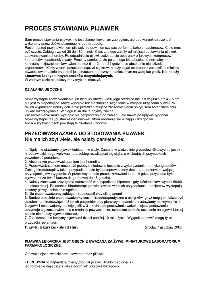 PROCES STAWIANIA PIJAWEK Sam proces stawiania pijawek nie jest skomplikowanym zabiegiem, ale pod warunkiem, że jest wykonany przez doświadczonego hirudoterapeutę. Pacjent przed przystawieniem pijawek nie powinien używać perfum, alkoholu, papierosów. Ciało musi być czyste. Zabieg trwa od 30 do 180 minut. Czas zabiegu zależy od miejsca postawienia pijawek i zaawansowania choroby. Po odpadnięciu pijawki zakłada się opatrunek z jałowych kompresów kompresów i opatrunek z waty. Prosimy pamiętać, że po zabiegu jest absolutnie normalnym i korzystnym zjawiskiem krwawienie przez 6 – 12 – do 24 godzin, co absolutnie nie szkodzi organizmowi. Kiedy z ranki przestanie sączyć się krew, należy zdjąć opatrunek i zostawić to miejsce otwarte, ewentualnie przetrzeć je spirytusem aptecznym naniesionym na watę lub gazik. Nie należy stosować żadnych innych środków dezynfekujących. W żadnym razie nie należy rany myć ani moczyć. DZIAŁANIA UBOCZNE Może wystąpić zaczerwienienie lub nieduży obrzęk. Jeśli jego średnica nie jest większa niż 4 – 5 cm, nie jest to niepokojące. Może wystąpić też nieznaczne swędzenie w miejscu ukąszenia pijawki. W takich wypadkach należy delikatnie przetrzeć miejsce zaczerwienienia spirytusem aptecznym oraz unikać rozdrapywania. W ciągu kilku dni te objawy znikną. Zaczerwienienie może wystąpić nie bezpośrednio po zabiegu, ale nawet po upływie tygodnia. Może wystąpić też „huśtawka cisnieniowa”, która unormuje się w ciągu kilku godzin. Nie u wszystkich osób powstają te działania uboczne. PRZECIWWSKAZANIA DO STOSOWANIA PIJAWEK Nie ma ich zbyt wiele, ale należy pamiętać że: 1. Nigdy nie stawiamy pijawek kobietom w ciąży. Zawarte w wydzielinie gruczołów ślinowych pijawek hirudozwiązki mogą wpływać na przebieg rozwijającej się ciąży, a w skrajnych przypadkach powodować poronienia. 2. Absolutnym przeciwwskazaniem jest hemofilia. 3. Przeciwwskazaniem może być przebyte niedawno leczenie z wykorzystaniem antykoagulantów. Zabieg hirudoterapii w takim przypadku może być przeprowadzony dopiero po przerwie trwającej przynajmniej dwa tygodnie. W przeciwnym razie proces krwawienia z ranki gdzie przyssana była pijawka może trwać bardzo długo (nawet do 48 godzin). 4. Należy zachować szczególną ostrożność w przypadkach hipotomii, gdy ciśnienie krwi wynosi 60/80 lub nieco mniej. Po seansie hirudoterapii prawie zawsze w takich przypadkach u pacjentów występują zawroty głowy i osłabienie ogólne. 5. Nie przeprowadzamy zabiegu hirudoterapii przy silnej anemii. 6. Bardzo ostrożnie przeprowadzamy sesje hirudoterapeutyczne u alergików, gdyż mogą oni także być uczuleni na hirudozwiązki. U takich pacjentów przy pierwszym seansie przystawiamy maksymalnie 1 2 pijawki i obserwujemy reakcję: jeśli w 3 – 4 dniu po postawieniu wokół miejsca postawienia utrzymuje się zaczerwienienie o średnicy powyżej 4 cm, oznaczać to może uczulenie na pijawki i takiej osobie nie należy pijawek stawiać. 7. Z założenia nie leczymy pijawkami dzieci poniżej 10 roku życia. Wyjątek stanowić mogą tylko przypadki replantacji. Pijawki lekarskie - skład śliny Środa, 7 grudnia 2005 PIJAWKA LEKARSKA JEST OBECNIE UWAŻANA ZA ŻYWE, MINIATUROWE LABORATORIUM FARMAKOLOGICZNE. Oto ważniejsze związki produkowane przez pijawki: • HIRUDYNA to najbardziej znany produkt pijawki Hirudo medicinalis i jednocześnie najlepszy z istniejących lek przeciwzakrzepowy. • BDELINA jest inhibitorem proteaz takich jak trypsyna, chymotrypsyna i plazmina, które są czynnikami stanów zapalnych i ich rozprzestrzeniania się w tkankach. Występuje przynajmniej w dwóch odmianach jako bdelina A i bdelina B. • HIRUSTAZYNA jest kolejnym zidentyfikowanym niedawno antykoagulantem produkowanym przez Hirudo medicinalis. Należy do związków organicznych zaliczanych do rodziny antystazyn. • GILANTYNA wyizolowana zastała z gruczołów ślinowych pijawki Haementeria ghilianii. Jest białkiem zawierającym duże ilości siarki. Działa jako antykoagulant i silny lek antyprzerzutowy. • APYRAZA jest potężnym enzymem upłynniającym krew (zmniejszającym jej lepkość). • EGLINA jest silnym środkiem przeciwzapalnym (inhibitorem czynników stanów zapalnych) oraz bardzo aktywnym antyutleniaczem. • HEMENTYNA jest fibrynogenolitycznym enzymem zdolnym zapobiegać krzepnięciu krwi oraz rozkładać (inkoagulować) utworzone już zakrzepy. • DESTABILAZA jest fermentem charakteryzującym się silnym działaniem przeciwagregacyjnym powodującym rozkładanie zakrzepłej krwi, co otwiera nowe drogi i możliwości dla hirudoterapii. Destabilaza zawiera także unikatową substancję niskocząsteczkową PROSTAGLANDYNĘ (podobną do PROSTACYCLINY). Utrzymuje ona w dobrym stanie (regeneruje) naczynia krwionośne, przewód pokarmowy oraz reguluje poziom cukru we krwi. Najbardziej tajemniczym w działaniu prostaglandyny jest „samoregulacja” ciśnienia krwi. Jeśli jest ono za niskie zostaje podwyższone, jeśli natomiast jest zbyt wysokie zostaje automatycznie obniżone do stanu optymalnego. Nie jest jeszcze w sposób ostateczny wyjaśniony mechanizm tego działania i jest on przedmiotem usilnych dociekań naukowych. • HIALURONIDAZA jest substancją o podwójnym działaniu. Jest silnym antybiotykiem oraz czynnikiem umożliwiającym szybkie przenikanie przez błony komórkowe, sąsiadujących ze sobą komórek i tkanek ciał. • LIPAZY i ESTERAZY to substancje powodujące rozkład tłuszczy. • SUBSTANCJE ZNIECZULAJĄCE – niezidentyfikowane bliżej, silne czynniki przeciwbólowe. Przypuszcza się, że działanie przeciwbólowe tych substancji wynika z dużej atrakcyjności dla ludzkiego mózgu NEUROPEPTYDÓW produkowanych przez pijawkę. Neuropeptydy te zawierają ENDORFINY znane powszechnie jako HORMONY SZCZĘŚCIA. Poza efektami przeciwbólowymi endorfiny te powodują: - likwidację uczucia niepokoju i euforii oraz u