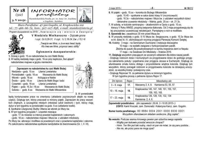 (312) 3. V 2015r. -4- 3 maja 2015 r. Nr 18 Rzymskokatolicka Parafia, pw. św. Anny i św. Joachima w Gogolinie - Karłubcu Biuro Parafialne: 47-320 Gogolin, ul. Krapkowicka 102 tel.: 77–466–66–72, kom.: 507–017–858, e-mail: [email protected] Program duszpasterski na 2015r.: „ N a w r a c a j c i e s i ę i w i e r z c i e w E w a n g e l i ę ” V N i e d z i e l a W i e l k a n o c n a – Dojrzałe grona I czyt.: Dz 9,26-31; II czyt.: 1J 3,18-24; Ew: J 15,1-8 „Trwajcie we Mnie, a Ja w was trwać będę. Kto trwa we Mnie, przynosi owoc obfity” Ogłoszenia duszpasterskie: 1. Dzisiaj o godz. 15.oo nabożeństwo ku czci Matki Bożej. 2. W każdą niedzielę maja o godz. 16.oo przy kapliczce „Na Łąkach” nabożeństwo majowe w języku niemieckim. Zapraszam na nabożeństwa ku czci Matki Bożej: Niedziela – godz. 15.oo Litania Loretańska Poniedziałek – godz. 18.oo Wezwania do Matki Bożej Wtorek – godz. 18.oo Królująca w Niebie Środa – godz. 18.oo Litania do Matki Boga i ludzi Czwartek – godz. 18.oo Litania Loretańska Piątek – godz. 16.3o i 18.oo Wezwania do Matki Bożej Sobota – godz. 8.oo Wezwania do Matki Miłosierdzia 3. W poniedziałek będą kontynuowane prace na cmentarzu (układanie poprzecznych alejek na nowej części). Dziękuję tym, którzy pracowali w miniony piątek. Zapraszam do pracy wszystkich chętnych, a szczególnie młodych (młodzież szkół średnich) i tych, którzy mają dyżur w tym tygodniu w poniedziałek na godz. 9.oo (układanie kostki). 4. Spotkanie Liturgicznej Służby Ołtarza we wtorek po Mszy św. 5. W tym tygodniu przypada 1. czwartek miesiąca: - godz. 17.3o różaniec w intencji powołań kapłańskich i zakonnych. - godz. 18.oo – nabożeństwo majowe i Msza św. z udziałem młodzieży. Po Mszy św. adoracja i modlitwa za powołanych oraz o powołania kapłańskie i zakonne. Po zakończeniu nabożeństwa spotkanie kandydatów do bierzmowania (Gr. I, II i III). Nr 18/312 6. W piątek: - godz. 15.oo – koronka do Bożego Miłosierdzia - godz. 15.45 – spotkanie w salce dzieci klasy IV (rocznicowych) - godz. 16.3o – nabożeństwo majowe i Msza św. z udziałem wszystkich dzieci - dekanalne czuwanie młodzieży – Malnia, godz. 20.oo – ok. 21.3o. 7. W sobotę, w kościele seminaryjno – akademickim w Opolu o godz. 10.oo, klerycy V Roku WMSD, przyjmą święcenia diakonatu. Od 2 maja przygotowują się do tej uroczystości uczestnicząc rekolekcjach. Pamiętajmy o nich w modlitwie. 8. Spowiedź św.: zasadniczo 30 min przed Mszą św. 9. W przyszłą niedzielę o godz. 9.15 Msza św. dwujęzyczna, o godz. 10.3o Msza św. w int. dzieci kl. IV, obchodzących rocznicę przyjęcia Pierwszej Komunii Świętej. 10. Kolekty: 3 maja – na Seminarium Duchowne i instytucje diecezjalne 10 maja – na wydatki związane z funkcjonowaniem parafii. Zbiórka do puszki dla poszkodowanych w wyniku trzęsienia ziemi w Nepalu 17 maja – na Światowe Dni Młodzieży – Kraków 2016. 11. Dziękuję wszystkim pracującym ze szczerym oddaniem dla dobra naszej parafii. - Dziękuję rodzicom dzieci I-komunijnych za przygotowanie dzieci do godnego przyjęcia sakramentu pokuty i pojednania oraz przyjęcia Jezusa w Eucharystii. Dziękuję za ufundowanie ornatu koloru złotego i przyozdobienie wnętrza kościoła. Dziękuję tym wszystkim, którzy pomagali rodzicom w przygotowaniu kościoła na dzisiejszą uroczystość, za wszelką troskę i poświęcony czas. - Dziękuję Rejonowi 16. za pełnienie dyżuru w minionym tygodniu. W tym tygodniu proszę o pełnienie dyżuru Rejon 17. Dni dyżuru Rejon 3 – 9. maja 17. Mieszkańcy ulic Marzanny 2, 4, 8. Kamienna 53, 55, 57. Krapkowicka 145, 147, 149, 151, 155, 157, 159, 163, 165. Krapkowicka 126, 128, 130, 132, 134 17 – 23. maja 19. Kamienna 2, 4, 6. Zapowiedzi przedślubne: (dni zapowiedzi: 26.04, 3 i 10.05.2015 r.) 2/2015: Kamil Kruczek, zam. Domoradz i Katarzyna Karcz, zam. Gogolin. 10 – 16. maja 18. Numer konta parafialnego: 8 0 88 84 00 0 4 2 00 1 0 00 0 69 30 00 0 1 Wszystkim ofiarodawcom składam serdeczne „Bóg zapłać”. Na wesoło: Podczas seansu kinowego pewien pan szturcha swego sąsiada: - Mógłby pan łaskawie przestać wreszcie chrapać? - Hmm. Ten film jest taki nudny, niech mi pan nie mówi, że się panu podoba... - Nie nie, ale przez pana nie mogę spać!