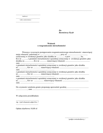 ................................................................ ............................................... /nadawca/ .............................................. / adres zamieszkania / ............................................. Do Burmistrza Pyzdr Wniosek o rozgraniczenie nieruchomości Wnoszę o wszczęcie postępowania rozgraniczeniowego nieruchomości stanowiącej moją własność, położonej w ......................................, przy ul. ....................................., oznaczonej w ewidencji gruntów jako działka nr ............... o pow. .................. ha, Kw nr .........., z gruntami nieruchomości sąsiedniej oznaczonej w ewidencji gruntów jako działka nr................., Kw nr ............. stanowiącej własność ............................................... zam. ................................................................, z gruntami nieruchomości sąsiedniej oznaczonej w ewidencji gruntów jako działka nr................., Kw nr .............. stanowiącej własność ........................................................ zam. ................................................................, z gruntami nieruchomości sąsiedniej oznaczonej w ewidencji gruntów jako działka nr................., Kw nr .............. stanowiącej własność ......................................................... zam. ................................................................, z gruntami nieruchomości sąsiedniej oznaczonej w ewidencji gruntów jako działka nr................., Kw nr .................. stanowiącej własność .................................................. zam. ................................................................ Do czynności ustalenia granic proponuję upoważnić geodetę .......................................... ......................, zam. ......................................................................................... . W załączeniu przedkładam: ............................................ /np. tytuł własności,odpis Kw, ? ........................................... Opłata skarbowa 10,00 zł ............................................. / podpis wnioskodawcy /