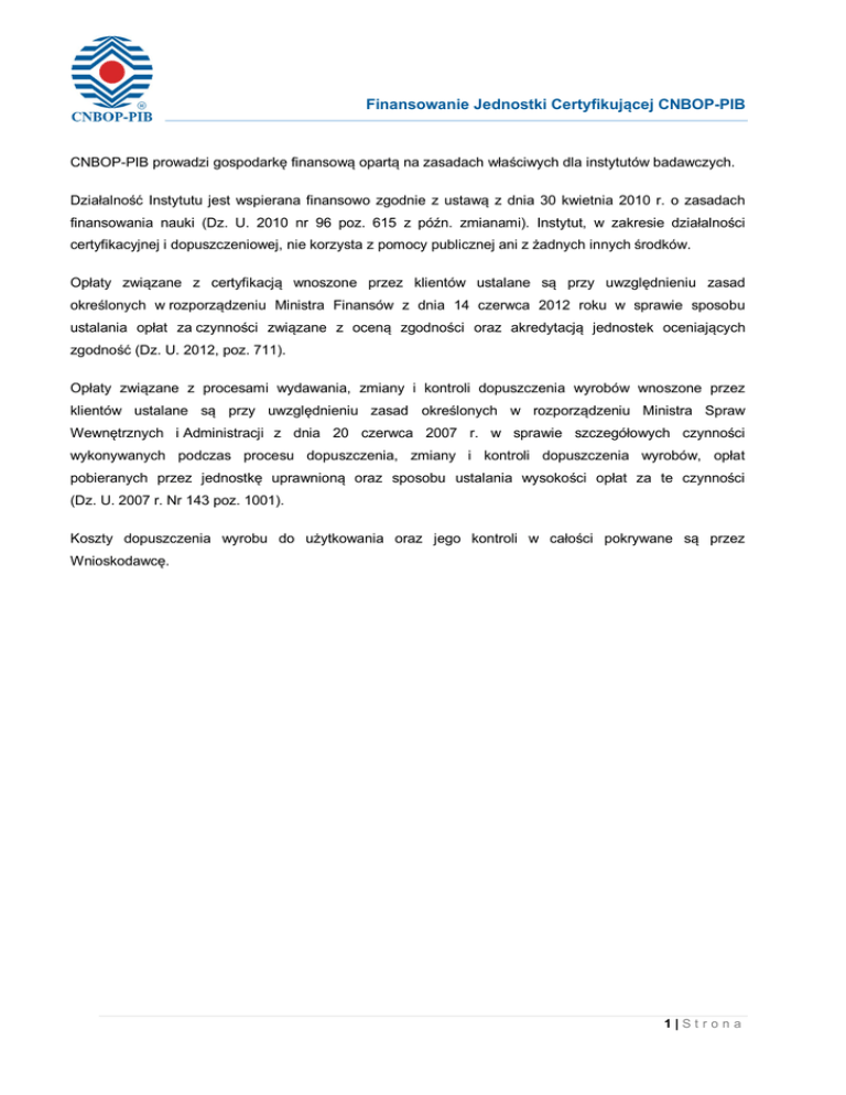 Finansowanie Jednostki Certyfikującej CNBOP-PIB CNBOP-PIB prowadzi gospodarkę finansową opartą na zasadach właściwych dla instytutów badawczych. Działalność Instytutu jest wspierana finansowo zgodnie z ustawą z dnia 30 kwietnia 2010 r. o zasadach finansowania nauki (Dz. U. 2010 nr 96 poz. 615 z późn. zmianami). Instytut, w zakresie działalności certyfikacyjnej i dopuszczeniowej, nie korzysta z pomocy publicznej ani z żadnych innych środków. Opłaty związane z certyfikacją wnoszone przez klientów ustalane są przy uwzględnieniu zasad określonych w rozporządzeniu Ministra Finansów z dnia 14 czerwca 2012 roku w sprawie sposobu ustalania opłat za czynności związane z oceną zgodności oraz akredytacją jednostek oceniających zgodność (Dz. U. 2012, poz. 711). Opłaty związane z procesami wydawania, zmiany i kontroli dopuszczenia wyrobów wnoszone przez klientów ustalane są przy uwzględnieniu zasad określonych w rozporządzeniu Ministra Spraw Wewnętrznych i Administracji z dnia 20 czerwca 2007 r. w sprawie szczegółowych czynności wykonywanych podczas procesu dopuszczenia, zmiany i kontroli dopuszczenia wyrobów, opłat pobieranych przez jednostkę uprawnioną oraz sposobu ustalania wysokości opłat za te czynności (Dz. U. 2007 r. Nr 143 poz. 1001). Koszty dopuszczenia wyrobu do użytkowania oraz jego kontroli w całości pokrywane są przez Wnioskodawcę. 1|Strona