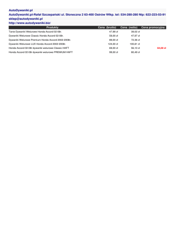 AutoDywaniki.pl AutoDywaniki.pl-Rafał Szczepański ul. Słoneczna 2 63-400 Ostrów Wlkp. tel: 534-280-280 Nip: 622-223-53-91 [email protected] http://www.autodywaniki.biz/ Produkty Cena (brutto) Cena (netto) Tanie Dywaniki Welurowe Honda Accord 02-08r. 47,99 zł 39,02 zł Dywaniki Welurowe Classic Honda Accord 02-08r. 59,00 zł 47,97 zł Dywaniki Welurowe Premium Honda Accord 2002-2008r. 89,00 zł 72,36 zł 124,00 zł 100,81 zł Honda Accord 02-08r dywaniki welurowe Classic HAFT 69,00 zł 56,10 zł Honda Accord 02-08r dywaniki welurowe PREMIUM HAFT 99,00 zł 80,49 zł Dywaniki Welurowe LUX Honda Accord 2002-2008r. Cena promocyjna 64,00 zł