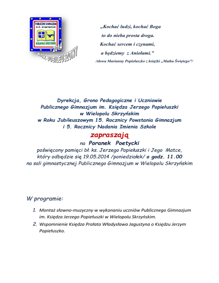 „Kochać ludzi, kochać Boga to do nieba prosta droga. Kochać sercem i czynami, a będziemy z Aniołami.” /słowa Marianny Popiełuszko z książki „Matka Świętego”/ Dyrekcja, Grono Pedagogiczne i Uczniowie Publicznego Gimnazjum im. Księdza Jerzego Popiełuszki w Wielopolu Skrzyńskim w Roku Jubileuszowym 15. Rocznicy Powstania Gimnazjum i 5. Rocznicy Nadania Imienia Szkole zapraszają na Poranek Poetycki poświęcony pamięci bł. ks. Jerzego Popiełuszki i Jego Matce, który odbędzie się 19.05.2014 /poniedziałek/ o godz. 11.00 na sali gimnastycznej Publicznego Gimnazjum w Wielopolu Skrzyńskim W programie: 1. Montaż słowno-muzyczny w wykonaniu uczniów Publicznego Gimnazjum im. Księdza Jerzego Popiełuszki w Wielopolu Skrzyńskim. 2. Wspomnienie Księdza Prałata Władysława Jagustyna o Księdzu Jerzym Popiełuszko.