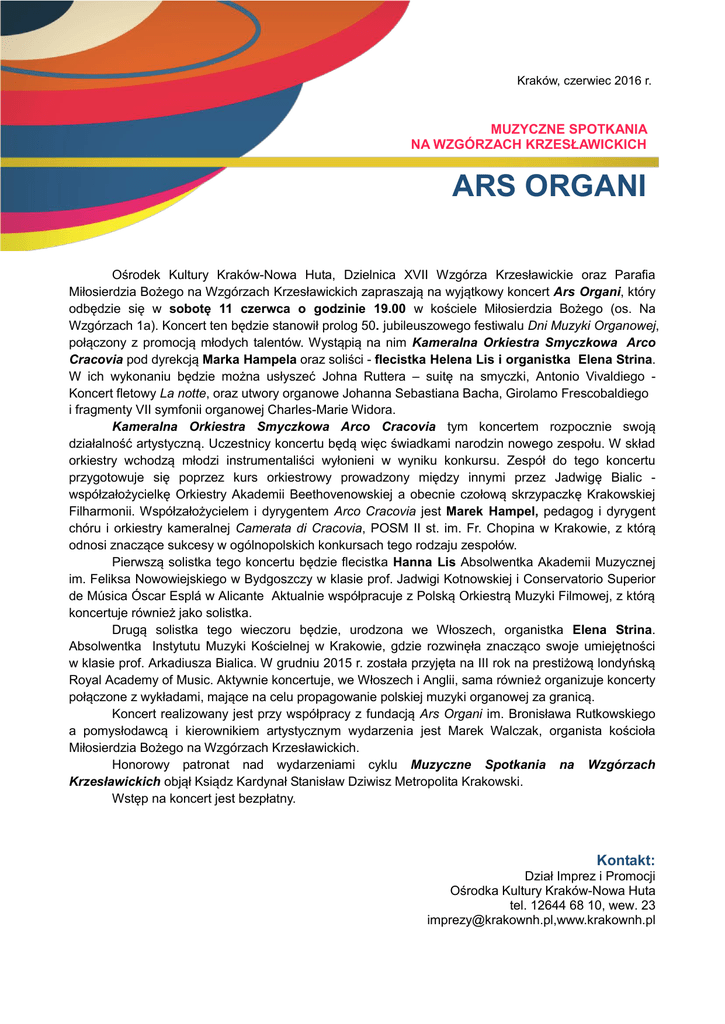 Kraków, czerwiec 2016 r. MUZYCZNE SPOTKANIA NA WZGÓRZACH KRZESŁAWICKICH ARS ORGANI Ośrodek Kultury Kraków-Nowa Huta, Dzielnica XVII Wzgórza Krzesławickie oraz Parafia Miłosierdzia Bożego na Wzgórzach Krzesławickich zapraszają na wyjątkowy koncert Ars Organi, który odbędzie się w sobotę 11 czerwca o godzinie 19.00 w kościele Miłosierdzia Bożego (os. Na Wzgórzach 1a). Koncert ten będzie stanowił prolog 50. jubileuszowego festiwalu Dni Muzyki Organowej, połączony z promocją młodych talentów. Wystąpią na nim Kameralna Orkiestra Smyczkowa Arco Cracovia pod dyrekcją Marka Hampela oraz soliści - flecistka Helena Lis i organistka Elena Strina. W ich wykonaniu będzie można usłyszeć Johna Ruttera – suitę na smyczki, Antonio Vivaldiego Koncert fletowy La notte, oraz utwory organowe Johanna Sebastiana Bacha, Girolamo Frescobaldiego i fragmenty VII symfonii organowej Charles-Marie Widora. Kameralna Orkiestra Smyczkowa Arco Cracovia tym koncertem rozpocznie swoją działalność artystyczną. Uczestnicy koncertu będą więc świadkami narodzin nowego zespołu. W skład orkiestry wchodzą młodzi instrumentaliści wyłonieni w wyniku konkursu. Zespół do tego koncertu przygotowuje się poprzez kurs orkiestrowy prowadzony między innymi przez Jadwigę Bialic współzałożycielkę Orkiestry Akademii Beethovenowskiej a obecnie czołową skrzypaczkę Krakowskiej Filharmonii. Współzałożycielem i dyrygentem Arco Cracovia jest Marek Hampel, pedagog i dyrygent chóru i orkiestry kameralnej Camerata di Cracovia, POSM II st. im. Fr. Chopina w Krakowie, z którą odnosi znaczące sukcesy w ogólnopolskich konkursach tego rodzaju zespołów. Pierwszą solistka tego koncertu będzie flecistka Hanna Lis Absolwentka Akademii Muzycznej im. Feliksa Nowowiejskiego w Bydgoszczy w klasie prof. Jadwigi Kotnowskiej i Conservatorio Superior de Música Óscar Esplá w Alicante Aktualnie współpracuje z Polską Orkiestrą Muzyki Filmowej, z którą koncertuje również jako solistka. Drugą solistka tego wieczoru będzie, urodzona we Włoszech, organistka Elena Strina. Absolwentka Instytutu Muzyki Kościelnej w Krakowie, gdzie rozwinęła znacząco swoje umiejętności w klasie prof. Arkadiusza Bialica. W grudniu 2015 r. została przyjęta na III rok na prestiżową londyńską Royal Academy of Music. Aktywnie koncertuje, we Włoszech i Anglii, sama również organizuje koncerty połączone z wykładami, mające na celu propagowanie polskiej muzyki organowej za granicą. Koncert realizowany jest przy współpracy z fundacją Ars Organi im. Bronisława Rutkowskiego a pomysłodawcą i kierownikiem artystycznym wydarzenia jest Marek Walczak, organista kościoła Miłosierdzia Bożego na Wzgórzach Krzesławickich. Honorowy patronat nad wydarzeniami cyklu Muzyczne Spotkania na Wzgórzach Krzesławickich objął Ksiądz Kardynał Stanisław Dziwisz Metropolita Krakowski. Wstęp na koncert jest bezpłatny. Kontakt: Dział Imprez i Promocji Ośrodka Kultury Kraków-Nowa Huta tel. 12644 68 10, wew. 23 [email protected],www.krakownh.pl