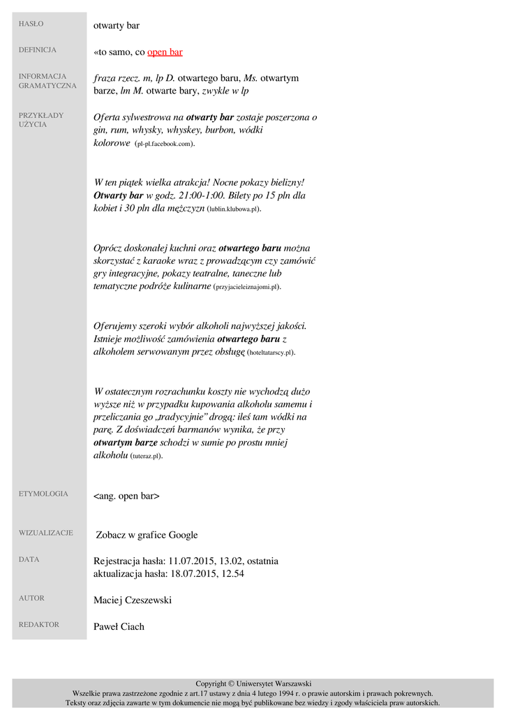HASŁO otwarty bar DEFINICJA «to samo, co open bar» INFORMACJA GRAMATYCZNA fraza rzecz. m, lp D. otwartego baru, Ms. otwartym barze, lm M. otwarte bary, zwykle w lp PRZYKŁADY UŻYCIA Oferta sylwestrowa na otwarty bar zostaje poszerzona o gin, rum, whysky, whyskey, burbon, wódki kolorowe (pl-pl.facebook.com). W ten piątek wielka atrakcja! Nocne pokazy bielizny! Otwarty bar w godz. 21:00-1:00. Bilety po 15 pln dla kobiet i 30 pln dla mężczyzn (lublin.klubowa.pl). Oprócz doskonałej kuchni oraz otwartego baru można skorzystać z karaoke wraz z prowadzącym czy zamówić gry integracyjne, pokazy teatralne, taneczne lub tematyczne podróże kulinarne (przyjacieleiznajomi.pl). Oferujemy szeroki wybór alkoholi najwyższej jakości. Istnieje możliwość zamówienia otwartego baru z alkoholem serwowanym przez obsługę (hoteltatarscy.pl). W ostatecznym rozrachunku koszty nie wychodzą dużo wyższe niż w przypadku kupowania alkoholu samemu i przeliczania go „tradycyjnie” drogą: ileś tam wódki na parę. Z doświadczeń barmanów wynika, że przy otwartym barze schodzi w sumie po prostu mniej alkoholu (tuteraz.pl). ETYMOLOGIA WIZUALIZACJE <ang. open bar> Zobacz w grafice Google DATA Rejestracja hasła: 11.07.2015, 13.02, ostatnia aktualizacja hasła: 18.07.2015, 12.54 AUTOR Maciej Czeszewski REDAKTOR Paweł Ciach Copyright © Uniwersytet Warszawski Wszelkie prawa zastrzeżone zgodnie z art.17 ustawy z dnia 4 lutego 1994 r. o prawie autorskim i prawach pokrewnych. Teksty oraz zdjęcia zawarte w tym dokumencie nie mogą być publikowane bez wiedzy i zgody właściciela praw autorskich. Powered by TCPDF (www.tcpdf.org)