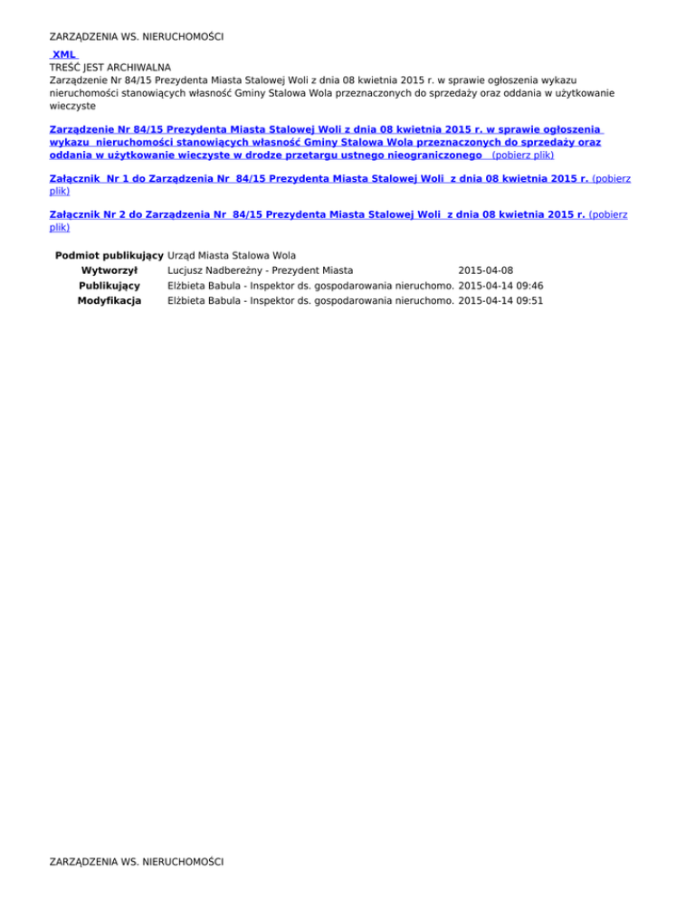 ZARZĄDZENIA WS. NIERUCHOMOŚCI XML TREŚĆ JEST ARCHIWALNA Zarządzenie Nr 84/15 Prezydenta Miasta Stalowej Woli z dnia 08 kwietnia 2015 r. w sprawie ogłoszenia wykazu nieruchomości stanowiących własność Gminy Stalowa Wola przeznaczonych do sprzedaży oraz oddania w użytkowanie wieczyste Zarządzenie Nr 84/15 Prezydenta Miasta Stalowej Woli z dnia 08 kwietnia 2015 r. w sprawie ogłoszenia wykazu nieruchomości stanowiących własność Gminy Stalowa Wola przeznaczonych do sprzedaży oraz oddania w użytkowanie wieczyste w drodze przetargu ustnego nieograniczonego (pobierz plik) Załącznik Nr 1 do Zarządzenia Nr 84/15 Prezydenta Miasta Stalowej Woli z dnia 08 kwietnia 2015 r. (pobierz plik) Załącznik Nr 2 do Zarządzenia Nr 84/15 Prezydenta Miasta Stalowej Woli z dnia 08 kwietnia 2015 r. (pobierz plik) Podmiot publikujący Urząd Miasta Stalowa Wola Wytworzył Lucjusz Nadbereżny - Prezydent Miasta Publikujący Elżbieta Babula - Inspektor ds. gospodarowania nieruchomo. 2015-04-14 09:46 Modyfikacja Elżbieta Babula - Inspektor ds. gospodarowania nieruchomo. 2015-04-14 09:51 ZARZĄDZENIA WS. NIERUCHOMOŚCI 2015-04-08