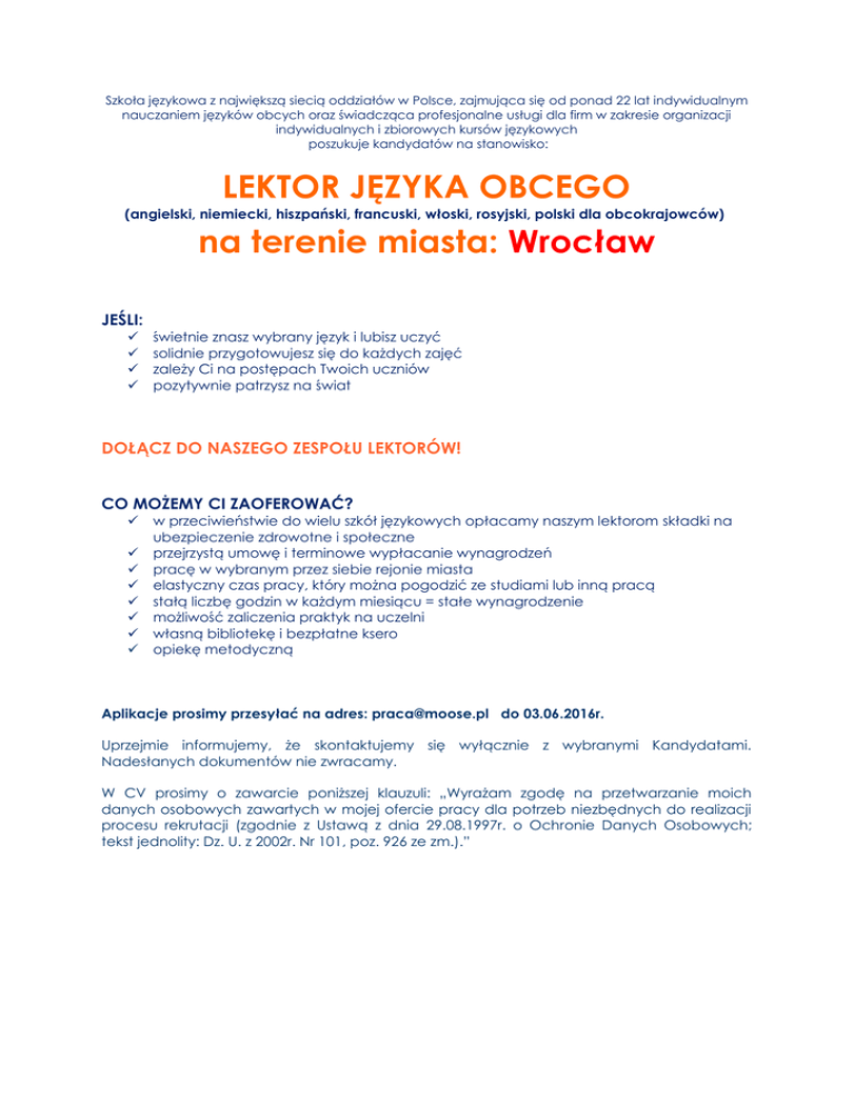 Szkoła językowa z największą siecią oddziałów w Polsce, zajmująca się od ponad 22 lat indywidualnym nauczaniem języków obcych oraz świadcząca profesjonalne usługi dla firm w zakresie organizacji indywidualnych i zbiorowych kursów językowych poszukuje kandydatów na stanowisko: LEKTOR JĘZYKA OBCEGO (angielski, niemiecki, hiszpański, francuski, włoski, rosyjski, polski dla obcokrajowców) na terenie miasta: Wrocław JEŚLI:     świetnie znasz wybrany język i lubisz uczyć solidnie przygotowujesz się do każdych zajęć zależy Ci na postępach Twoich uczniów pozytywnie patrzysz na świat DOŁĄCZ DO NASZEGO ZESPOŁU LEKTORÓW! CO MOŻEMY CI ZAOFEROWAĆ?         w przeciwieństwie do wielu szkół językowych opłacamy naszym lektorom składki na ubezpieczenie zdrowotne i społeczne przejrzystą umowę i terminowe wypłacanie wynagrodzeń pracę w wybranym przez siebie rejonie miasta elastyczny czas pracy, który można pogodzić ze studiami lub inną pracą stałą liczbę godzin w każdym miesiącu = stałe wynagrodzenie możliwość zaliczenia praktyk na uczelni własną bibliotekę i bezpłatne ksero opiekę metodyczną Aplikacje prosimy przesyłać na adres: [email protected] do 03.06.2016r. Uprzejmie informujemy, że skontaktujemy się wyłącznie z wybranymi Kandydatami. Nadesłanych dokumentów nie zwracamy. W CV prosimy o zawarcie poniższej klauzuli: „Wyrażam zgodę na przetwarzanie moich danych osobowych zawartych w mojej ofercie pracy dla potrzeb niezbędnych do realizacji procesu rekrutacji (zgodnie z Ustawą z dnia 29.08.1997r. o Ochronie Danych Osobowych; tekst jednolity: Dz. U. z 2002r. Nr 101, poz. 926 ze zm.).”