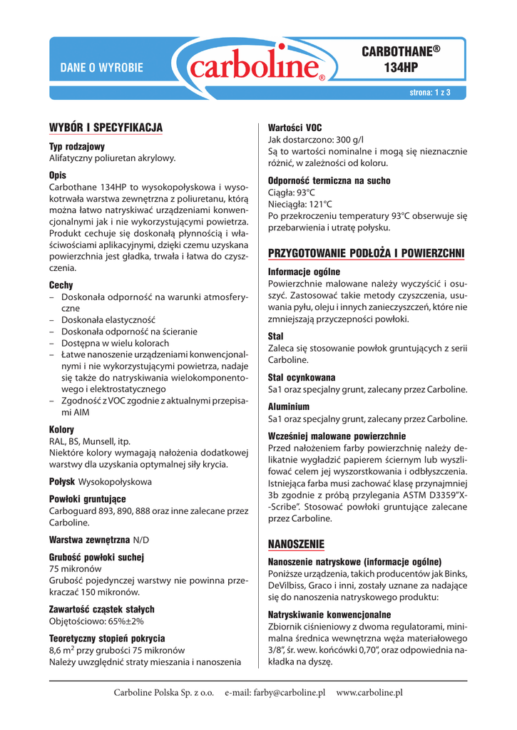 CARBOTHANE® 134HP strona: 1 z 3 WYBÓR I SPECYFIKACJA Wartości VOC Jak dostarczono: 300 g/l Są to wartości nominalne i mogą się nieznacznie różnić, w zależności od koloru. Typ rodzajowy Alifatyczny poliuretan akrylowy. Opis Carbothane 134HP to wysokopołyskowa i wysokotrwała warstwa zewnętrzna z poliuretanu, którą można łatwo natryskiwać urządzeniami konwencjonalnymi jak i nie wykorzystującymi powietrza. Produkt cechuje się doskonałą płynnością i właściwościami aplikacyjnymi, dzięki czemu uzyskana powierzchnia jest gładka, trwała i łatwa do czyszczenia. Cechy – Doskonała odporność na warunki atmosferyczne – Doskonała elastyczność – Doskonała odporność na ścieranie – Dostępna w wielu kolorach – Łatwe nanoszenie urządzeniami konwencjonalnymi i nie wykorzystującymi powietrza, nadaje się także do natryskiwania wielokomponentowego i elektrostatycznego – Zgodność z VOC zgodnie z aktualnymi przepisami AIM Kolory RAL, BS, Munsell, itp. Niektóre kolory wymagają nałożenia dodatkowej warstwy dla uzyskania optymalnej siły krycia. Połysk Wysokopołyskowa Powłoki gruntujące Carboguard 893, 890, 888 oraz inne zalecane przez Carboline. Odporność termiczna na sucho Ciągła: 93°C Nieciągła: 121°C Po przekroczeniu temperatury 93°C obserwuje się przebarwienia i utratę połysku. PRZYGOTOWANIE PODŁOŻA I POWIERZCHNI Informacje ogólne Powierzchnie malowane należy wyczyścić i osuszyć. Zastosować takie metody czyszczenia, usuwania pyłu, oleju i innych zanieczyszczeń, które nie zmniejszają przyczepności powłoki. Stal Zaleca się stosowanie powłok gruntujących z serii Carboline. Stal ocynkowana Sa1 oraz specjalny grunt, zalecany przez Carboline. Aluminium Sa1 oraz specjalny grunt, zalecany przez Carboline. Wcześniej malowane powierzchnie Przed nałożeniem farby powierzchnię należy delikatnie wygładzić papierem ściernym lub wyszlifować celem jej wyszorstkowania i odbłyszczenia. Istniejąca farba musi zachować klasę przynajmniej 3b zgodnie z próbą przylegania ASTM D3359”X-Scribe”. Stosować powłoki gruntujące zalecane przez Carboline. Warstwa zewnętrzna N/D NANOSZENIE Grubość powłoki suchej 75 mikronów Grubość pojedynczej warstwy nie powinna przekraczać 150 mikronów. Nanoszenie natryskowe (informacje ogólne) Poniższe urządzenia, takich producentów jak Binks, DeVilbiss, Graco i inni, zostały uznane za nadające się do nanoszenia natryskowego produktu: Zawartość cząstek stałych Objętościowo: 65%±2% Teoretyczny stopień pokrycia 8,6 m2 przy grubości 75 mikronów Należy uwzględnić straty mieszania i nanoszenia Carboline Polska Sp. z o.o. Natryskiwanie konwencjonalne Zbiornik ciśnieniowy z dwoma regulatorami, minimalna średnica wewnętrzna węża materiałowego 3/8”, śr. wew. końcówki 0,70”, oraz odpowiednia nakładka na dyszę. e-mail: [email protected] www.carboline.pl CARBOTHANE® 134HP strona: 2 z 3 Natrysk bez użycia powietrza Proporcja pompowania: 30:1 (min.) Wydajność (gal/min.): 3.0 (min.) Wąż materiałowy: śr.wew. 3/8” I.D. (min.) Rozmiar końcówki: . 015–017” Ciśnienie: 148–162 bar Rozmiar filtra: siatkowy 60 Zaleca się stosowanie opakowań teflonowych, które można uzyskać od producentów pomp. Pędzel i wałek (informacje ogólne) Uzyskanie wymaganego wyglądu, zalecanej grubości suchej powłoki oraz właściwego krycia może wymagać nałożenia kilku warstw. Należy unikać ponownego nakładania pędzlem lub wałkiem. Dla uzyskania najlepszych wyników należy nawiązać do poprzedniej warstwy w ciągu 10 minut w temperaturze 24°C. Pędzel Zalecany tylko do retuszu. Najlepiej używać pędzla z włosia naturalnego o średniej twardości. Wałek Najlepiej używać wałka moherowego z krótkim włosiem i rdzeniem fenolowym. MIESZANIE I ROZCIEŃCZANIE Mieszanie Najpierw oddzielnie wymieszać mechanicznie Część A, a następnie połączyć z Częścią B i wymieszać razem mechanicznie. NIE WOLNO MIESZAĆ ZESTAWÓW NIEKOMPLETNYCH. Proporcje 4:1 (A do B) Rozcieńczanie Natrysk: do 15% z rozcieńczalnikiem 25. Wałek: do 10% z rozcieńczalnikiem 215. Stosowanie rozcieńczalników innych niż zalecane przez Carboline może skutkować pogorszeniem wydajności produktu oraz unieważnić gwarancję na produkt, czy to wyraźną czy domyślaną. Dopuszczalny okres użytkowania 4 godziny przy 24°C, krótsza w wyższych temperaturach. Dopuszczalny okres użytkowania kończy się wtedy, gdy lepkość powłoki staje się zbyt duża. Carboline Polska Sp. z o.o. Zanieczyszczenie wilgocią skraca dopuszczalny okres użytkowania i powoduje żelifikację. CZYSZCZENIE I BEZPIECZEŃSTWO Czyszczenie Do czyszczenia należy użyć rozcieńczalnika 2, rozcieńczalnika lub acetonu. W przypadku rozlania, produkt należy zebrać i zutylizować zgodnie z odnośnymi przepisami lokalnymi. Bezpieczeństwo Należy przeczytać i stosować się do wszystkich zaleceń zawartych w niniejszej Karcie Technologicznej Wyrobu oraz Karcie Charakterystyki Substancji dla tego produktu. Należy zastosować zwyczajne środki ostrożności. Osoby nadwrażliwe na składniki substancji powinny założyć odzież ochronną i rękawice ochronne, a także nałożyć krem ochronny na twarz, ręce i inne odsłonięte części ciała. Wentylacja Podczas nanoszenia farby w pomieszczeniach zamkniętych należy zapewnić wydajny obieg powietrza, zarówno w czasie nanoszenia jak i w czasie schnięcia farby. System wentylacyjny powinien umożliwiać zapobieganie stężeniom oparów rozpuszczalnika przekraczającym wartość dolnej granicę wybuchowości dla używanego rozpuszczalnika. Zalecamy, aby użytkownik zbadał i nadzorował poziomy ekspozycji, celem zapewnienia bezpieczeństwa personelu. W przypadku wątpliwości lub niemożności nadzorowania poziomów ekspozycji, należy stosować maski oddechowe zaaprobowane przez MSHA/NIOSH. WARUNKI NANOSZENIA Warunek Materiał Powierzchnia TemperaWilgo
