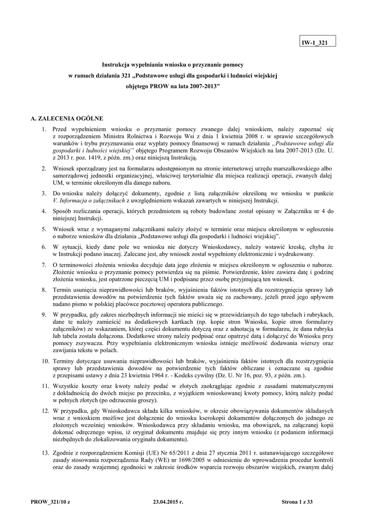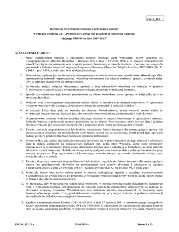 IW-1_321 Instrukcja wypełniania wniosku o przyznanie pomocy w ramach działania 321 „Podstawowe usługi dla gospodarki i ludności wiejskiej objętego PROW na lata 2007-2013” A. ZALECENIA OGÓLNE 1. Przed wypełnieniem wniosku o przyznanie pomocy zwanego dalej wnioskiem, należy zapoznać się z rozporządzeniem Ministra Rolnictwa i Rozwoju Wsi z dnia 1 kwietnia 2008 r. w sprawie szczegółowych warunków i trybu przyznawania oraz wypłaty pomocy finansowej w ramach działania „Podstawowe usługi dla gospodarki i ludności wiejskiej” objętego Programem Rozwoju Obszarów Wiejskich na lata 2007-2013 (Dz. U. z 2013 r. poz. 1419, z późn. zm.) oraz niniejszą Instrukcją. 2. Wniosek sporządzany jest na formularzu udostępnionym na stronie internetowej urzędu marszałkowskiego albo samorządowej jednostki organizacyjnej, właściwej terytorialnie dla miejsca realizacji operacji, zwanych dalej UM, w terminie określonym dla danego naboru. 3. Do wniosku należy dołączyć dokumenty, zgodnie z listą załączników określoną we wniosku w punkcie V. Informacja o załącznikach z uwzględnieniem wskazań zawartych w niniejszej Instrukcji. 4. Sposób rozliczania operacji, których przedmiotem są roboty budowlane został opisany w Załączniku nr 4 do niniejszej Instrukcji. 5. Wniosek wraz z wymaganymi załącznikami należy złożyć w terminie oraz miejscu określonym w ogłoszeniu o naborze wniosków dla działania „Podstawowe usługi dla gospodarki i ludności wiejskiej”. 6. W sytuacji, kiedy dane pole we wniosku nie dotyczy Wnioskodawcy, należy wstawić kreskę, chyba że w Instrukcji podano inaczej. Zalecane jest, aby wniosek został wypełniony elektronicznie i wydrukowany. 7. O terminowości złożenia wniosku decyduje data jego złożenia w miejscu określonym w ogłoszeniu o naborze. Złożenie wniosku o przyznanie pomocy potwierdza się na piśmie. Potwierdzenie, które zawiera datę i godzinę złożenia wniosku, jest opatrzone pieczęcią UM i podpisane przez osobę przyjmującą ten wniosek. 8. Termin usunięcia nieprawidłowości lub braków, wyjaśnienia faktów istotnych dla rozstrzygnięcia sprawy lub przedstawienia dowodów na potwierdzenie tych faktów uważa się za zachowany, jeżeli przed jego upływem nadano pismo w polskiej placówce pocztowej operatora publicznego. 9. W przypadku, gdy zakres niezbędnych informacji nie mieści się w przewidzianych do tego tabelach i rubrykach, dane te należy zamieścić na dodatkowych kartkach (np. kopie stron Wniosku, kopie stron formularzy załączników) ze wskazaniem, której części dokumentu dotyczą oraz z adnotacją w formularzu, że dana rubryka lub tabela została dołączona. Dodatkowe strony należy podpisać oraz opatrzyć datą i dołączyć do Wniosku przy pomocy zszywacza. Przy wypełnianiu elektronicznym wniosku istnieje możliwość dodawania wierszy oraz zawijania tekstu w polach. 10. Terminy dotyczące usuwania nieprawidłowości lub braków, wyjaśnienia faktów istotnych dla rozstrzygnięcia sprawy lub przedstawienia dowodów na potwierdzenie tych faktów obliczane i oznaczane są zgodnie z przepisami ustawy z dnia 23 kwietnia 1964 r. - Kodeks cywilny (Dz. U. Nr 16, poz. 93, z późn. zm.). 11. Wszystkie koszty oraz kwoty należy podać w złotych zaokrąglając zgodnie z zasadami matematycznymi z dokładnością do dwóch miejsc po przecinku, z wyjątkiem wnioskowanej kwoty pomocy, którą należy podać w pełnych złotych (po odrzuceniu groszy). 12. W przypadku, gdy Wnioskodawca składa kilka wniosków, w okresie obowiązywania dokumentów składanych wraz z wnioskiem możliwe jest dołączenie do wniosku kserokopii dokumentów dołączonych do jednego ze złożonych wcześniej wniosków. Wnioskodawca przy składaniu wniosku, ma obowiązek, na załączanej kopii dokonać odręcznego wpisu, iż oryginał dokumentu znajduje się przy innym wniosku (z podaniem informacji niezbędnych do zlokalizowania oryginału dokumentu). 13. Zgodnie z rozporządzeniem Komisji (UE) Nr 65/2011 z dnia 27 stycznia 2011 r. ustanawiającego szczegółowe zasady stosowania rozporządzenia Rady (WE) nr 1698/2005 w odniesieniu do wprowadzenia procedur kontroli oraz do zasady wzajemnej zgodności w zakresie środków wsparcia rozwoju obszarów wiejskich, zwanym dalej PROW_321/10 z 23.04.2015 r. Strona 1 z 33 Rozporządzeniem Komisji (UE) nr 65/2011) Wnioskodawca w dowolnym momencie po złożeniu wniosku o przyznanie pomocy może zwrócić się z pisemną prośbą o wycofaniu wniosku w całości lub w części. Jeżeli wnioskodawca został poinformowany o nieprawidłowościach w dokumentach lub o zamiarze przeprowadzenia kontroli na miejscu, w wyniku której następnie wykryto nieprawidłowości, wycofanie nie jest dozwolone w odniesieniu do części, których te nieprawidłowości dotyczą. Wycofanie wniosku w całości nie wywołuje żadnych skutków prawnych, powstaje więc sytuacja jakby wnioskodawca tego wniosku nie złożył. Natomiast wycofanie wniosku w części lub innej deklaracji (załącznika) sprawia, że wnioskodawca znajduje się w sytuacji sprzed złożenia odnośnych dokumentów lub ich części. 14. Wnioskodawca realizujący operację dotyczącą budowy mikroinstalacji prosumenckich wykorzystujących odnawialne źródła energii, służących do wytwarzania energii, w szczególności energii elektrycznej lub cieplnej, zwanych dalej „mikroinstalacjami prosumenckimi” może skorzystać z dofinansowania do wysokości 200 000 EUR (pomoc ma charakter pomocy de minimis), W związku z tym, jeżeli w wyniku przeprowadzonego postępowania o udzielenie zamówienia publicznego koszty operacji obniżyły się, a Wnioskodawca jest przygotowany finansowo i organizacyjnie do zrealizowania szerszego zakresu operacji niż objęty ogłoszeniem o zamówieniu publicznym, wówczas korzystając z przepisów art. 67 ust. 1 pkt 6 ustawy z dnia 29 stycznia 2004 r. Prawo zamówień publicznych (Dz. U. z 2013 r. poz. 907z p