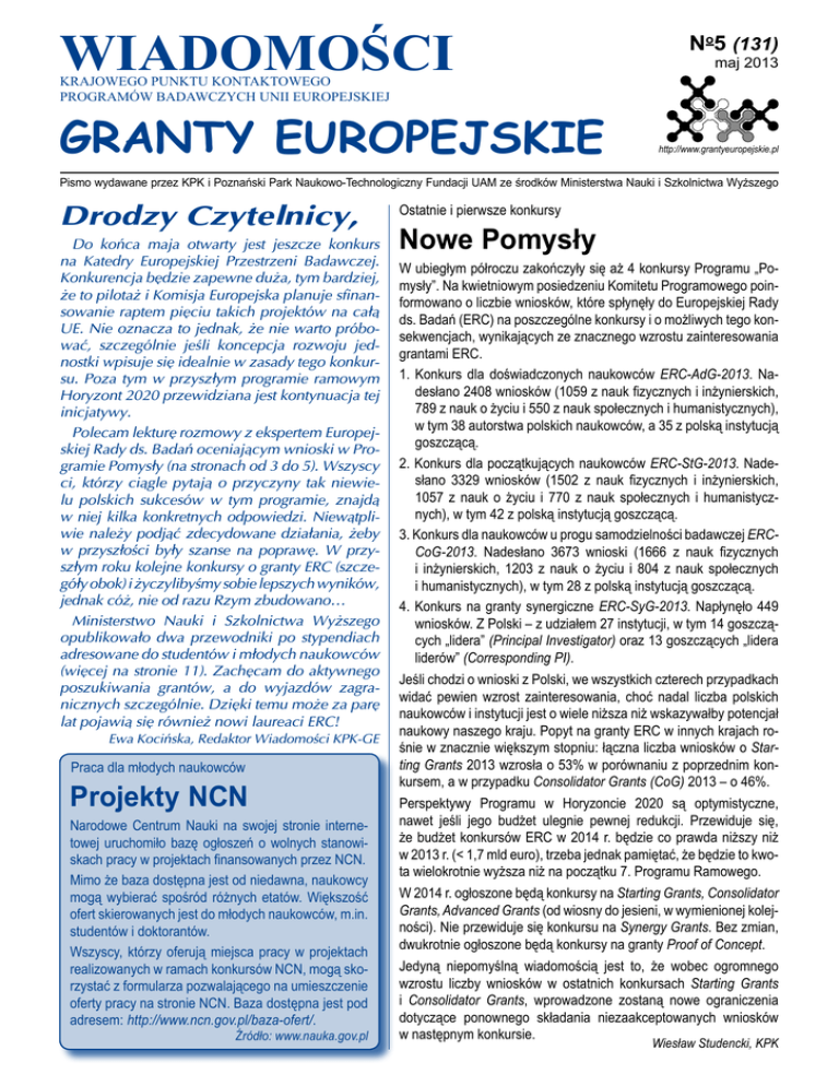 WIADOMOŚCI No5 (131) maj 2013 KRAJOWEGO PUNKTU KONTAKTOWEGO PROGRAMÓW BADAWCZYCH UNII EUROPEJSKIEJ GRANTY EUROPEJSKIE http://www.grantyeuropejskie.pl Pismo wydawane przez KPK i Poznański Park Naukowo-Technologiczny Fundacji UAM ze środków Ministerstwa Nauki i Szkolnictwa Wyższego Drodzy Czytelnicy, Do końca maja otwarty jest jeszcze konkurs na Katedry Europejskiej Przestrzeni Badawczej. Konkurencja będzie zapewne duża, tym bardziej, że to pilotaż i Komisja Europejska planuje sfinansowanie raptem pięciu takich projektów na całą UE. Nie oznacza to jednak, że nie warto próbować, szczególnie jeśli koncepcja rozwoju jednostki wpisuje się idealnie w zasady tego konkursu. Poza tym w przyszłym programie ramowym Horyzont 2020 przewidziana jest kontynuacja tej inicjatywy. Polecam lekturę rozmowy z ekspertem Europejskiej Rady ds. Badań oceniającym wnioski w Programie Pomysły (na stronach od 3 do 5). Wszyscy ci, którzy ciągle pytają o przyczyny tak niewielu polskich sukcesów w tym programie, znajdą w niej kilka konkretnych odpowiedzi. Niewątpliwie należy podjąć zdecydowane działania, żeby w przyszłości były szanse na poprawę. W przyszłym roku kolejne konkursy o granty ERC (szczegóły obok) i życzylibyśmy sobie lepszych wyników, jednak cóż, nie od razu Rzym zbudowano… Ministerstwo Nauki i Szkolnictwa Wyższego opublikowało dwa przewodniki po stypendiach adresowane do studentów i młodych naukowców (więcej na stronie 11). Zachęcam do aktywnego poszukiwania grantów, a do wyjazdów zagranicznych szczególnie. Dzięki temu może za parę lat pojawią się również nowi laureaci ERC! Ewa Kocińska, Redaktor Wiadomości KPK-GE Praca dla młodych naukowców Projekty NCN Narodowe Centrum Nauki na swojej stronie internetowej uruchomiło bazę ogłoszeń o wolnych stanowiskach pracy w projektach finansowanych przez NCN. Mimo że baza dostępna jest od niedawna, naukowcy mogą wybierać spośród różnych etatów. Większość ofert skierowanych jest do młodych naukowców, m.in. studentów i doktorantów. Wszyscy, którzy oferują miejsca pracy w projektach realizowanych w ramach konkursów NCN, mogą skorzystać z formularza pozwalającego na umieszczenie oferty pracy na stronie NCN. Baza dostępna jest pod adresem: http://www.ncn.gov.pl/baza-ofert/. Źródło: www.nauka.gov.pl Ostatnie i pierwsze konkursy Nowe Pomysły W ubiegłym półroczu zakończyły się aż 4 konkursy Programu „Pomysły”. Na kwietniowym posiedzeniu Komitetu Programowego poinformowano o liczbie wniosków, które spłynęły do Europejskiej Rady ds. Badań (ERC) na poszczególne konkursy i o możliwych tego konsekwencjach, wynikających ze znacznego wzrostu zainteresowania grantami ERC. 1. Konkurs dla doświadczonych naukowców ERC-AdG-2013. Nadesłano 2408 wniosków (1059 z nauk fizycznych i inżynierskich, 789 z nauk o życiu i 550 z nauk społecznych i humanistycznych), w tym 38 autorstwa polskich naukowców, a 35 z polską instytucją goszczącą. 2. Konkurs dla początkujących naukowców ERC-StG-2013. Nadesłano 3329 wniosków (1502 z nauk fizycznych i inżynierskich, 1057 z nauk o życiu i 770 z nauk społecznych i humanistycznych), w tym 42 z polską instytucją goszczącą. 3. Konkurs dla naukowców u progu samodzielności badawczej ERCCoG-2013. Nadesłano 3673 wnioski (1666 z nauk fizycznych i inżynierskich, 1203 z nauk o życiu i 804 z nauk społecznych i humanistycznych), w tym 28 z polską instytucją goszczącą. 4. Konkurs na granty synergiczne ERC-SyG-2013. Napłynęło 449 wniosków. Z Polski – z udziałem 27 instytucji, w tym 14 goszczących „lidera” (Principal Investigator) oraz 13 goszczących „lidera liderów” (Corresponding PI). Jeśli chodzi o wnioski z Polski, we wszystkich czterech przypadkach widać pewien wzrost zainteresowania, choć nadal liczba polskich naukowców i instytucji jest o wiele niższa niż wskazywałby potencjał naukowy naszego kraju. Popyt na granty ERC w innych krajach rośnie w znacznie większym stopniu: łączna liczba wniosków o Starting Grants 2013 wzrosła o 53% w porównaniu z poprzednim konkursem, a w przypadku Consolidator Grants (CoG) 2013 – o 46%. Perspektywy Programu w Horyzoncie 2020 są optymistyczne, nawet jeśli jego budżet ulegnie pewnej redukcji. Przewiduje się, że budżet konkursów ERC w 2014 r. będzie co prawda niższy niż w 2013 r. (< 1,7 mld euro), trzeba jednak pamiętać, że będzie to kwota wielokrotnie wyższa niż na początku 7. Programu Ramowego. W 2014 r. ogłoszone będą konkursy na Starting Grants, Consolidator Grants, Advanced Grants (od wiosny do jesieni, w wymienionej kolejności). Nie przewiduje się konkursu na Synergy Grants. Bez zmian, dwukrotnie ogłoszone będą konkursy na granty Proof of Concept. Jedyną niepomyślną wiadomością jest to, że wobec ogromnego wzrostu liczby wniosków w ostatnich konkursach Starting Grants i Consolidator Grants, wprowadzone zostaną nowe ograniczenia dotyczące ponownego składania niezaakceptowanych wniosków w następnym konkursie. Wiesław Studencki, KPK GRANTY EUROPEJSKIE No5 (131) maj 2013 SEVENTH FRAMEWORK PROGRAMME ADRESY SIECI KPK Krajowy Punkt Kontaktowy IPPT PAN, ul. Krzywickiego 34, 02-078 Warszawa telefon: (22) 828 74 83, faks: (22) 828 53 70, http://www.kpk.gov.pl Dyrektor KPK w Polsce: Andrzej Siemaszko, tel.: 664 032 122 e-mail: [email protected] Zastępcy Dyrektora: Zygmunt Krasiński, tel.: 509 278 758 e-mail: [email protected] Anna Pytko, tel.: 664 032 121 e-mail: [email protected] Anna Wiśniewska, tel.: 664 032 124 e-mail: [email protected] Współpraca „Cooperation” Zdrowie Ewa Szkiłądź, tel.: 500 207 844 e-mail: [email protected] Żywność, rolnictwo, biotechnologia Bożena Podlaska, tel.: 508 101 009 e-mail: [email protected] Technologie informacyjne i komunikacyjne Andrzej Galik, tel. 668 935 257 Bezpieczeństwo Renata Rycerz tel.: 508 101 124 e-mail: [email protected] Przestrzeń kosmiczna Piotr Świer