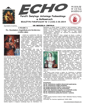 ykw Parafii Świętego Antoniego Padewskiego w Gołkowicach BIULETYN PARAFIALNY Nr 3 (122) 2.03.2014 Egzemplarz bezpłatny VIII NIEDZIELA ZWYKŁA 4 MARCA Św. Kazimierz Jagiellończyk Królewicz (1458-1484) Urodził się 3 października 1458 roku w Krakowie. Był jednym z trzynaściorga dzieci króla Kazimierza III Jagiellończyka i królowej ElŜbiety Rakuszanki, zwanej "matką królów". Para królewska była bardzo poboŜna - codziennie słuchała Mszy Świętej, pielgrzymowała do Częstochowy, ufundowała liczne kościoły i klasztory. Mały ksiąŜę został ochrzczony w drugą niedzielę po Wszystkich Świętych. Do dziewiątego roku Ŝycia św. Kazimierza wychowywała matka, w 1467 roku jego nauczycielem został kanonik krakowski Jan Długosz, który wraz z królewskimi synami przebywał na zamku w Starym Sączu. W czasie gdy król Kazimierz III przebywał w Wilnie, królewski nauczyciel zabierał swoich wychowanków do zamku w Miednikach, leŜącego niecałe 4km od Wilna. W 1471 roku stany węgierskie wysłały poselstwo do króla polskiego, aby im królewicza Kazimierza na króla posłał, zagraŜając, Ŝe jeśli tego nie uczyni, skierują swe poselstwo do Turków. Królewicz wyruszył na Węgry z 12 000 zbrojnych w październiku tego samego roku, odprowadzany przez króla i panów polskich. Okazało się, Ŝe Maciej Korwin przeciągnął na swoją stronę znaczną część panów węgierskich i rozłoŜył się obozem niedaleko Nitry. Wskutek wstawiennictwa papieŜa Sykstusa IV, który pragnął zgody na Węgrzech, św. Kazimierz na rozkaz ojca wrócił do kraju i zamieszkał w Dobczycach, gdzie do grona nauczycieli młodego królewicza dołączył Kallimach. Dnia 5 lipca 1472 roku wraz z Kazimierzem III udał się do Krakowa na spotkanie z legatem papieskim Marco Borbo, do którego wygłosił mowę powitalną w języku łacińskim, a jego mądrość i skromność wywarła na posłańcu wielkie wraŜenie. W tym samym roku razem z ojcem udał się na pielgrzymkę do Częstochowy, gdzie dom królewski przystąpił do konfraterni paulińskiej. Królewicz od dzieciństwa odznaczał się nadzwyczajną poboŜnością, spędzając wiele godzin na modlitwie. ZłoŜył ślub czystości, umartwiał swe ciało postami, noszeniem włosiennicy i spaniem na gołej ziemi. śywił szczególne naboŜeństwo do Najświętszego Sakramentu i Matki BoŜej. Jeśli w nocy zastawał kościół zamknięty, modlił się przed jego drzwiami. Zmarł w niedzielę przed wschodem słońca, 4 marca 1484 roku w Grodnie, prawdopodobnie na gruźlicę. Został pochowany w grobie pod kaplicą Bogurodzicy w katedrze wileńskiej, tam gdzie za Ŝycia najczęściej się modlił. Kiedy w 1604 roku otwarto trumnę znaleziono nienaruszone ciało, z arkuszem, na którym spisano ulubiony hymn św. Kazimierza "Omni die dic Mariae" (Duszo moja, rzecz to twoja, co dzień Maryję sławić - tłum. St.Grochowski). W 1623 roku przeniesiono doczesne szczątki królewicza do kaplicy Gasztołdowej, stąd 14 sierpnia 1636 roku wniesiono je do kaplicy zbudowanej przez Zygmunta III Wazę i Władysława IV. Dwukrotnie stamtąd były wywoŜone w obawie przed nieprzyjacielem: w 1659 roku, wróciły do kaplicy i przed wkroczeniem wojsk Karola XII na Litwę w 1702 roku, zostały przewiezione w tajemnicy na Jasną Górę. Powróciły rok później. Sowieci w 1953 roku przekształcili katedrę najpierw w magazyn, wysadzając figury św. Stanisława i św. Kazimierza ze szczytu fasady, a później w salę koncertową i galerię obrazów. Srebrny sarkofag z relikwiami św. Kazimierza przeniesiono do kościoła p.w. św. Piotra i Pawła na Anatokolu. NaboŜeństwa w katedrze zaczęto ponownie odprawiać w 1985 roku, w 1989 została rekonsekrowana i odnowiona. Św. Kazimierz do katedralnej kaplicy powrócił dopiero w 1991 roku. W 1518 roku Zygmunt I Stary wystąpił do Rzymu z prośbą o kanonizację brata. Wysłano legata papieskiego Zachariasza Ferreri, aby zbadał kult. W 1521 roku papieŜ Leon X kanonizował św. Kazimierza, wysyłając z bullą kanonizacyjną biskupa Erazma Ciołka. Niestety biskup zmarł w drodze, a wszystkie dokumenty zaginęły. Jako, Ŝe nie tylko dla papiestwa nastały bardzo burzliwe czasy, dopiero w 1602 roku papieŜ Klemens VIII wydał nową bullę na postawie dokumentów z watykańskiego archiwum, dwa lata później miała miejsce uroczysta kanonizacja w katedrze wileńskiej. Jest patronem Polski, Litwy, metropolii wileńskiej, grodzieńskiej, białostockiej i krakowskiej; młodzieŜy, Radomia (od 1983r.), poznańskiej Śródki, Palermo, belgijskiej Sodalicji Mariańskiej, litewskiego harcerstwa. Przedstawiany jako młodzieniec w stroju ksiąŜęcym, czasami z Matką BoŜą Ostrobramską. Jego atrybutami są: krzyŜ, lilia, czwórdzielna mitra wielkoksiąŜęca, róŜaniec, zwój z widocznym tekstem hymnu "Omni die dic Mariae", herb Jagiellonów. W Wilnie w dzień św. Kazimierza od czterystu lat urządzany jest jarmark odpustowy tzw. Kaziuki. Z inicjatywy mieszkańców Wilna i ich potomków podobne jarmarki urządzane są w Gdańsku, Szczecinie i Poznaniu. Zaczynają się Mszą Świętą, potem przez ulice miast idą barwne korowody królewskie. Litewskie przysmaki moŜna nabyć na kaziukowych kiermaszach. W 1960 roku Kawalerowie Maltańscy wybrali św. Kazimierza na swojego patrona. Na ołtarzu przed trumną w kaplicy św. Kazimierza w wileńskiej katedrze znajdował się mały obrazek pochodzący z około 1520 roku, przedstawiający Świętego z trzema rękami. Legenda mówi, Ŝe ręka zamalowywana kilkakrotnie przez malarza, za kaŜdym razem wyłaniała się spod farby, co uznano za znak BoŜy i pozostawiono w takim stanie. W 1958 roku Poczta Watykańska wyemitowała znaczki ze św. Kazimierzem, w pięćsetną rocznicę śmierci. Przysłowia: Na św. Kazimierza wyjdzie skowronek spod perza. Na św. Kazimierza czajka przybieŜa. Na święty Kazimierz dzień z nocą zmierz. Na święty Kazimierz juŜ nie zmarz