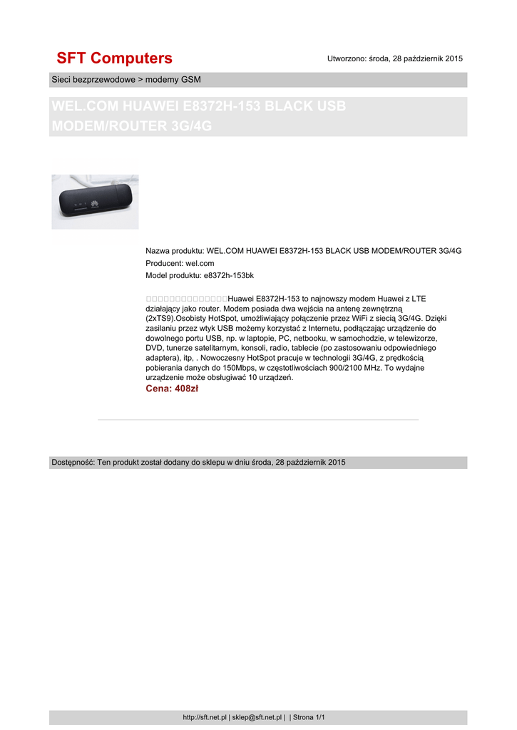SFT Computers Utworzono: środa, 28 październik 2015 Sieci bezprzewodowe > modemy GSM WEL.COM HUAWEI E8372H-153 BLACK USB MODEM/ROUTER 3G/4G Nazwa produktu: WEL.COM HUAWEI E8372H-153 BLACK USB MODEM/ROUTER 3G/4G Producent: wel.com Model produktu: e8372h-153bk Huawei E8372H-153 to najnowszy modem Huawei z LTE działający jako router. Modem posiada dwa wejścia na antenę zewnętrzną (2xTS9).Osobisty HotSpot, umożliwiający połączenie przez WiFi z siecią 3G/4G. Dzięki zasilaniu przez wtyk USB możemy korzystać z Internetu, podłączając urządzenie do dowolnego portu USB, np. w laptopie, PC, netbooku, w samochodzie, w telewizorze, DVD, tunerze satelitarnym, konsoli, radio, tablecie (po zastosowaniu odpowiedniego adaptera), itp, . Nowoczesny HotSpot pracuje w technologii 3G/4G, z prędkością pobierania danych do 150Mbps, w częstotliwościach 900/2100 MHz. To wydajne urządzenie może obsługiwać 10 urządzeń. Cena: 408zł Dostępność: Ten produkt został dodany do sklepu w dniu środa, 28 październik 2015 http://sft.net.pl | [email protected] | | Strona 1/1