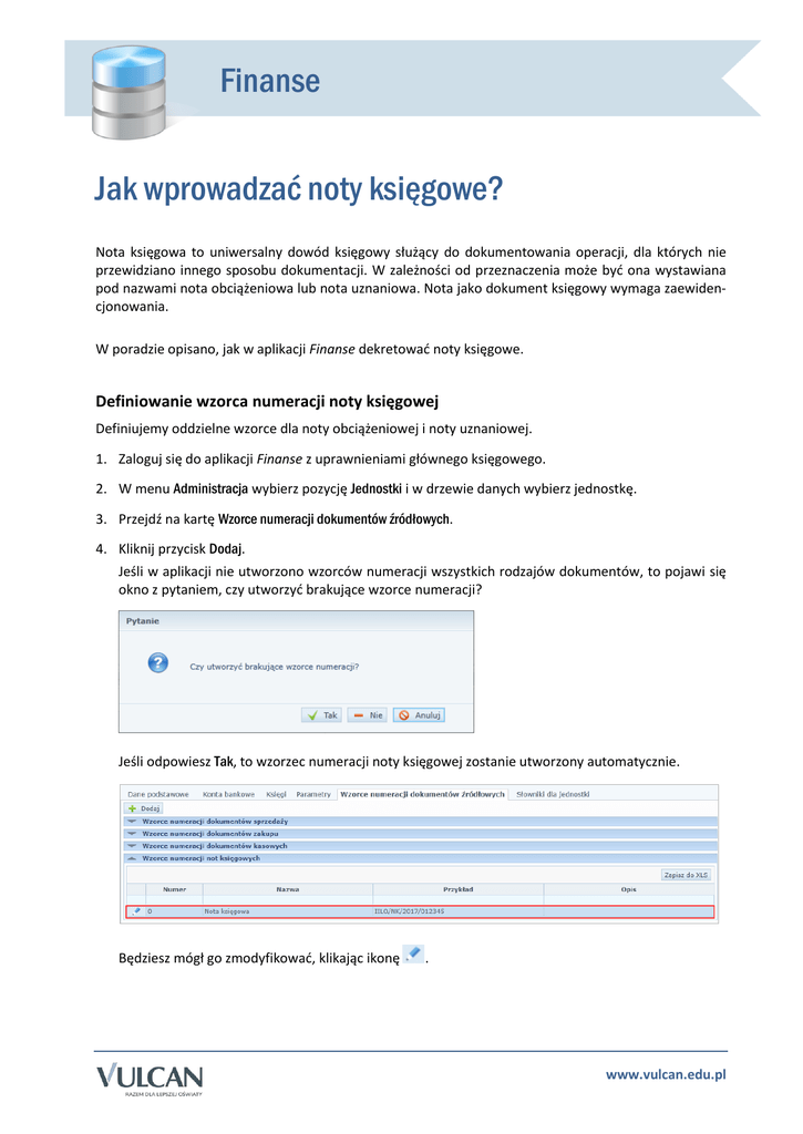 Finanse Jak wprowadzać noty księgowe? Nota księgowa to uniwersalny dowód księgowy służący do dokumentowania operacji, dla których nie przewidziano innego sposobu dokumentacji. W zależności od przeznaczenia może być ona wystawiana pod nazwami nota obciążeniowa lub nota uznaniowa. Nota jako dokument księgowy wymaga zaewidencjonowania. W poradzie opisano, jak w aplikacji Finanse dekretować noty księgowe. Definiowanie wzorca numeracji noty księgowej Definiujemy oddzielne wzorce dla noty obciążeniowej i noty uznaniowej. 1. Zaloguj się do aplikacji Finanse z uprawnieniami głównego księgowego. 2. W menu Administracja wybierz pozycję Jednostki i w drzewie danych wybierz jednostkę. 3. Przejdź na kartę Wzorce numeracji dokumentów źródłowych. 4. Kliknij przycisk Dodaj. Jeśli w aplikacji nie utworzono wzorców numeracji wszystkich rodzajów dokumentów, to pojawi się okno z pytaniem, czy utworzyć brakujące wzorce numeracji? Jeśli odpowiesz Tak, to wzorzec numeracji noty księgowej zostanie utworzony automatycznie. Będziesz mógł go zmodyfikować, klikając ikonę . www.vulcan.edu.pl Finanse. Jak wprowadzać noty księgowe? 2/4 Jeśli odpowiesz Nie lub Anuluj, to wyświetli się formularz Dodawanie wzorca numeracji. Wypełnij go – wprowadź nazwę wzorca, w polu Rodzaj dokumentu ustaw pozycję Nota księgowa, utwórz definicję wzorca, a następnie kliknij przycisk Zapisz i zamknij. W definicji wzorca wykorzystaj opcję Tekst własny do wprowadzenia elementu wyróżniającego wzorzec noty od wzorców innych dokumentów (np. wprowadź do wzorca tekst NK). Możesz utworzyć oddzielne wzorce dla not obciążeniowych i uznaniowych. www.vulcan.edu.pl Finanse. Jak wprowadzać noty księgowe? 3/4 Wprowadzanie dokumentu typu nota księgowa 1. W menu Dokumenty źródłowe wybierz pozycję Noty księgowa. 2. Kliknij przycisk Dodaj. 3. Wypełnij formularz Nowa nota księgowa. W polu Typ dokumentu ustaw pozycję Nota księgowa, w polu Wzorzec numeracji – zdefiniowany dla noty wzorzec. 4. Kliknij przycisk Dalej i opisz pozycje dokumentu. www.vulcan.edu.pl Finanse. Jak wprowadzać noty księgowe? 4/4 5. Po wprowadzeniu wszystkich pozycji dokumentu kliknij przycisk Zapisz i zakończ. 6. Przygotuj wydruk dokumentu. Wybierz dokument w drzewie danych i przejdź na kartę Wydruk. Wybierz format generowanego dokumentu (Pdf lub Xlsx). Kliknij przycisk Pobierz wydruk. Po przejściu na kartę Dokument PK możesz wygenerować dokument polecenia księgowania dla noty księgowej. www.vulcan.edu.pl