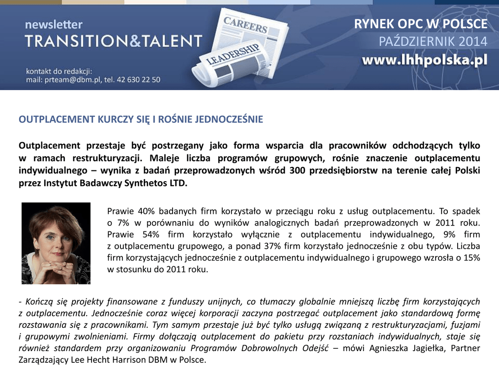 RYNEK OPC W POLSCE PAŹDZIERNIK 2014 OUTPLACEMENT KURCZY SIĘ I ROŚNIE JEDNOCZEŚNIE Outplacement przestaje być postrzegany jako forma wsparcia dla pracowników odchodzących tylko w ramach restrukturyzacji. Maleje liczba programów grupowych, rośnie znaczenie outplacementu indywidualnego – wynika z badań przeprowadzonych wśród 300 przedsiębiorstw na terenie całej Polski przez Instytut Badawczy Synthetos LTD. Prawie 40% badanych firm korzystało w przeciągu roku z usług outplacementu. To spadek o 7% w porównaniu do wyników analogicznych badań przeprowadzonych w 2011 roku. Prawie 54% firm korzystało wyłącznie z outplacementu indywidualnego, 9% firm z outplacementu grupowego, a ponad 37% firm korzystało jednocześnie z obu typów. Liczba firm korzystających jednocześnie z outplacementu indywidualnego i grupowego wzrosła o 15% w stosunku do 2011 roku. - Kończą się projekty finansowane z funduszy unijnych, co tłumaczy globalnie mniejszą liczbę firm korzystających z outplacementu. Jednocześnie coraz więcej korporacji zaczyna postrzegać outplacement jako standardową formę rozstawania się z pracownikami. Tym samym przestaje już być tylko usługą związaną z restrukturyzacjami, fuzjami i grupowymi zwolnieniami. Firmy dołączają outplacement do pakietu przy rozstaniach indywidualnych, staje się również standardem przy organizowaniu Programów Dobrowolnych Odejść – mówi Agnieszka Jagiełka, Partner Zarządzający Lee Hecht Harrison DBM w Polsce. RYNEK OUTPLACEMENTOWY c.d. Firmy, które korzystały z usług outplacementowych pytano, w jaki sposób przeprowadzały tę formę wsparcia. Najczęściej wskazywaną odpowiedzią był komercyjny outplacement realizowany przez firmę zewnętrzną - 78%. 15% przeprowadzało program outplacementowy samodzielnie, a około 7% firm korzystało w tym zakresie z usług urzędów pracy lub finansowało go z EFS. - Powyższe dane odniesione zwłaszcza do danych z lat poprzednich (2011, 2009) wskazują, że wraz z rosnącą świadomością czym jest outplacement pojawia się zrozumienie, że do jego dobrej realizacji konieczne jest zaangażowanie zewnętrznego dostawcy. Organizacje rzadko dysponują wystarczająco rozbudowanym zespołem HR, aby móc dedykować pracowników do wsparcia osób odchodzących. A nawet jeśli jest to możliwe, jak pokazują doświadczenia kilku banków czy firm ubezpieczeniowych, gotowość osób zwolnionych do korzystania z takiej formy wsparcia jest kilkakrotnie mniejsza niż przy zaangażowaniu firmy zewnętrznej. Z jednej strony to kwestia autorytetu, który osobie z HR dużo trudniej zbudować w tej sytuacji, w tej nowej roli. Dotychczas była przecież postrzegana jako ekspert od szkoleń, systemów ocen czy kwestii płacowych i prawa pracy. Z drugiej strony osoby odchodzące bardzo rzadko chcą dzielić się z osobami z HR swoimi troskami i dylematami, bo w sposób naturalny utożsamiają je z „tymi złymi, którzy mnie zwolnili” – mówi Agnieszka Jagiełka. źródło:sxc.hu RYNEK OUTPLACEMENTOWY c.d. Z badania wynika, że przy wyborze firmy świadczącej usługi outplacementowe decydującymi czynnikami są przede wszystkim doświadczenie firmy, kompetencje zespołu i dopasowanie programu do potrzeb odchodzących pracowników. - Jak przy każdej usłudze zewnętrznej, która towarzyszy trudnym personalnie decyzjom i zmianom, główne wyzwanie dla zespołu HR to umiejętne zarządzenie ryzykiem społecznym. Mam tu na myśli ferment wewnątrz organizacji, niepokoje, protesty ze strony związków zawodowych czy odejścia kluczowych osób. Nikt przecież nie chce wydawać pieniędzy i angażować się we współpracę, która się nie układa i nie daje spodziewanych efektów. Stąd nie dziwi wybór firm z dużym doświadczeniem popartym konkretnymi referencjami. Sami do tego namawiamy, aby je zbierać i sprawdzać. Dziwi natomiast fakt, że cena i koszty usługi nie są wymieniane w pierwszej trójce kryteriów. Może to zbyt wstydliwe kryterium w tym kontekście, żeby o nim wspominać, a może jest po prostu tak – w co chcę wierzyć – że firmy coraz otwarciej dyskutują z dostawcami jaki mają budżet i szukają najlepszych rozwiązań w ramach przeznaczonej na projekt kwoty – mówi Agnieszka Jagiełka z LHH DBM. Firma Synthetos LTD zbierała dane za 2013 rok wśród 300 firm na terenie całego kraju na zlecenie Lee Hecht Harrison DBM Polska.