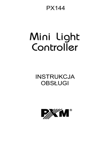 PX144 Mini Light Controller INSTRUKCJA OBSŁUGI R SPIS TREŚCI 1. Opis ogólny................................................................................................1 2. Warunki bezpieczeństwa...........................................................................1 3. Schemat połączeń.....................................................................................2 4. Instalacja oprogramowania....................................................................... 3 5. Oprogramowanie sterownika.....................................................................5 5.1. Połączenie sterownika z komputerem PC.................................5 5.2. Ustawienia kontrolera................................................................6 5.2.1. Ustawienia wejść.......................................................6 5.2.2. Ustawienia pilota....................................................... 8 5.2.3. Pozostałe ustawienia.................................................9 5.2.3.1. Scena specjalna........................................ 10 5.2.3.2. Adres pilota................................................10 5.2.3.3. Podgląd wybranych kanałów..................... 11 5.2.3.4. Symulator wejścia......................................11 5.3. Definiowanie scen i kroków programów.................................... 12 5.4. Definiowanie programów........................................................... 13 5.5. Kopiowanie ustawień scen i programów................................... 14 5.6. Zapisywanie i odczyt konfiguracji.............................................. 15 5.7. Zakończenie pracy z programem.............................................. 16 6. Specyfikacja techniczna............................................................................16 7. Deklaracja zgodności................................................................................ 17 Producent zastrzega sobie możliwość wprowadzania zmian w funkcjonowaniu i obsłudze sterownika, mających na celu ulepszenie wyrobu. PXM s.c. Rev.1.1. tel.: (0 12) 626 46 92 ul. Przemysłowa 12 fax: (0 12) 626 46 94 E-mail: [email protected] 30-701 Kraków Internet: www.pxm.pl 1. OPIS OGÓLNY PX144 Mini Light Controller jest sterownikiem dynamicznego oświetlenia architektonicznego oraz dekoracyjnego pozwalającym na kontrolowanie rozbudowanych instalacji oświetleniowych. Do komunikacji z otoczeniem służy 8 wejść typu on/off, wejście pilota sterowania bezprzewodowego nadającego w kodzie RC-5 oraz port USB. PX144 posiada wyjścia w standardzie DMX-512 oraz OC o obciążalności 1,5 A na kanał, pozwalające bezpośrednio sterować diodami LED. Dioda RGB widoczna na obudowie PX144 pozwala na bezpośredni podgląd koloru świecenia w wybranych trzech kolejnych kanałach wyjściowych. Moduł przeznaczony jest do sterowania zarówno szybkimi, jak i wolnymi zmianami oświetlenia, doskonale nadaje się także do sterowania wszelkimi urządzeniami inteligentnymi. Programowanie sterownika odbywa się po przez komputer PC za pomocą dołączonego software'u działającego w środowisku Windows. Pamięć PX144 umożliwia zapisanie szesnastu scen z określoną jasnością, czasem wejścia, trwania oraz zejścia, oraz ośmiu programów, czyli sekwencji scen, w których, poprzez odpowiedni dobór parametrów można wpływać na dynamikę pokazu świetlnego. Ponadto Mini Light Controller ma wbudowaną jedną scenę specjalną, która może być na bieżąco dowolnie regulowana przez użytkownika, np. za pośrednictwem pilota, nie wymagając tym samym podłączania komputera. Sterowanie modułem może odbywać się z zewnątrz za pomocą klawiszy (mogą to być np. czujki ruchu, przełączniki zmierzchowe bądź zwykłe klawisze) lub pilota. PX144 pozwala na zdefiniowanie 16 scen oraz 8 programów składających się z maksimum 16 kroków każdy. 2. WARUNKI BEZPIECZEŃSTWA Sterownik PX144 Mini Light Controller jest zasilany napięciem bezpiecznym 12 - 24V, jednak podczas jego instalacji i użytkowania należy bezwzględnie przestrzegać poniższych reguł bezpieczeństwa: 1. Urządzenie może być podłączone wyłącznie do zasilania 12-24 V DC o obciążalności zgodnej z danymi technicznymi. 2. Należy chronić wszystkie przewody przed uszkodzeniami mechanicznymi i termicznymi. 3. W przypadku uszkodzenia któregokolwiek z przewodów należy zastąpić go przewodem o takich samych parametrach technicznych. 4. Do podłączenia sygnału DMX stosować wyłącznie przewód ekranowany. 5. Wszelkie naprawy, jak i podłączenie sygnału DMX mogą być wykonywane wyłącznie przy odłączonym zasilaniu. 6. Należy bezwzględnie chronić PX144 przed kontaktem z wodą i innymi płynami. 7. Unikać gwałtownych wstrząsów, a w szczególności upadków. 8. Nie włączać urządzeniach w pomieszczeniach o wilgotności powyżej 90%. 9. Urządzenia nie należy używać w pomieszczeniach o temperaturze niższej niż +2oC lub wyższej niż +40oC. 10. Do czyszczenia używać wyłącznie lekko wilgotnej ściereczki. 1 3. SCHEMAT POŁĄCZEŃ diody LED połączone wspólną anodą układ stabilizujący prąd (np. rezystor) zasilanie modułu wyjście DMX efekt DMX (np. lampa) B G R 12-24V DC OC OUTPUT efekt DMX (np. lampa) DMX OK PWR dioda "X" Mini Light Controller PX 144 1 2 3 4 5 6 7 8 Na zakończeniu lini DMX należy podłączyć: Terminator (opornik 110 Ohm wpięty między linieDMX+ i DMX-) input +5 V REMOTE CONTROL czujnik podczerwieni PX191 brązowy przełączniki (np. czujki ruchu, przełączniki zmierzchowe, etc.) biały + zielony (sygnał) podłączenie czujnika typu NO +12 V NO COM podłączenie czujnika typu NC zasilanie czujników +12 V DC wejście 1 ... 8 +12 V NC masa (COM) COM TMP GND zasilanie czujników +12 V DC wejście 1 ... 8 masa (COM) TMP GND masa (GND) 2 masa (GND) 4. INSTALACJA OPROGRAMOWANIA Na płycie dołączonej do sterownika znajduje się program Px144 ver. 0_1_3_204 Install.exe, który po uruchomieniu ins
