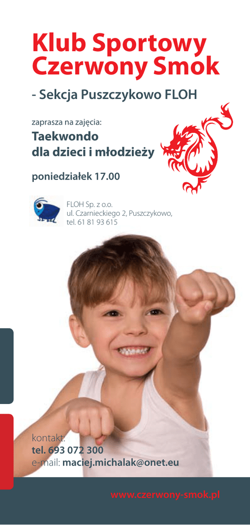 Klub Sportowy Czerwony Smok - Sekcja Puszczykowo FLOH zaprasza na zajęcia: Taekwondo dla dzieci i młodzieży poniedziałek 17.00 FLOH Sp. z o.o. ul. Czarnieckiego 2, Puszczykowo, tel. 61 81 93 615 kontakt: tel. 693 072 300 e-mail: [email protected] www.czerwony-smok.pl Klub Sportowy Czerwony Smok - Sekcja Puszczykowo - Bellissima zaprasza na zajęcia: Kick boxing, K1, Muay thai dla młodzieży i dorosłych, zajęcia grupowe poniedziałek i środa 19.00 Instytut Zdrowia i Urody Bellissima S.C., ul. Poznańska 110, tel. 61 670 07 77 zajęcia indywidualne w dowolnym terminie kontakt: Trener Maciej Michalak: tel. 693 072 300 Trener Sebastian Drela: tel. 509 346 204 e-mail: [email protected] www.czerwony-smok.pl