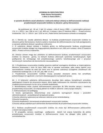 UCHWAŁA Nr XXXV/245//2014 Rady Gminy Sieroszewice z dnia 11 marca 2014 r. w sprawie określenia zasad udzielania i rozliczania dotacji celowej na dofinansowanie realizacji przydomowych oczyszczalni ścieków na obszarze gminy Sieroszewice Na podstawie art. 18 ust. 2 pkt 15 ustawy z dnia 8 marca 1990 r. o samorządzie gminnym ( Dz. U. z 2013 r. poz. 594 ze zm.) i art. 403 ust. 5 ustawy z dnia 27 kwietnia 2001 r. - Prawo ochrony środowiska ( Dz. U. z 2013 r. poz. 1232 ze zm.), Rada Gminy Sieroszewice uchwala co następuje: §1. 1. Określa się zasady udzielania dotacji na budowę przydomowych oczyszczalni ścieków na obszarze gminy Sieroszewice, kryteria wyboru inwestycji do dofinansowania oraz tryb postępowania w sprawie udzielania dotacji i sposób jej rozliczania. 2. O udzielenie dotacji celowej z budżetu gminy na dofinansowanie budowy przydomowej oczyszczalni ścieków ubiegać się mogą podmioty określone w art. 403 ust.4 ustawy z dnia 27 kwietnia 2001 r. Prawo ochrony środowiska. §2. Dotacje celowe mogą być udzielane na dofinansowanie budowy przydomowych oczyszczalni ścieków na obszarze gminy, na których budowa zbiorczych systemów kanalizacyjnych, bądź podłączenie do istniejącego lub projektowanego systemu kanalizacyjnego jest z przyczyn technicznych niemożliwa lub ekonomicznie nieuzasadniona. §3. 1.Przydomowa oczyszczalnia ścieków powinna spełniać wymagania określone w rozporządzeniu Ministra Środowiska z dnia 24 lipca 2006 roku w sprawie warunków, jakie należy spełnić przy wprowadzaniu ścieków do wód lub ziemi oraz w sprawie substancji szczególnie szkodliwych dla środowiska wodnego (Dz. U. Nr 137, poz. 984 ze zm.). 2. Przydomowe oczyszczalnie ścieków muszą posiadać stosowne atesty lub certyfikaty potwierdzające ich zgodność z normami obowiązującymi w przepisach prawa. §4. 1. O kolejności udzielania dofinansowania decyduje data wpływu kompletnych wniosków spełniających kryteria do przyznania dotacji, które będą realizowane do momentu wyczerpania się środków przeznaczonych na ten cel w uchwale budżetowej. 2. Wnioskodawca może uzyskać dofinansowanie wynoszące do 50% kosztów zakupu i montażu przydomowej oczyszczalni, nie więcej jednak niż 4 000 zł. (słownie: cztery tysiące złotych). 3. Dofinansowaniu nie podlegają: 1) koszty sporządzonej dokumentacji oraz uzyskania wymaganych decyzji i pozwoleń administracyjnych przewidzianych przepisami prawa, 2) koszty robocizny wykonanej we własnym zakresie przez wnioskodawcę, 3) koszty transportu, 4) koszty eksploatacji i konserwacji przydomowych oczyszczalni ścieków, 5) koszty zakupu pojedynczych elementów (komponentów) do przydomowej oczyszczalni ścieków. §5.1. Budowa przydomowych oczyszczalni ścieków nie może być dofinansowana jednocześnie z dwóch lub więcej źródeł. 2. W przypadku zamiaru wspólnego podłączenia dwóch lub więcej budynków do jednej przydomowej oczyszczalni ścieków o dofinansowanie może się ubiegać tylko jeden z wnioskodawców. 3. Jeżeli na terenie nieruchomości, na której pobudowana została przydomowa oczyszczalnia ścieków istnieje zbiornik bezodpływowy na nieczystości ciekłe, wnioskodawca zobowiązany jest do zlikwidowania zbiornika. § 6. 1. Wnioskodawca ubiegający się o uzyskanie dofinansowania na budowę przydomowej oczyszczalni ścieków składa wniosek do Wójta Gminy Sieroszewice przed przystąpieniem do realizacji przedsięwzięcia. 2. Wniosek o dofinansowanie według wzoru stanowiącego załącznik nr 1 do uchwały, składa się do dnia 30 kwietnia danego roku kalendarzowego, w którym ma być przyznane dofinansowanie, bądź też do wyczerpania się limitu środków finansowych przeznaczonych na ww. cel. 3. Do wniosku, o którym mowa w ust.2 należy dołączyć: 1) dokument potwierdzający posiadanie tytułu prawnego do nieruchomości, której dotyczy wniosek (w przypadku posiadania innego tytułu prawnego do nieruchomości niż własność, do wniosku należy dołączyć pisemną zgodę właściciela nieruchomości, a gdy nieruchomość stanowi współwłasność należy dołączyć zgodę na realizację przedsięwzięcia wszystkich współwłaścicieli), 2) mapę informacyjną z naniesioną lokalizacją obiektu, 3) pozwolenie wydane przez Starostę Ostrowskiego na budowę przydomowej oczyszczalni ścieków o wydajności powyżej 7,5 m3 na dobę lub kopii zgłoszenia potwierdzonego przez Starostwo Powiatowe w Ostrowie Wielkopolskim o zamiarze przystąpienia do wykonania robót budowlanych dotyczących przydomowej oczyszczalni o wydajności do 7,5 m3 na dobę, 4)pozwolenie wodno prawne wydane przez Starostę Ostrowskiego dla oczyszczalni o przepustowości powyżej 5,0 m3 na dobę lub zgłoszenia instalacji niewymagającej uzyskania pozwolenia wodno prawnego w przypadku budowy oczyszczalni o wydajności do 5,0 m3 na dobę, 5) kopię dokumentacji technicznej przydomowej oczyszczalni ścieków. 4. W przypadku ubiegania się o dotację przez podmioty prowadzące działalność gospodarczą, stanowić ona będzie odpowiednio: 1) pomoc de minimis w rozumieniu rozporządzenia Komisji (UE) nr 1407/2013 z dnia 18 grudnia 2013 r. w sprawie stosowania art. 107 i 108 Traktatu o funkcjonowaniu Unii Europejskiej do pomocy de minimis (Dz. Urz. UE. L 352 z 24.12.2013 r.) lub 2) pomoc de minimis w rolnictwie, w rozumieniu rozporządzenia Komisji (UE) nr 1408/2013 z dnia 18 grudnia 2013 r. w sprawie stosowania art. 107 i 108 Traktatu o funkcjonowaniu Unii Europejskiej do pomocy de minimis w sektorze rolnym (Dz. Urz. UE L 352 z 24.12.2013 r.). 5. Do wniosku o przyznanie dotacji złożonego przez podmiot dla którego udzielone dofinansowanie stanowić będzie pomoc de minimis, należy dołączyć również dokumenty i informacje zawarte w art. 37 ust.1 i ust. 2 ustawy z dnia 30 kwietnia 2004 r. o postępowaniu w sprawach dotyczących pomocy publicznej (Dz. U. z 2007 r. Nr 59, poz. 404 ze zm.) oraz w rozporządzeniu Rady Ministr