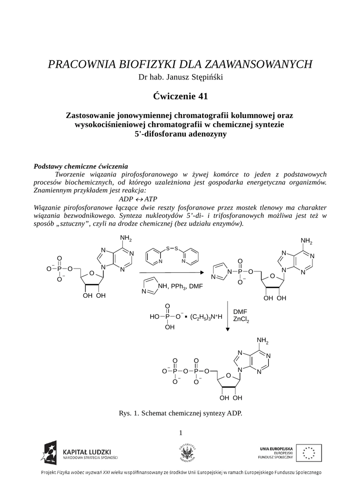 PRACOWNIA BIOFIZYKI DLA ZAAWANSOWANYCH Dr hab. Janusz Stępińśki Ćwiczenie 41 Zastosowanie jonowymiennej chromatografii kolumnowej oraz wysokociśnieniowej chromatografii w chemicznej syntezie 5'-difosforanu adenozyny Podstawy chemiczne ćwiczenia Tworzenie wiązania pirofosforanowego w żywej komórce to jeden z podstawowych procesów biochemicznych, od którego uzależniona jest gospodarka energetyczna organizmów. Znamiennym przykładem jest reakcja: ADP ↔ ATP Wiązanie pirofosforanowe łączące dwie reszty fosforanowe przez mostek tlenowy ma charakter wiązania bezwodnikowego. Synteza nukleotydów 5’-di- i trifosforanowych możliwa jest też w sposób „sztuczny”, czyli na drodze chemicznej (bez udziału enzymów). NH2 N N O O P O O O N OH OH NH2 S S N N N N P O N N O O NH , PPh3, DMF N OH OH O HO P O . (C H ) N H 2 5 3 DMF ZnCl2 + OH NH2 N O N O O P O P O O O O N OH OH Rys. 1. Schemat chemicznej syntezy ADP. 1 N O N N N Chemia nukleotydów narzuca jednak konieczność stosowania łagodnych warunków syntezy, ponieważ drastyczne metody jak np. wysoka temperatura reakcji doprowadziłyby do rozkładu substratów. Opierając się na fakcie, że kationy manganu Mn 2+ stanowią katalizator reakcji enzymatycznych powstawania wiązania pirofosforanowego (mangan, podobnie jak i kilka innych pierwiastków metali przejściowych występuje w ilościach śladowych w organizmach żywych), opracowano chemiczną syntezę z udziałem tych jonów. Reakcję wykonuje się w wodzie, a jeden z substratów musi być aktywowany np. imidazolem. Stopień konwersji substratu do pochodnej pirofosforanowej w tej reakcji jest jednak nieduży i wynosi 20 – 30%. Próby usprawnienia syntezy doprowadziły do stwierdzenia, że katalizatorem reakcji mogą być też inne kationy, spośród których najlepsze rezultaty dają jony cynku Zn 2+ . Jony cynkowe wymagają środowiska bezwodnego, ponieważ w obecności wody ulegają one hydratacji i tracą właściwości katalityczne. Metody badawcze i przepisy wykonawcze: 1. Wymiana jonowa na jonitach. Otrzymywanie 5’-AMP w postaci soli trietyloamoniowej. AMP przechowuje się najczęściej w postaci soli sodowej. Jeżeli jakąkolwiek reakcję z AMP wykonuje się w rozpuszczalniku organicznym, należy przedtem sól sodową przeprowadzić w sól organiczną w celu zapewnienia jak największej rozpuszczalności tego substratu. Dogodną postacią jest sól trietyloamoniowa. Wymiany jonowej dokonuje się na tzw. kationicie. Kationit to najczęściej polimer organiczny zmodyfikowany chemicznie tak, aby zawierał grupy o charakterze kwasowym, np. polimer-COOH, polimer-SO 3H. W obecności jakichkolwiek jonów dodatnich (kationów) polimer wiąże siłami elektrostatycznego oddziaływania te kationy i uwalnia do roztworu jony wodorowe (następuje np. reakcja: polimer-SO 3H + Na + → polimer-SO 3Na + H +). Na kationicie może następować oczywiście jakakolwiek inna wymiana jonowa, np. reakcja odwrotna do opisanej, w obecności odpowiednio dużego stężenia jonów wodorowych. Aby wykonać podaną w tytule operację należy dysponować kationitem w formie trietyloamoniowej, np. polimer-SO 3N+H(C2H5) 3. Poniżej podany jest przepis na przeprowadzenie 5 g soli sodowej AMP w sól trietyloamoniową. W kolumnie o objętości ok. 100 ml umieszcza się kationit (dół kolumny, o ile nie posiada ona dna ze szkła porowatego, zaopatruje się w zwitek waty i kolumnę napełnia zawiesiną kationitu w wodzie do wysokości 5 - 7 cm od górnej krawędzi) i przemywa 500 ml 10% kwasu solnego. W tej fazie regeneracji kationitu uzyskuje się go w formie wodorowej. Następnie kolumnę przemywa się wodą zdemineralizowaną (np. destylowaną) aż wyciek będzie obojętny. Po spuszczeniu ostatniej warstwy wody do zrównania jej poziomu z górnym poziomem kationitu nalewa się 20 ml trietyloaminy i kontynuuje zbieranie wycieku (operację wykonuje się koniecznie pod wyciągiem). Po “wsiąknięciu” trietyloaminy w warstwę kationitu, kolumnę przemywa się ponownie wodą aż wyciek będzie miał pH ok. 7. Kolumnę należy przepakować, tzn. zawiesinę kationitu w wodzie wylewa się do innego naczynia, a następnie napełnia ponownie kolumnę. W tym etapie kolumna gotowa jest do wykonania tytułowej operacji. AMP (sól disodowa) rozpuszcza się w ok. 50 ml wody i otrzymany roztwór nanosi się na kolumnę, potem przemywa się wodą do uzyskania ok. 0,5 l roztworu (w razie potrzeby można badać absorbancję UV wycieku w 260 nm, aby stwierdzić, że w wycieku nie ma już AMP). Wyciek zatęża się na wyparce, a następnie pozostałość suszy się w eksykatorze próżniowym nad P 4O10 do uzyskania soli monotrietyloamoniowej AMP w postaci sypkiego proszku. 2. Jonowymienna chromatografia cieczowa 2 2a) Otrzymywanie P 5’ -imidazolidu AMP. W kolbie poj. 500 ml zaopatrzonej w magnetyczny element mieszający umieszcza się 0,9 – 1,0 g AMP (ok. 2 mmoli) w postaci dobrze wysuszonej soli TEA ( pkt. 1), 0,68 g imidazolu, 0,88 g 2,2’-ditiodipirydyny i dodaje 10 ml bezwodnego DMF (N,N-dimetyloformamidu) oraz 0,3 ml TEA (trietyloaminy). Kolbę ustawia się na mieszadle magnetycznym i dodaje jeszcze 1,1 g Ph 3P (trifenylofosfiny). Mieszanie kontynuuje się aż do całkowitego zaniku AMP (ok. 6 godz.). Reakcję kończy się dodając do kolby roztwór 1,0 g NaClO 4 (nadchloran sodu bezwodny) w 100 ml bezwodnego acetonu. Dodatkowo mieszaninę rozcieńcza się dodając 20 ml acetonu. Kolbę chłodzi się w lodówce ok. 2 godz. i otrzymany osad soli sodowej imidazolowej pochodnej AMP odsącza się na lejku Schotta pod zmniejszonym ciśnieniem. Osad przemywa się na lejku 3 – 4 razy bezwodnym acetonem, za każdym razem rozcierając osad dokładnie z rozpuszczalnikiem, aż wyciek z lejka nie będzie już zabarwiony na żółto. Po przeniesieniu osadu do krystalizatora, suszy się go przez noc w eksykatorze próżniowym nad P 4O10. 2b) Synteza 5’-ADP (tworzenie wiązania pirofosforanowego). W kolbie 