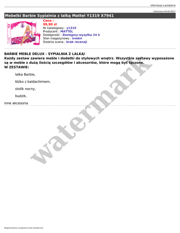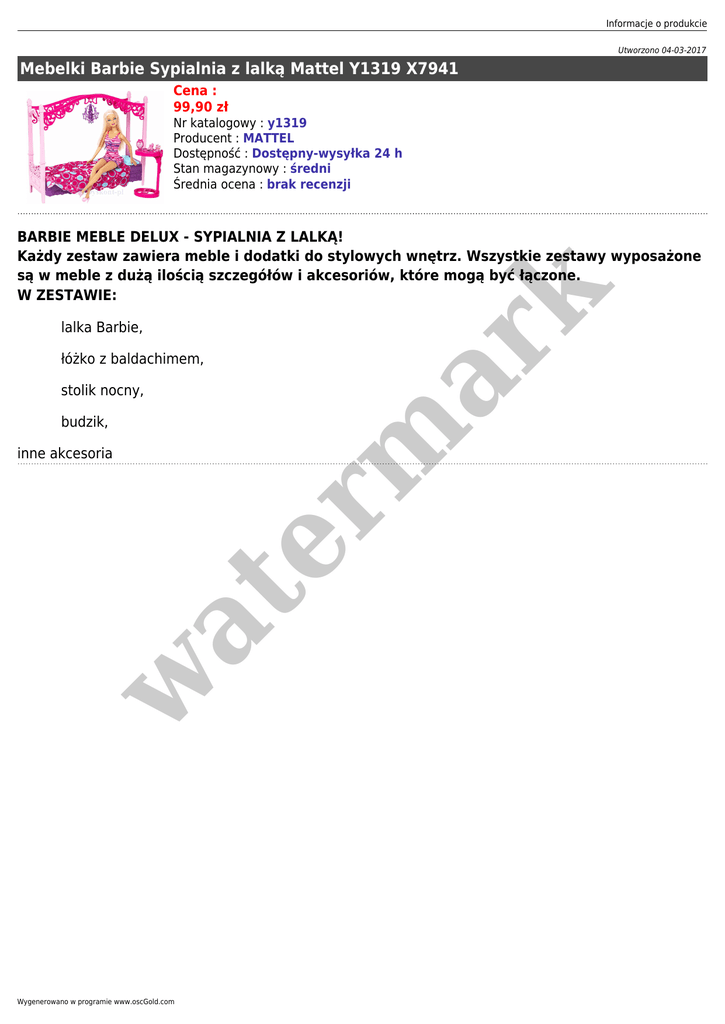 Informacje o produkcie Utworzono 04-03-2017 Mebelki Barbie Sypialnia z lalką Mattel Y1319 X7941 Cena : 99,90 zł Nr katalogowy : y1319 Producent : MATTEL Dostępność : Dostępny-wysyłka 24 h Stan magazynowy : średni Średnia ocena : brak recenzji lalka Barbie, er m ar k BARBIE MEBLE DELUX - SYPIALNIA Z LALKĄ! Każdy zestaw zawiera meble i dodatki do stylowych wnętrz. Wszystkie zestawy wyposażone są w meble z dużą ilością szczegółów i akcesoriów, które mogą być łączone. W ZESTAWIE: łóżko z baldachimem, stolik nocny, budzik, w at inne akcesoria Wygenerowano w programie www.oscGold.com
