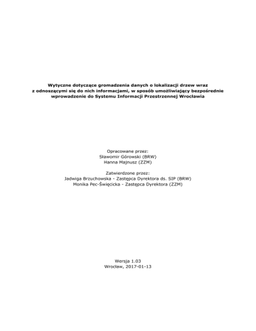 Wytyczne dotyczące gromadzenia danych o lokalizacji drzew wraz z odnoszącymi się do nich informacjami, w sposób umożliwiający bezpośrednie wprowadzenie do Systemu Informacji Przestrzennej Wrocławia Opracowane przez: Sławomir Górowski (BRW) Hanna Majnusz (ZZM) Zatwierdzone przez: Jadwiga Brzuchowska - Zastępca Dyrektora ds. SIP (BRW) Monika Pec-Święcicka - Zastępca Dyrektora (ZZM) Wersja 1.03 Wrocław, 2017-01-13 1. Informacje ogólne. Zbieranie danych o lokalizacji drzew wraz z odnoszącymi się do nich informacjami realizowane jest na podstawie Zarządzenia Nr 5081/16 Prezydenta Wrocławia z dnia 11 sierpnia 2016 r. w sprawie ochrony drzew i rozwoju terenów zieleni Wrocławia. Zgodnie z §4 pkt. 2 w każdym rodzaju opracowania odnoszącego się do drzew, w szczególności inwentaryzacjach, projektach, wnioskach do decyzji administracyjnych, dokumentacji powykonawczej, należy określać ich usytuowanie w przestrzeni wraz z odnoszącymi się do nich informacjami, w sposób umożliwiający bezpośrednie wprowadzenie tych danych do Systemu Informacji Przestrzennej Wrocławia (SIP). 2. Etapy na jakich dane powinny być przygotowane i przekazane do SIP. Opracowania odnoszące się do drzew należy przekazać po zakończeniu każdego etapu realizacji tj.: w przypadku opracowań jednoetapowych jak np. inwentaryzacja drzew, projekt bez określonego terminu realizacji – w terminie 60 dni od momentu utworzenia opracowania; w przypadku opracowań wieloetapowych jak np. opracowanie dokumentacji projektowej wraz z realizacją projektu – dwukrotnie: o w terminie 60 dni od momentu utworzenia opracowania, nie później jednak niż 30 dni przed planowaną wycinką drzew, o w terminie 60 dni od momentu zakończenia realizacji projektu – dane zaktualizowane z zachowaniem numerów drzew z pierwszego etapu. Zaktualizowane dane powinny być nieodłącznym elementem dokumentacji powykonawczej. 3. Wprowadzanie danych o drzewach do SIP. Na potrzeby wprowadzania danych o drzewach do SIP możliwe są trzy metody: przekazanie danych w formie plików o ustalonym formacie – csv lub csv i shapefile, wprowadzanie danych poprzez aplikację mapową SIP – dane są wprowadzane bezpośrednio do bazy danych SIP. Metoda ta wymaga uzyskania loginu i hasła od administratora SIP. wprowadzanie danych w bazach danych GIS jednostek – aktualizacja w SIP na poziomie baz danych, wymaga uzgodnienia z administratorem SIP. 4. Format plików. Dane opisowe należy dostarczyć w formacie csv, dane o lokalizacji w postaci współrzędnych X i Y w pliku csv, lub w pliku shapefile. Dane o lokalizacji powinny być sporządzone w układzie współrzędnych PUWG2000 Strefa 6 (EPSG:2177). Pliki shapefile powinny zostać przygotowane wg następującego rozwarstwienia: BZZ_DRZEWA_GEOM - typ geometrii: punkt – lokalizacja drzewa, BZZ_DRZEWA_OBSZARY_GEOM - typ geometrii: poligon – zasięg obszaru pokrytego drzewami, BZZ_KRZEWY_OBSZARY_GEOM- typ geometrii: poligon – zasięg obszaru pokrytego krzewami. Każdy plik shapefile powinien zawierać pole tekstowe NR_OBIEKTU zawierające numer, którym obiekt jest identyfikowany w ramach opracowania, projektu. Przygotowanie plików shapefile możliwe jest przy użyciu otwartego programowania GIS, np. QGIS Desktop, w którym można min. zaimportować pliki CAD (dxf, dgn) oraz można wykorzystać usługi WMS i WFS publikowane przez System Informacji Przestrzennej Wrocławia (http://geoportal.wroclaw.pl/zasoby/) oraz inne jednostki. Dla danych opisowych powinny być przygotowane następujące pliki csv: BZZ_DRZEWA_OPIS – dla drzewa, BZZ_DRZEWA_OBSZARY_OPIS - dla obszaru pokrytego drzewami, BZZ_KRZEWY_OBSZARY_OPIS – dla obszaru pokrytego krzewami. Struktura dla danych opisowych została opisana szczegółowo w pliku drzewa_krzewy_format_dla_SIP_struktura_danych_opisowych_v1_01_20160110.xls. Plik csv powinien być zapisany z użyciem separatora „;” oraz z użyciem kodowania znaków w „Windows-1250 (Europa Środkowa)”. Eksport do pliku csv można wykonać z popularnych aplikacji np. Excel 2013 poprzez zapisz jako csv (rozdzielony przecinkami) z domyślnymi ustawieniami (separator zapisywany taki jak w ustawieniach regionalnych systemu dla Polski, standardowo to „;”), w Calc Libra Office i Open Office podczas zapisu do pliku csv można wybrać separator i kodowanie. 5. Numeracja obiektów. Szczególną uwagę należy zwrócić na identyfikację obiektu w ramach opracowań. W przypadku danych pozyskanych w wyniku wykonania opracowań (inwentaryzacji, projektów, wniosków o usunięcie drzew/krzewów) przyjęty został obowiązek opisania obiektu identyfikatorem opracowania (ID_OPRACOWANIA) oraz numerem obiektu w ramach opracowania (NR_OBIEKTU). Numery drzew zinwentaryzowanych nie mogą się pokrywać z numerami drzew projektowanych. Dopuszcza się aby wiele obiektów projektowanych o takich samych parametrach posiadało taki sam nr obiektu. 6. Przekazywanie danych. Dane należy przekazywać do ZZM i SIP w formie elektronicznej na adres e-mail: [email protected] i [email protected]