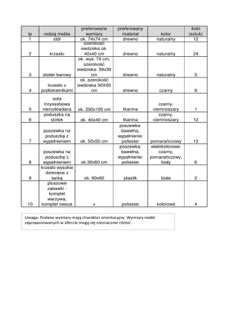 lp 1 2 3 4 preferowane rodzaj mebla wymiary stół ok. 74x74 cm szerokość siedziska ok. krzesło 40x40 cm ok. wys: 74 cm, szerokość siedziska: 39x39 stołek barowy cm ok. szerokość krzesło z siedziska 50X50 podłokietnikami cm 6 sofa trzyosobowa nierozkładana poduszka na stołek 7 poszewka na poduszkę z wypełnieniem 5 8 9 10 poszewka na poduszkę z wypełnieniem krzesło wysokie dziecięce z tacką pluszowe zabawki komplet warzywa, komplet owoce preferowany materiał drewno kolor naturalny ilość (sztuk) 12 drewno naturalny 24 drewno naturalny 5 drewno czarny 6 czarny, ciemnoszary czarny, ciemnoszary ok. 200x100 cm tkanina ok. 40x40 cm pomarańczowy wielokolorowe: czarny, pomarańczowy, biały 12 ok.30x60 cm tkanina poszewka: bawełna, wypełnienie: poliester poszewka: bawełna, wypełnienie: poliester ok. 60x60 plastik białe 2 x poliester kolorowe 4 ok. 50x50 cm Uwaga: Podane wymiary mają charakter orientacyjny. Wymiary mebli zaproponowanych w ofercie mogą się nieznacznie różnić. 1 12 6