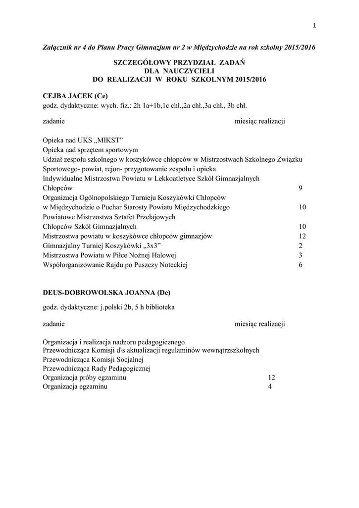 1 Załącznik nr 4 do Planu Pracy Gimnazjum nr 2 w Międzychodzie na rok szkolny 2015/2016 SZCZEGÓŁOWY PRZYDZIAŁ ZADAŃ DLA NAUCZYCIELI DO REALIZACJI W ROKU SZKOLNYM 2015/2016 CEJBA JACEK (Ce) godz. dydaktyczne: wych. fiz.: 2h 1a+1b,1c chł.,2a chł.,3a chł., 3b chł. zadanie miesiąc realizacji Opieka nad UKS „MIKST” Opieka nad sprzętem sportowym Udział zespołu szkolnego w koszykówce chłopców w Mistrzostwach Szkolnego Związku Sportowego- powiat, rejon- przygotowanie zespołu i opieka Indywidualne Mistrzostwa Powiatu w Lekkoatletyce Szkół Gimnazjalnych Chłopców 9 Organizacja Ogólnopolskiego Turnieju Koszykówki Chłopców w Międzychodzie o Puchar Starosty Powiatu Międzychodzkiego 10 Powiatowe Mistrzostwa Sztafet Przełajowych Chłopców Szkół Gimnazjalnych 10 Mistrzostwa powiatu w koszykówce chłopców gimnazjów 12 Gimnazjalny Turniej Koszykówki „3x3” 2 Mistrzostwa Powiatu w Piłce Nożnej Halowej 3 Współorganizowanie Rajdu po Puszczy Noteckiej 6 DEUS-DOBROWOLSKA JOANNA (De) godz. dydaktyczne: j.polski 2b, 5 h biblioteka zadanie miesiąc realizacji Organizacja i realizacja nadzoru pedagogicznego Przewodnicząca Komisji d\s aktualizacji regulaminów wewnątrzszkolnych Przewodnicząca Komisji Socjalnej Przewodnicząca Rady Pedagogicznej Organizacja próby egzaminu Organizacja egzaminu 12 4 2 DUDARSKI MACIEJ DM wychowawca kl. IIa godz. dydaktyczne: wych. fiz. chł. 1a+1b,dz.2a,ch.2bdz.3a edukacja do bezpiecz. kl.3a,3b zajęcia artystyczne- fotografia zadanie miesiąc realizacji Członek Komisji d\s aktualizacji regulaminów wewnątrzszkolnych Członek Komisji d\s opiekuńczo wychowawczych Tworzenie dokumentacji fotograficznej szkoły Gimnazjalny turniej tenisa stołowego - gry podwójne chłopców Gimnazjalny turniej tenisa stołowego - gry pojedyncze chłopców Gimnazjalny turniej tenisa stołowego dziewcząt - gry pojedyncze Drużynowe mistrzostwa powiatu w tenisie stołowym -chłopcy Konkurs nt. udzielanie pierwszej pomocy przedmedycznej Mistrzostwa powiatu w siatkówce dziewcząt gimnazjów Drużynowe mistrzostwa powiatu w tenisie stołowym dziewcząt Gimnazjalny turniej piłki nożnej Indywidualne Mistrzostwa Powiatu w Biegach Przełajowych chłopców Gimnazjalny konkurs „Moje zdrowie” Gimnazjalny turniej piłki nożnej chłopców Gimnazjalny konkurs fotograficzny Pomoc w prowadzeniu szkolnej strony internetowej- zdjęcia Mistrzostwa Powiatu w Piłce Ręcznej Chłopców Mistrzostwa Powiatu w Piłce Nożnej Chłopców Ringomania Dzień Kobiet Udział w Świecie Podgrzybka 1 1 1 2 2 2 3 3 3 4 4 5 EWIAK MONIKA (E) wychowawca kl. IIIa godz. dydaktyczne: j.polski kl.3a,1c, innowacje-klasa 3 biblioteka G2 zajęcia artystyczne- dziennikarskie zadanie Członek Komisji d\s opiekuńczo -wychowawczych Członek Komisji Socjalnej Korespondent „Informatora Międzychodzkiego” Gromadzenie zasobów biblioteki szkolnej Koordynator edukacji czytelniczej i medialnej Opieka nad księgozbiorem Opieka nad Aktywem Medialnym miesiąc realizacji 3 Opieka nad izbą lekcyjną nr 6 Organizacja badania poziomu wiedzy z języka polskiego w kl. I Rocznica uchwalenia Konstytucji 3 Maja Konkurs „rozumiem co czytam” Uczczenie rocznicy odzyskania niepodległości 11.XI Konkurs ortograficzny "Bezbłędny Gimnazjalista" Sprawdzanie prac próby egzaminu (część testowa) Analiza wyników próby egzaminu z zakresu języka polskiego Konkursy czytelnicze w poziomach klas Konkurs przedmiotowy z języka polskiego w poziomie klas I Konkurs przedmiotowy z języka polskiego w poziomie klas II Popularyzacja czytelnictwa wśród młodzieży Przygotowanie informacji dla uczniów nt. egzaminów gimnazjalnych Zakończenie klas III 9 5 10 11 12 12 1 3 3 3 4 GALAS- BAKUS RENATA (Ga) wychowawca kl. Ia godz. dydaktyczne: j.polski kl.1a,1b,2a,3b zajęcia artystyczne zadanie miesiąc realizacji Członek Komisji d\s opiekuńczo wychowawczych Gromadzenie artykułów z prasy Impreza dla środowiska Opieka nad izbą lekcyjną nr 24 Opiekun RSU Zagospodarowanie tablicy informacyjnej na parterze - RSU Eliminacje szkolne -Wojewódzki Konkurs Języka Polskiego dla uczniów gimnazjów Eliminacje szkolne i powiatowe Wojewódzkiego Konkursu Recytatorskiego Eliminacje szkolne konkursu "Złota Żaba" - z języka polskiego Gimnazjalny konkurs "Mistrz ortografii" Dzień Edukacji Narodowej Analiza wyników egzaminu z zakresu języka polskiego Podsumowanie konkursu Najlepszy Uczeń Gimnazjum Sprawdzanie próby egzaminu z języka polskiego- wypracowania Uczczenie rocznicy Powstania Wielkopolskiego Wyzwolenie Międzychodu 10 12 12 4 10 6 6 12 12 4 JASINOWSKA EMILIA (J) godz. dydaktyczne: wych.fiz.: dz 1a+1b, dz. 1c,dz.2b,dz.3b swietlica ranna-3h zadanie miesiąc realizacji Członek Komisji Socjalnej Koordynator edukacji zdrowotnej Opieka nad SKS Prowadzenie i podsumowanie konkursu Najlepszy Sportowiec Gimnazjum Prowadzenie tablicy sportowych rekordów gimnazjum Zagospodarowanie tablicy informacyjnej parter "sport" Bieg jesieni - Międzychód 9 Gimnazjalne indywidualne biegi przełajowe dziewcząt 9 Bieg Przełajowy im Powstańców Wielkopolskich w Kamionnej 10 Masowy Bieg Przełajowy im. Tomasza Hopfera - Przytoczna 10 Powiatowe Mistrzostwa Sztafet Przełajowych Dziewcząt Szkół Gimnazjalnych 10 Bieg Powstańczy Posadowo Lwówek 11 Gimnazjalny Turniej Siatkówki dziewcząt 1 Powiatowe mistrzostwa w szachach 1 Gimnazjalny konkurs recytatorski o tematyce sportowej i olimpijskiej 2 Gimnazjalny turniej kometki dziewcząt 2 Bieg wiosny - Międzychód 3 Powiatowy Konkurs Recytatorski o Tematyce Sportowej i Olimpijskiej 3 Bieg Papieski 4 Indywidualne Mistrzostwa Powiatu w Biegach Przełajowych dziewcząt 4 Mistrzostwa Gimnazjum w indywidualnych biegach przełajowych 4 Organizacja imprez pod hasłem "Kwiecień miesiącem zdrowia" 4 Światowy Dzień Zdrowia - 7 kwietnia 4 Bieg uliczny A. Fidlera w Bolewicach 5 Bieg uliczny w Pszczewie 5 Indywidualne Mistrzostwa Powiatu w Lekkoatletyce Szkół Gimnazjalnych dziewcząt 5 Og