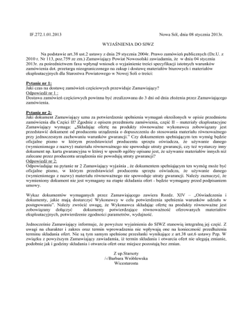 IF.272.1.01.2013 Nowa Sól, dnia 08 stycznia 2013r. WYJAŚNIENIA DO SIWZ Na podstawie art.38 ust.2 ustawy z dnia 29 stycznia 2004r. Prawo zamówień publicznych (Dz.U. z 2010 r. Nr 113, poz.759 ze zm.) Zamawiający Powiat Nowosolski zawiadamia, że w dniu 04 stycznia 2013r. za pośrednictwem faxu wpłynął wniosek o wyjaśnienie treści specyfikacji istotnych warunków zamówienia dot. przetargu nieograniczonego na zakup i dostawę materiałów biurowych i materiałów eksploatacyjnych dla Starostwa Powiatowego w Nowej Soli o treści: Pytanie nr 1: Jaki czas na dostawę zamówień częściowych przewiduje Zamawiający? Odpowiedź nr 1 : Dostawa zamówień częściowych powinna być zrealizowana do 3 dni od dnia złożenia przez Zamawiającego zamówienia. Pytanie nr 2: Jaki dokument Zamawiający uzna za potwierdzenie spełnienia wymagań określonych w opisie przedmiotu zamówienia dla Części II? Zgodnie z opisem przedmiotu zamówienia, część II – materiały eksploatacyjne Zamawiający wymaga: „Składając ofertę na produkty równoważne wykonawca zobowiązany jest przedstawić dokument od producenta urządzenia o dopuszczeniu do stosowania materiału równoważnego przy jednoczesnym zachowaniu warunków gwarancji.” Czy dokumentem spełniającym ten wymóg będzie oficjalne pismo w którym przedstawiciel producenta sprzętu oświadcza, że używanie danego (wymienionego z nazwy) materiału równoważnego nie spowoduje utraty gwarancji, czy też wystarczy inny dokument np. karta gwarancyjna w której w sposób ogólny opisane jest, że używanie materiałów innych niż zalecane przez producenta urządzenia nie powodują utraty gwarancji? Odpowiedź nr 2: Odpowiadając na pytanie nr 2 Zamawiający wyjaśnia , że dokumentem spełniającym ten wymóg może być oficjalne pismo, w którym przedstawiciel producenta sprzętu oświadcza, że używanie danego (wymienionego z nazwy) materiału równoważnego nie spowoduje utraty gwarancji. Należy zaznaczyć, że wymieniony dokument nie jest wymagany na etapie składania ofert - będzie wymagany przed podpisaniem umowy. Wykaz dokumentów wymaganych przez Zamawiającego zawiera Rozdz. XIV – „Oświadczenia i dokumenty, jakie mają dostarczyć Wykonawcy w celu potwierdzenia spełnienia warunków udziału w postępowaniu”. Należy zwrócić uwagę, że Wykonawca składając ofertę na produkty równoważne jest zobowiązany dołączyć dokumenty potwierdzające równoważność oferowanych materiałów eksploatacyjnych, potwierdzenie zgodności parametrów, wydajność. Jednocześnie Zamawiający informuje, że powyższe wyjaśnienia do SIWZ stanowią integralną jej część. Z uwagi na charakter i zakres oraz termin wprowadzenia nie wpływają one na konieczność przedłużenia terminu składania ofert. Nie są tym samym spełnione przesłanki wynikające z art.38 ust.6 ustawy Pzp. W związku z powyższym Zamawiający zawiadamia, iż termin składania i otwarcia ofert nie ulegają zmianie, podobnie jak i godziny składania i otwarcia ofert oraz miejsce pozostają bez zmian. Z up.Starsoty /-/Barbara Wróblewska Wicestarosta