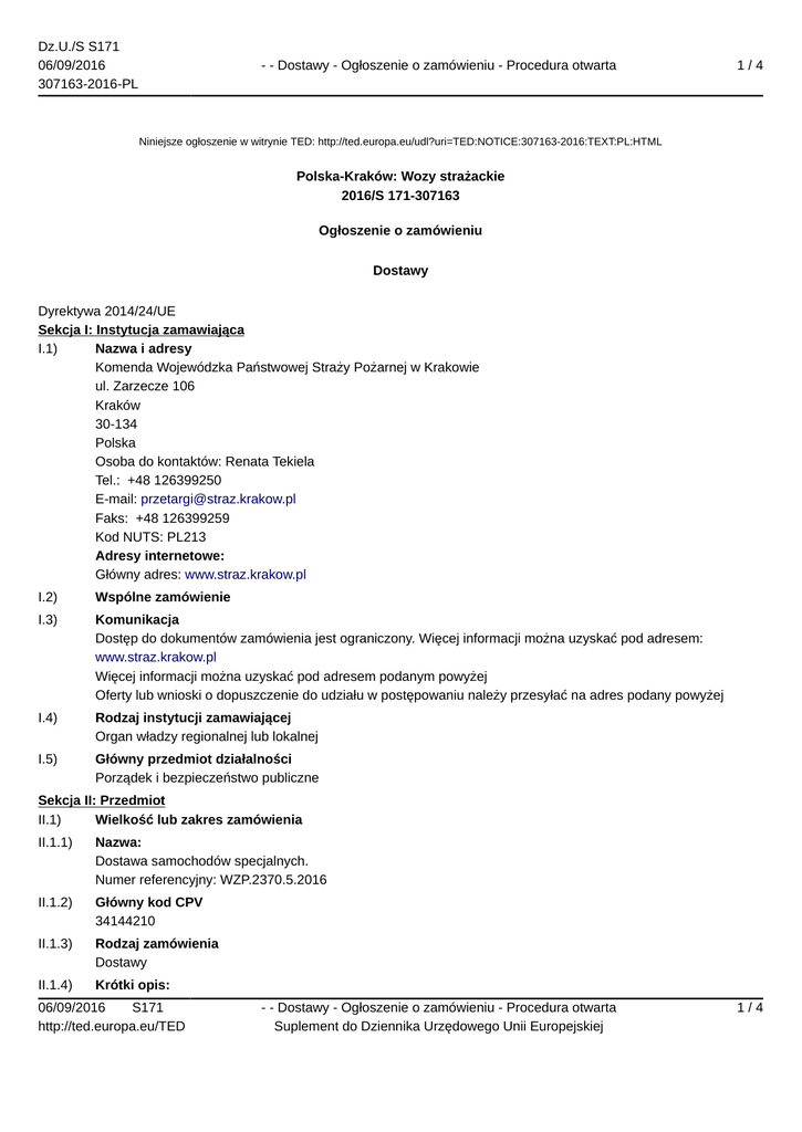 Dz.U./S S171 06/09/2016 307163-2016-PL - - Dostawy - Ogłoszenie o zamówieniu - Procedura otwarta 1/4 Niniejsze ogłoszenie w witrynie TED: http://ted.europa.eu/udl?uri=TED:NOTICE:307163-2016:TEXT:PL:HTML Polska-Kraków: Wozy strażackie 2016/S 171-307163 Ogłoszenie o zamówieniu Dostawy Dyrektywa 2014/24/UE Sekcja I: Instytucja zamawiająca I.1) Nazwa i adresy Komenda Wojewódzka Państwowej Straży Pożarnej w Krakowie ul. Zarzecze 106 Kraków 30-134 Polska Osoba do kontaktów: Renata Tekiela Tel.: +48 126399250 E-mail: [email protected] Faks: +48 126399259 Kod NUTS: PL213 Adresy internetowe: Główny adres: www.straz.krakow.pl I.2) Wspólne zamówienie I.3) Komunikacja Dostęp do dokumentów zamówienia jest ograniczony. Więcej informacji można uzyskać pod adresem: www.straz.krakow.pl Więcej informacji można uzyskać pod adresem podanym powyżej Oferty lub wnioski o dopuszczenie do udziału w postępowaniu należy przesyłać na adres podany powyżej I.4) Rodzaj instytucji zamawiającej Organ władzy regionalnej lub lokalnej I.5) Główny przedmiot działalności Porządek i bezpieczeństwo publiczne Sekcja II: Przedmiot II.1) Wielkość lub zakres zamówienia II.1.1) Nazwa: Dostawa samochodów specjalnych. Numer referencyjny: WZP.2370.5.2016 II.1.2) Główny kod CPV 34144210 II.1.3) Rodzaj zamówienia Dostawy II.1.4) Krótki opis: 06/09/2016 S171 http://ted.europa.eu/TED - - Dostawy - Ogłoszenie o zamówieniu - Procedura otwarta Suplement do Dziennika Urzędowego Unii Europejskiej 1/4 Dz.U./S S171 06/09/2016 307163-2016-PL - - Dostawy - Ogłoszenie o zamówieniu - Procedura otwarta 2/4 Zadanie A) dostawa 1 sztuki lekkiego samochodu kwatermistrzowskiego do przewozu ratowników dla KP PSP Bochnia Zadanie B) dostawa 1 sztuki samochodu rozpoznawczo-ratowniczego dla KW PSP Kraków. II.1.5) Szacunkowa całkowita wartość II.1.6) Informacje o częściach To zamówienie podzielone jest na części: tak Oferty można składać w odniesieniu do wszystkich części II.2) Opis II.2.1) Nazwa: Dostawa 1 sztuki lekkiego samochodu kwatermistrzowskiego do przewozu ratowników Część nr: 1 II.2.2) Dodatkowy kod lub kody CPV 34144210 II.2.3) Miejsce świadczenia usług Kod NUTS: PL213 Główne miejsce lub lokalizacja realizacji: Siedziba zamawiającego. II.2.4) Opis zamówienia: Dostawa 1 sztuki lekkiego samochodu kwatermistrzowskiego do przewozu ratowników dla KP PSP Bochnia. II.2.5) Kryteria udzielenia zamówienia Cena nie jest jedynym kryterium udzielenia zamówienia; wszystkie kryteria są wymienione tylko w dokumentacji zamówienia II.2.6) Szacunkowa wartość II.2.7) Okres obowiązywania zamówienia, umowy ramowej lub dynamicznego systemu zakupów Początek: 02/11/2016 Koniec: 18/11/2016 Niniejsze zamówienie podlega wznowieniu: nie II.2.10) Informacje o ofertach wariantowych Dopuszcza się składanie ofert wariantowych: nie II.2.11) Informacje o opcjach Opcje: nie II.2.12) Informacje na temat katalogów elektronicznych II.2.13) Informacje o funduszach Unii Europejskiej Zamówienie dotyczy projektu/programu finansowanego ze środków Unii Europejskiej: nie II.2.14) Informacje dodatkowe II.2) Opis II.2.1) Nazwa: Dostawa lekkiego samochodu rozpoznawczo-ratowniczego Część nr: 2 II.2.2) Dodatkowy kod lub kody CPV 34144210 II.2.3) Miejsce świadczenia usług 06/09/2016 S171 http://ted.europa.eu/TED - - Dostawy - Ogłoszenie o zamówieniu - Procedura otwarta Suplement do Dziennika Urzędowego Unii Europejskiej 2/4 Dz.U./S S171 06/09/2016 307163-2016-PL - - Dostawy - Ogłoszenie o zamówieniu - Procedura otwarta 3/4 Kod NUTS: PL213 II.2.4) Opis zamówienia: Dostawa lekkiego samochodu rozpoznawczo-ratowniczego dla KW PSP Kraków. II.2.5) Kryteria udzielenia zamówienia Cena nie jest jedynym kryterium udzielenia zamówienia; wszystkie kryteria są wymienione tylko w dokumentacji zamówienia II.2.6) Szacunkowa wartość II.2.7) Okres obowiązywania zamówienia, umowy ramowej lub dynamicznego systemu zakupów Początek: 02/11/2016 Koniec: 18/11/2016 Niniejsze zamówienie podlega wznowieniu: nie II.2.10) Informacje o ofertach wariantowych Dopuszcza się składanie ofert wariantowych: nie II.2.11) Informacje o opcjach Opcje: nie II.2.12) Informacje na temat katalogów elektronicznych II.2.13) Informacje o funduszach Unii Europejskiej Zamówienie dotyczy projektu/programu finansowanego ze środków Unii Europejskiej: nie II.2.14) Informacje dodatkowe Sekcja III: Informacje o charakterze prawnym, ekonomicznym, finansowym i technicznym III.1) Warunki udziału III.1.1) Zdolność do prowadzenia działalności zawodowej, w tym wymogi związane z wpisem do rejestru zawodowego lub handlowego Wykaz i krótki opis warunków: Zamówienie nie wymaga posiadania szczegółowych uprawnień. III.1.2) Sytuacja ekonomiczna i finansowa Wykaz i krótki opis kryteriów kwalifikacji: Zamawiający nie ustanawia szczegółowego warunku w tym zakresie. III.1.3) Zdolność techniczna i kwalifikacje zawodowe Wykaz i krótki opis kryteriów kwalifikacji: Zamawiający nie ustanawia szczegółowego warunku w tym zakresie. III.1.5) Informacje o zamówieniach zastrzeżonych III.2) Warunki dotyczące zamówienia III.2.2) Warunki realizacji umowy: III.2.3) Informacje na temat pracowników odpowiedzialnych za wykonanie zamówienia Sekcja IV: Procedura IV.1) Opis IV.1.1) Rodzaj procedury Procedura otwarta IV.1.3) Informacje na temat umowy ramowej lub dynamicznego systemu zakupów IV.1.4) Zmniejszenie liczby rozwiązań lub ofert podczas negocjacji lub dialogu 06/09/2016 S171 http://ted.europa.eu/TED - - Dostawy - Ogłoszenie o zamówieniu - Procedura otwarta Suplement do Dziennika Urzędowego Unii Europejskiej 3/4 Dz.U./S S171 06/09/2016 307163-2016-PL - - Dostawy - Ogłoszenie o zamówieniu - Procedura otwarta IV.1.6) Informacje na temat aukcji elektronicznej IV.1.8) Informacje na temat Porozumienia w sprawie zamówień rządowych (GPA) Zamówienie jest objęte Porozumieniem w sprawie zamówień rządowych: nie IV.2) Informacje