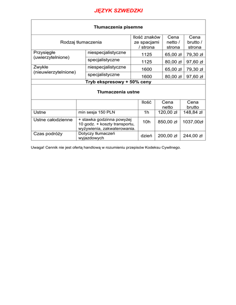 JĘZYK SZWEDZKI Tłumaczenia pisemne Ilość znaków ze spacjami / strona Cena netto / strona Cena brutto / strona niespecjalistyczne 1125 65,00 zł 79,30 zł specjalistyczne 1125 80,00 zł 97,60 zł niespecjalistyczne 1600 65,00 zł 79,30 zł 1600 Tryb ekspresowy + 50% ceny 80,00 zł 97,60 zł Rodzaj tłumaczenia Przysięgłe (uwierzytelnione) Zwykłe (nieuwierzytelnione) specjalistyczne Tłumaczenia ustne Ilość Ustne min sesja 150 PLN Ustne całodzienne + stawka godzinna powyżej 10 godz. + koszty transportu, wyżywienia, zakwaterowania. Dotyczy tłumaczeń wyjazdowych Czas podróży 1h Cena netto 120,00 zł Cena brutto 148,84 zł 10h 850,00 zł 1037,00zł dzień 200,00 zł 244,00 zł Uwaga! Cennik nie jest ofertą handlową w rozumieniu przepisów Kodeksu Cywilnego.
