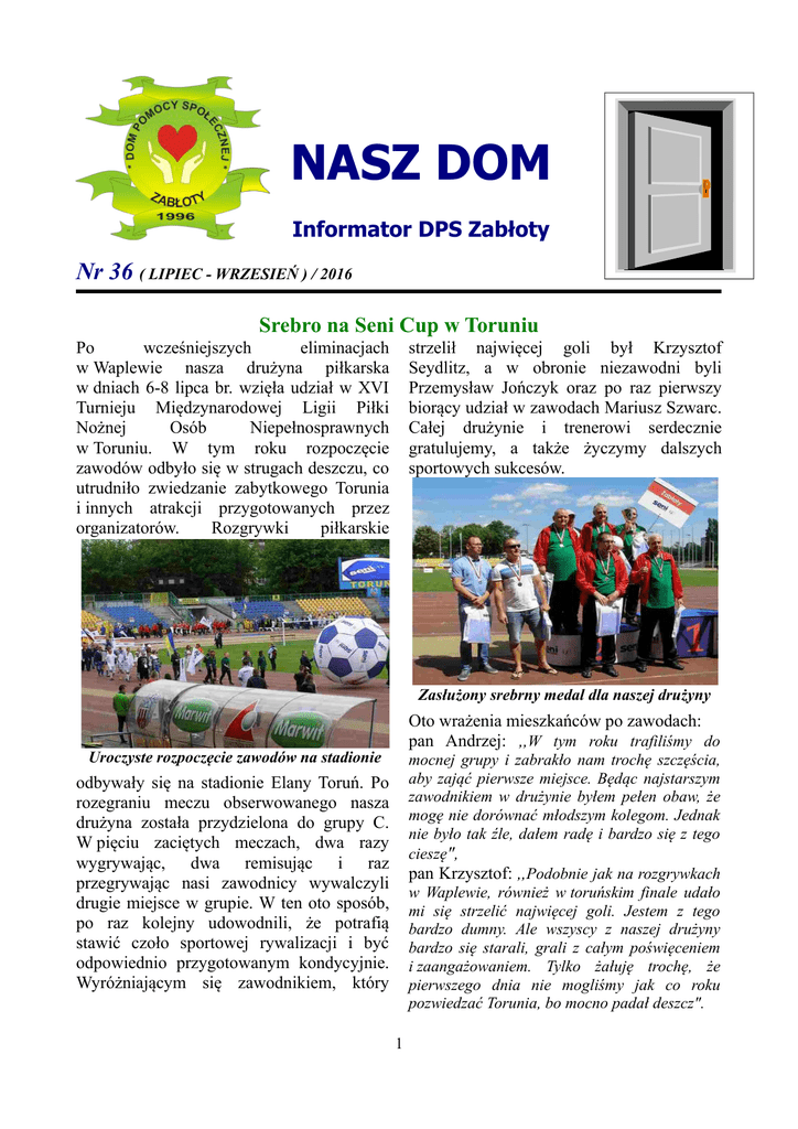 NASZ DOM Informator DPS Zabłoty Nr 36 ( LIPIEC - WRZESIEŃ ) / 2016 Srebro na Seni Cup w Toruniu Po wcześniejszych eliminacjach w Waplewie nasza drużyna piłkarska w dniach 6-8 lipca br. wzięła udział w XVI Turnieju Międzynarodowej Ligii Piłki Nożnej Osób Niepełnosprawnych w Toruniu. W tym roku rozpoczęcie zawodów odbyło się w strugach deszczu, co utrudniło zwiedzanie zabytkowego Torunia i innych atrakcji przygotowanych przez organizatorów. Rozgrywki piłkarskie strzelił najwięcej goli był Krzysztof Seydlitz, a w obronie niezawodni byli Przemysław Jończyk oraz po raz pierwszy biorący udział w zawodach Mariusz Szwarc. Całej drużynie i trenerowi serdecznie gratulujemy, a także życzymy dalszych sportowych sukcesów. Zasłużony srebrny medal dla naszej drużyny Oto wrażenia mieszkańców po zawodach: pan Andrzej: ,,W tym roku trafiliśmy do Uroczyste rozpoczęcie zawodów na stadionie mocnej grupy i zabrakło nam trochę szczęścia, aby zająć pierwsze miejsce. Będąc najstarszym zawodnikiem w drużynie byłem pełen obaw, że mogę nie dorównać młodszym kolegom. Jednak nie było tak źle, dałem radę i bardzo się z tego cieszę", pan Krzysztof: ,,Podobnie jak na rozgrywkach w Waplewie, również w toruńskim finale udało mi się strzelić najwięcej goli. Jestem z tego bardzo dumny. Ale wszyscy z naszej drużyny bardzo się starali, grali z całym poświęceniem i zaangażowaniem. Tylko żałuję trochę, że pierwszego dnia nie mogliśmy jak co roku pozwiedzać Torunia, bo mocno padał deszcz". odbywały się na stadionie Elany Toruń. Po rozegraniu meczu obserwowanego nasza drużyna została przydzielona do grupy C. W pięciu zaciętych meczach, dwa razy wygrywając, dwa remisując i raz przegrywając nasi zawodnicy wywalczyli drugie miejsce w grupie. W ten oto sposób, po raz kolejny udowodnili, że potrafią stawić czoło sportowej rywalizacji i być odpowiednio przygotowanym kondycyjnie. Wyróżniającym się zawodnikiem, który 1 Piknik w Drzewocinach 13 lipca br. uczestniczyliśmy w zabawie integracyjnej w ŚDS w Drzewocinach zorganizowanej pod hasłem ,,Poznaj inny świat - integruj się z nami". Wspólna w której brałam udział było przeciąganie liny. Wspólnie bawiliśmy się tańcząc przy muzyce z różnych rejonów świata oraz puszczając wielkie, kolorowe mydlane bańki. Czas bardzo szybko upłynął i szkoda, że nie mogliśmy zostać dłużej" pan Przemek: ,,Dla mnie był to pierwszy wyjazd do tego ośrodka. Zostałem pozytywnie zaskoczony miłym przyjęciem, serdeczną atmosferą i mnóstwem atrakcji. Najbardziej spodobało mi się robienie wielkich mydlanych baniek oraz zabawa Pamiątkowe wspólne zdjęcie zabawa na powietrzu, konkursy sprawnościowe, skoczna muzyka, wspólne biesiadowanie oraz tworzenie mydlanych baniek dostarczyło wiele wrażeń i radości. Po raz kolejny spotkaliśmy się z przyjaciółmi z innych ośrodków, a także nawiązaliśmy nowe znajomości. Wszyscy wróciliśmy w dobrych humorach. A oto jak wspominają piknik nasi mieszkańcy: pani Urszula: ,,Ciekawą konkurencją, Mydlane bańki w rozmiarach XXL wszystkich uczestników w dużym kole". Wycieczka naszych piłkarzy wyjechała do gospodarstwa agroturystycznego w Grobli. Wyjazd został zorganizowany w nagrodę za zdobycie srebrnego medalu na Seni Cup w Toruniu. W urokliwym miejscu zawodnicy miło spędzili czas wolny wspólnie biesiadując przy smażonej rybce i kiełbasce z grilla. Po pysznym posiłku był czas na spacery i zwiedzanie okolicy. Zasłużony odpoczynek po toruńskich meczach W dniu 15 lipca br. nasza drużyna piłkarska 2 XII Integracyjne Zawody Wędkarskie popsuć miłej atmosfery, która panowała w trakcie spotkania. Jedynym szczęśliwcem, któremu udało się złowić rybę i jednocześnie zostać zwycięzcą zawodów był Marek Adamus. Kolejne miejsca w drodze losowania przypadły Wszyscy uczestnicy zawodów integracyjnych Dnia 16 lipca br. mieszkańcy wraz z personelem i ich rodzinami oraz zaproszonymi gośćmi spotkali się po raz kolejny nad zbiornikiem wodnym ,Patyki" koło Zelowa. Członkowie Koła Wędkarskiego nr 37 z Zelowa przygotowali teren do rozegrania zawodów, udostępnili sprzęt wędkarski, a także służyli radą i pomocą podczas wędkowania. Pomimo sprzyjającej pogody oraz stosowania zanęt ryba nie ,,brała". Jednak to nie było w stanie Tegoroczny zwycięzca Karolowi Stańczykowi i Piotrowi Adamusowi. Wszystkim dziękujemy za udział i życzymy obfitszych połowów na kolejnych zawodach. III Rodzinny Rajd Rowerowy w rajdzie rowerowym pod hasłem ,,Rodzina Razem". Nasz ośrodek był pierwszym przystankiem gdzie można było odpocząć i skosztować smacznej grochówki. Pogoda w tym dniu dopisała, uczestnicy również, było ponad sto osób. Trasa rajdu wiodła z Kociszewa przez Zagłówki, Bocianichę, Zabłoty, Karczmy, Kuźnicę do Drzewocin. Organizatorem całego przedsięwzięcia był Ks. Proboszcz Parafii Kociszew Mirosław Wujek. Honorowy patronat nad rajdem objęli Starosta Bełchatowski Waldemar Wyczachowski oraz Burmistrz Zelowa Urszula Świerczyńska. Wszystkim smakował nasz poczęstunek 3 września br. na terenie naszego domu gościliśmy uczestników, którzy brali udział 3 Coroczne Spotkanie Rodzin 10 września br. po raz kolejny zostało zorganizowane dla rodzin i znajomych Odbyło się ono przy pięknej, słonecznej pogodzie. Po serdecznym powitaniu gości przez panią dyrektor Małgorzatę Muszkiewicz, nasza grupa teatralna ,,OTO ONI" zaprezentowała program artystyczny związany z tematyką ekologiczną pt,,O wędkarzu i smutnej rybce". Następnie wszyscy zostali ugoszczeni przez nasze kuchareczki smacznymi potrawami i przepysznymi ciastami. W czasie spotkania można było zwiedzić nasz dom, porozmawiać z personelem, zrobić pamiątkowe zdjęcie z najbliższymi oraz wpisać się do Kroniki DPS. Miło było wspólnie spotkać się i biesiadować naszych mieszkańców wspólne spotkanie. Wi