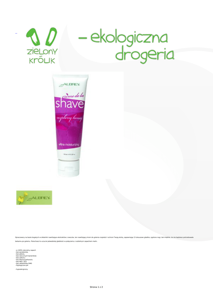 Opracowany na bazie bogatych w składniki nawilżające ekstraktów z owoców, ten nawilżający krem do golenia rozpieści i ochroni Twoją skórę, zapewniając Ci luksusowo gładkie, ogolone nogi, tak miękkie, że nie będziesz potrzebowała balsamu po goleniu. Pokochasz to uczucie jedwabistej gładkości w połączeniu z subtelnym zapachem malin. - w 100% naturalny zapach bez parabenów, bez glikolu, bez sztucznych barwników bez silikonu bez Phenoxyethanolu bez PEG i SLS bez składników GMO fizjologiczne pH - hypoalergiczny Strona 1 z 2 Kluczowe składniki : · olejek ze słodkich migdałów – nawilża i odżywia skórę · ekstrakt z owoców malin – antyoksydant; ściąga skórę, chroni i tonizuje · olejki eteryczne – naturalny zapach Składniki Aqua, alcohol denat. (38b, lavender*), myristyl alcohol (coconut fatty alcohol), hamamelis virginiana (witch hazel) extract, sodium palmate (palm soap), sodium cocoate (coconut soap), prunus amygdalus dulcis (sweet almond) oil, glycerin, rubus idaeus (raspberry) fruit extract, panthenol (vitamin B-5), aloe barbadensis leaf*, carmine, pimpinella anisum (aniseed) fruit oil, aniba rosaeodora (rosewood) wood oil, mentha arvensis (cornmint) oil, eugenia caryophyllata (clovebud) oil, sassafras officinale oil, litsea cubeba fruit oil, citrus nobilis (mandarin orange) peel oil, pinus sylvestris (pine) leaf oil, helianthus annuus (sunflower) seed oil*, tagetes minuta flower oil, cananga odorata (ylang) flower oil. *Składniki organiczne Strona 2 z 2