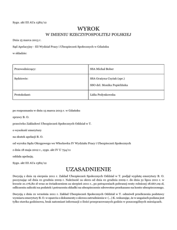 Sygn. akt III AUa 1582/12 WYROK W IMIENIU RZECZYPOSPOLITEJ POLSKIEJ Dnia 15 marca 2013 r. Sąd Apelacyjny - III Wydział Pracy i Ubezpieczeń Społecznych w Gdańsku w składzie: Przewodniczący: SSA Michał Bober Sędziowie: SSA Grażyna Czyżak (spr.) SSO del. Monika Popielińska Protokolant: Lidia Pedynkowska po rozpoznaniu w dniu 15 marca 2013 r. w Gdańsku sprawy B. O. przeciwko Zakładowi Ubezpieczeń Społecznych Oddział w T. o wysokość emerytury na skutek apelacji B. O. od wyroku Sądu Okręgowego we Włocławku IV Wydziału Pracy i Ubezpieczeń Społecznych z dnia 18 maja 2012 r., sygn. akt IV U 754/11 oddala apelację. Sygn. akt III AUa 1582/12 UZASADNIENIE Decyzją z dnia 19 sierpnia 2011 r. Zakład Ubezpieczeń Społecznych Oddział w T. podjął wypłatę emerytury B. O. poczynając od dnia 01 grudnia 2009 r. Należność za okres od dnia 01 grudnia 2009 r. do dnia 31 lipca 2011 r. w kwocie 21.176,82 zł wraz ze świadczeniem za sierpień 2011 r., po potrąceniach pobranej renty rolniczej 18.667,09 zł, odliczeniu zaliczki na podatek i potraceniu składki na ubezpieczenie zdrowotne przekazano na konto ubezpieczonego. Decyzją z dnia 21 września 2011 r. Zakład Ubezpieczeń Społecznych Oddział w T. odmówił przeliczenia podstawy wymiaru emerytury B. O. w oparciu o dokumenty z okresu zatrudnienia w (...) K. wskazując, że w angażach podana jest tylko stawka godzinowa, brak natomiast informacji o ilości przepracowanych godzin w poszczególnych miesiącach. Odwołania od powyższych decyzji wniósł B. O. domagając się obliczenia wysokości jego emerytury z uwzględnieniem podstawy wymiaru składek na ubezpieczenia społeczne, wynikającej z treści przedłożonych angaży z okresu zatrudnienia w (...) K.. Na podstawie art. 219 k.p.c. połączono sprawy z obydwu odwołań celem ich łącznego rozpoznania i rozstrzygnięcia. Wyrokiem z dnia 18 maja 2012 r. w sprawie IV U 754/11 Sąd Okręgowy we Włocławku IV Wydział Pracy i Ubezpieczeń Społecznych: 1. zmienił zaskarżone decyzje Zakładu Ubezpieczeń Społecznych Oddział w T.: z dnia 19 sierpnia 2011 r. i z dnia 21 września 2011 r. w ten sposób, że ustalił wysokość emerytury B. O. na kwotę 1.456,26 zł od dnia 13 marca 2012 r. 2. nie stwierdził odpowiedzialności organu rentowego za nie ustalenie ostatniej okoliczności niezbędnej do wydania decyzji 3. oddalił odwołania w pozostałej części. Podstawę tego rozstrzygnięcia stanowiły następujące ustalenia i rozważania Sądu I instancji: B. O.urodził się dnia (...)r. W okresie od dnia 20 kwietnia 1967 r. do dnia 11 stycznia 1973 r. B. O. pracował w (...) Przedsiębiorstwie Budownictwa (...) (od dnia 24 października 1968 r. do dnia 14 października 1970 r. odbywał czynną służbę wojskową). Od dnia 20 kwietnia 1967 r. B. O. otrzymywał wynagrodzenie w kwocie 6,00 zł za godzinę. Z dniem 01 czerwca 1968 r. przyznano B. O. godzinową stawkę w wysokości 7,00 zł. Z dniem 01 czerwca 1971 r. przyznano B. O. godzinową stawkę w wysokości 9,50 zł. Z dniem 26 września 1972 r. przyznano B. O. godzinową stawkę w wysokości 11,00 zł. W okresie od dnia 12 stycznia 1973 r. do dnia 31 marca 1989 r. B. O. pracował w Przedsiębiorstwie Budownictwa (...) W.. Od dnia 12 stycznia 1973 r. B. O. otrzymywał wynagrodzenie w kwocie 11,00 zł za godzinę. Z dniem 01 maja 1973 r. przyznano B. O. godzinową stawkę w wysokości 13,50 zł. Z dniem 01 sierpnia 1978 r. przyznano B. O. godzinową stawkę w wysokości 15,50 zł. Z dniem 01 listopada 1978 r. przyznano B. O. godzinową stawkę w wysokości 18,00 zł. Z dniem 01 maja 1980 r. przyznano B. O. 5 % dodatku stażowego. Z dniem 01 września 1980 r. przyznano B. O. godzinową stawkę w wysokości 20,00 zł. Z dniem 01 października 1980 r. przyznano B. O. godzinową stawkę w wysokości 21,00 zł. Z dniem 01 października 1980 r. przyznano B. O. 10 % dodatku stażowego. Z dniem 01 listopada 1981 r. przyznano B. O. godzinową stawkę w wysokości 39,90 zł. Od dnia 01 września 1981 r. zgodnie z uchwałą nr 187 Rady Ministrów z dnia 26 sierpnia 1981 r. w sprawie podwyższenia cen detalicznych niektórych artykułów żywnościowych (M.P. nr 22, poz. 200) i zarządzeniem Ministra Pracy, Płac i Spraw Socjalnych oraz Finansów z dnia 28 sierpnia 1981 r. w sprawie szczegółowych zasad wypłacania rekompensaty z tytułu podwyżek cen detalicznych chleba i przetworów zbożowo-mącznych oraz odpłatności z tytułu korekty stawek żywieniowych (M.P. nr 22, poz. 201) wprowadzona została rekompensata w wysokości 160,00 zł miesięcznie. Zgodnie z powyższymi przepisami rekompensata przysługiwała także B. O.. Z dniem 01 kwietnia 1982 r. przyznano B. O. godzinową stawkę w wysokości 40,40 zł. Z dniem 20 kwietnia 1982 r. przyznano B. O. dodatek stażowy w wysokości 15 % wynagrodzenia. Od dnia 01 lutego 1982 r. zgodnie z uchwałą nr 24 Rady Ministrów z dnia 27 stycznia 1982 r. w sprawie rekompensat pieniężnych z tytułu wprowadzenia z dniem 01 lutego 1982 r. nowych cen detalicznych podstawowych artykułów żywnościowych, opału i energii (M.P. nr 4, poz. 19) wprowadzona została kolejna rekompensata. B. O. miał ustaloną łączną kwotę rekompensaty w wysokości 1.560,00 zł. Z dniem 25 maja 1983 r. przyznano B. O. godzinową stawkę w wysokości 42,70 zł. Z dniem 20 kwietnia 1983 r. przyznano B. O. dodatek stażowy w wysokości 16 % wynagrodzenia. Z dniem 01 stycznia 1984 r. przyznano B. O. godzinową stawkę w wysokości 44,90 zł. Z dniem 20 kwietnia 1984 r. przyznano B. O. dodatek stażowy w wysokości 17 % wynagrodzenia. W dniu 01 kwietnia 2009 r. B. O. złożył w ZUS wniosek o emeryturę. Sąd Apelacyjny wyrokiem z dnia 12 kwietnia 2011 r. przyznał wnioskodawcy prawo do emerytury od dnia 01 grudnia 2009 r. Decyzją z dnia 20 czerwca 2011 r. wykonując wyrok Sądu Apelacyjnego organ rentowy przyznał prawo do emerytury od dnia 01 grudnia 2009 r. Emerytura ustalona przedmiotową decyzją