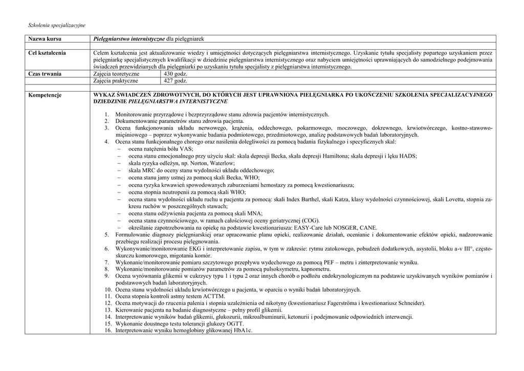 Szkolenia specjalizacyjne Nazwa kursu Pielęgniarstwo internistyczne dla pielęgniarek Cel kształcenia Celem kształcenia jest aktualizowanie wiedzy i umiejętności dotyczących pielęgniarstwa internistycznego. Uzyskanie tytułu specjalisty popartego uzyskaniem przez pielęgniarkę specjalistycznych kwalifikacji w dziedzinie pielęgniarstwa internistycznego oraz nabyciem umiejętności uprawniających do samodzielnego podejmowania świadczeń przewidzianych dla pielęgniarki po uzyskaniu tytułu specjalisty z pielęgniarstwa internistycznego. Zajęcia teoretyczne 430 godz. Zajęcia praktyczne 427 godz. Czas trwania Kompetencje WYKAZ ŚWIADCZEŃ ZDROWOTNYCH, DO KTÓRYCH JEST UPRAWNIONA PIELĘGNIARKA PO UKOŃCZENIU SZKOLENIA SPECJALIZACYJNEGO DZIEDZINIE PIELĘGNIARSTWA INTERNISTYCZNE 1. 2. 3. 4. 5. 6. 7. 8. 9. 10. 11. 12. 13. 14. 15. 16. Monitorowanie przyrządowe i bezprzyrządowe stanu zdrowia pacjentów internistycznych. Dokumentowanie parametrów stanu zdrowia pacjenta. Ocena funkcjonowania układu nerwowego, krążenia, oddechowego, pokarmowego, moczowego, dokrewnego, krwiotwórczego, kostno-stawowomięśniowego – poprzez wykonywanie badania podmiotowego, przedmiotowego, analizę podstawowych badań laboratoryjnych. Ocena stanu funkcjonalnego chorego oraz nasilenia dolegliwości za pomocą badania fizykalnego i specyficznych skal: ocena natężenia bólu VAS; ocena stanu emocjonalnego przy użyciu skal: skala depresji Becka, skala depresji Hamiltona; skala depresji i lęku HADS; skala ryzyka odleżyn, np. Norton, Waterlow; skala MRC do oceny stanu wydolności układu oddechowego; ocena stanu jamy ustnej za pomocą skali Becka, WHO; ocena ryzyka krwawień spowodowanych zaburzeniami hemostazy za pomocą kwestionariusza; ocena stopnia neutropenii za pomocą skali WHO; ocena stanu wydolności układu ruchu u pacjenta za pomocą: skali Index Barthel, skali Katza, klasy wydolności czynnościowej, skali Lovetta, stopnia zakresu ruchów w poszczególnych stawach; ocena stanu odżywienia pacjenta za pomocą skali MNA; ocena stanu czynnościowego, w ramach całościowej oceny geriatrycznej (COG). określanie zapotrzebowania na opiekę na podstawie kwestionariusza: EASY-Care lub NOSGER, CANE. Formułowanie diagnozy pielęgniarskiej oraz opracowanie planu opieki, realizowanie działań, ocenianie i dokumentowanie efektów opieki, nadzorowanie przebiegu realizacji procesu pielęgnowania. Wykonywanie/monitorowanie EKG i interpretowanie zapisu, w tym w zakresie: rytmu zatokowego, pobudzeń dodatkowych, asystolii, bloku a-v III, częstoskurczu komorowego, migotania komór. Wykonanie/monitorowanie pomiaru szczytowego przepływu wydechowego za pomocą PEF – metru i zinterpretowanie wyniku. Wykonanie/monitorowanie pomiarów parametrów za pomocą pulsoksymetru, kapnometru. Ocena wyrównania glikemii w cukrzycy typu 1 i typu 2 oraz innych chorób o podłożu endokrynologicznym na podstawie uzyskiwanych wyników pomiarów i podstawowych badań laboratoryjnych. Ocena stanu wydolności układu krwiotwórczego u pacjenta, w oparciu o wyniki badań laboratoryjnych. Ocena stopnia kontroli astmy testem ACTTM. Ocena motywacji do rzucenia palenia i stopnia uzależnienia od nikotyny (kwestionariusz Fagerströma i kwestionariusz Schneider). Kierowanie pacjenta na badanie diagnostyczne – pełny profil glikemii. Interpretowanie wyników badań glikemii, glukozurii, mikroalbuminurii, ketonurii i podejmowanie odpowiednich interwencji. Wykonanie doustnego testu tolerancji glukozy OGTT. Interpretowanie wyniku hemoglobiny glikowanej HbA1c. Szkolenia specjalizacyjne 17. Ocena stopnia przewodnienia pacjenta dializowanego. 18. Przygotowanie oraz nadzorowanie prawidłowości przygotowania pacjenta ze schorzeniem układu krążenia, oddechowego, pokarmowego, moczowego, dokrewnego i przemiany materii, nerwowego, krwiotwórczego, kostno-stawowo-mięśniowego, opieki paliatywnej do badań i zabiegów diagnostycznych, terapeutycznych, w tym m.in.: bronchoskopii; badania radiologicznego przewodu pokarmowego; rektosigmoidoskopii; kolonoskopii; gastroskopii; nakłucia otrzewnej; artroskopii; badania płynu stawowego; scyntygrafii tarczycy; biopsji szpiku i trepanobiopsji z talerza kości biodrowej. 19. Wykonanie upustu krwi. 20. Wykonywanie próby opaskowej. 21. Wykonanie alergicznych testów skórnych. 22. Wykonanie testu tuberkulinowego. 23. Wykonywanie zabiegów fizykoterapeutycznych (drenaż ułożeniowy, opukiwanie (wstrząsanie) klatki piersiowej, sprężynowanie klatki piersiowej, oklepywanie klatki piersiowej i toalety drzewa oskrzelowego. 24. Pobranie plwociny na badanie bakteriologiczne i cytologiczne samodzielnie bez zlecenia lekarskiego. 25. Pobieranie arterializowanej krwi włośniczkowej na gazometrię i wykonanie oznaczenia. 26. Rozpoznawanie potencjalnie odwracalnych objawów pogarszających jakość życia chorych paliatywnych. 27. Rozpoznawanie i udzielanie pierwszej pomocy osobom w stanach zagrożenia życia. 28. Wykonanie zabiegów resuscytacyjnych (masaż zewnętrzny serca, sztuczna wentylacja za pomocą aparatu ambu, defibrylacja elektryczna serca). 29. Prowadzenie tlenoterapii pod kontrolą gazometrii samodzielnie bez zlecenia lekarskiego. 30. Przygotowanie pacjenta do podawania leków drogą wziewną przy zastosowaniu różnego typu inhalatorów, nebulizatorów i przy uwzględnieniu jego stanu. 31. Zakładanie cewnika Foleya do pęcherza moczowego u mężczyzny (do dwukrotnej próby). 32. Podejmowanie działań zapobiegających zakażeniom u chorych z cewnikiem Foleya, z cewnikiem założonym nadłonowo, pęcherzem Brickera. 33. Prowadzenie instruktażu w zakresie treningu pęcherza moczowego u chorych z problemem nietrzymania moczu. 34. Kroplowe przetaczanie dożylne płynów, podawanie dożylne leków (Heparinum, Natrium Chloratum 0,9%, Glucosum 5%, Natrium Chloratum 10%, Calcium 10%) oraz modyfikacje ich dawki, w trakcie trwania dializy, zgodnie z planem leczenia ustalonym dla danego pacjenta oraz