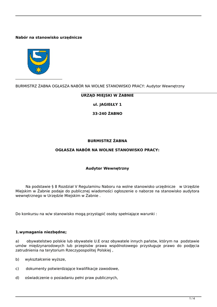 Nabór na stanowisko urzędnicze BURMISTRZ ŻABNA OGŁASZA