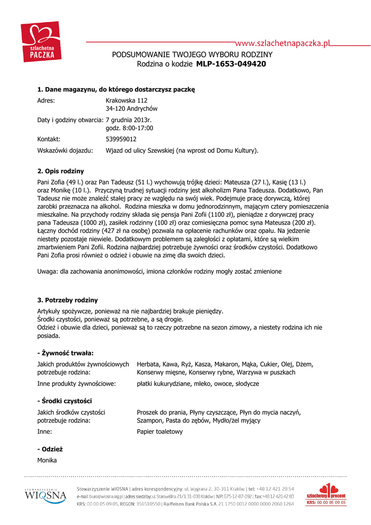 PODSUMOWANIE TWOJEGO WYBORU RODZINY Rodzina o kodzie MLP-1653-049420 1. Dane magazynu, do którego dostarczysz paczkę Adres: Krakowska 112 34-120 Andrychów Daty i godziny otwarcia: 7 grudnia 2013r. godz. 8:00-17:00 Kontakt: 539959012 Wskazówki dojazdu: Wjazd od ulicy Szewskiej (na wprost od Domu Kultury). 2. Opis rodziny Pani Zofia (49 l.) oraz Pan Tadeusz (51 l.) wychowują trójkę dzieci: Mateusza (27 l.), Kasię (13 l.) oraz Monikę (10 l.). Przyczyną trudnej sytuacji rodziny jest alkoholizm Pana Tadeusza. Dodatkowo, Pan Tadeusz nie może znaleźć stałej pracy ze względu na swój wiek. Podejmuje pracę dorywczą, której zarobki przeznacza na alkohol. Rodzina mieszka w domu jednorodzinnym, mającym cztery pomieszczenia mieszkalne. Na przychody rodziny składa się pensja Pani Zofii (1100 zł), pieniądze z dorywczej pracy pana Tadeusza (1000 zł), zasiłek rodzinny (100 zł) oraz comiesięczna pomoc syna Mateusza (200 zł). Łączny dochód rodziny (427 zł na osobę) pozwala na opłacenie rachunków oraz opału. Na jedzenie niestety pozostaje niewiele. Dodatkowym problemem są zaległości z opłatami, które są wielkim zmartwieniem Pani Zofii. Rodzina najbardziej potrzebuje żywności oraz środków czystości. Dodatkowo Pani Zofia prosi również o odzież i obuwie na zimę dla swoich dzieci. Uwaga: dla zachowania anonimowości, imiona członków rodziny mogły zostać zmienione 3. Potrzeby rodziny Artykuły spożywcze, ponieważ na nie najbardziej brakuje pieniędzy. Środki czystości, ponieważ są potrzebne, a są drogie. Odzież i obuwie dla dzieci, ponieważ są to rzeczy potrzebne na sezon zimowy, a niestety rodzina ich nie posiada. - Żywność trwała: Jakich produktów żywnościowych potrzebuje rodzina: Herbata, Kawa, Ryż, Kasza, Makaron, Mąka, Cukier, Olej, Dżem, Konserwy mięsne, Konserwy rybne, Warzywa w puszkach Inne produkty żywnościowe: płatki kukurydziane, mleko, owoce, słodycze - Środki czystości Jakich środków czystości potrzebuje rodzina: Proszek do prania, Płyny czyszczące, Płyn do mycia naczyń, Szampon, Pasta do zębów, Mydło/żel myjący Inne: Papier toaletowy - Odzież Monika PODSUMOWANIE TWOJEGO WYBORU RODZINY Rodzina o kodzie MLP-1653-049420 Rodzaj odzieży: przejściowe Kategoria: spodnie Rozmiar: 130 cm wzrostu Sylwetka: szczupła, drobna Uwagi: spodnie rurki Monika Rodzaj odzieży: zimowe Kategoria: kurtka Rozmiar: 130 cm wzrostu Sylwetka: szczupła, drobna Uwagi: kolor czarny Kasia Rodzaj odzieży: przejściowe Kategoria: spodnie Rozmiar: 150 cm wzrostu, XS Sylwetka: szczupła, drobna Uwagi: jeans, rurki Kasia Rodzaj odzieży: zimowe Kategoria: kurtka Rozmiar: 150 cm wzrostu, XS Sylwetka: szczupła, drobna Uwagi: kolor brąż lub beż - Obuwie Monika Rodzaj obuwia: zimowe Kategoria: kozaki Rozmiar: 32 Uwagi: wyższe, czarne Monika Rodzaj obuwia: przejściowe Kategoria: papcie PODSUMOWANIE TWOJEGO WYBORU RODZINY Rodzina o kodzie MLP-1653-049420 Rozmiar: 32 Uwagi: Kasia Rodzaj obuwia: zimowe Kategoria: kozaki Rozmiar: 37 Uwagi: Kasia Rodzaj obuwia: przejściowe Kategoria: papcie Rozmiar: 37 Uwagi: - Pomoce szkolne Jakich pomocy szkolnych potrzebuje rodzina? Zeszyty, Bloki, Kredki, Farbki, Plastelina, Papier kolorowy, Klej Inne: Teczki, pędzle - Wyposażenie mieszkania Jakiego wyposażenia mieszkania potrzebuje rodzina: Koc, Pościel Inne: 2 koce dla dziewczynek - Specjalne upominki Monika chciałaby lalkę "Monster High" , Kasia książkę "Zmierzch" , Respondentka skromnie powiedziała, że cieszyłaby się z tanich perfum. 4. Osoby opiekujące sie rodziną - Wolontariusz opiekun rodziny Imię i nazwisko: Paulina Kierpiec E-mail: [email protected] Telefon: 880477317 - Lider rejonu Imię i nazwisko: Mateusz Trzepaczka PODSUMOWANIE TWOJEGO WYBORU RODZINY Rodzina o kodzie MLP-1653-049420 5. Jak zapakować paczkę Paczki można dostarczyć wyłącznie do tego magazynu, z którego wybrana została rodzina. Pamiętaj, że po wybraniu przez Ciebie rodziny nikt inny nie będzie już dla niej przygotowywał paczki. Nie musisz zaspokoić wszystkich potrzeb rodziny, zwróć jednak uwagę, że wszystkie wymienione rzeczy są dla rodziny bardzo ważne. Rzeczy które podarujesz rodzinie powinny być dla niej prezentem. Nie muszą być one nowe, ale zawsze przygotowane z myślą o drugim człowieku. Przygotuj więc paczkę tak, by podniosła poczucie własnej wartości u obdarowanych przez Ciebie osób. Wskazówki do przygotowania Paczki: * paczki powinny być podzielone na kilka, poręcznych, niezbyt ciężkich pudeł, prosimy nie dostarczać do magazynu produktów zapakowanych w reklamówki czy worki foliowe * każde pudło powinno być opisane kodem rodziny oraz opatrzone numerem, pudła należy numerować według klucza: np. 1 z 5, 2 z 5 itd. * paczce powinny znaleźć się suche i trwałe artykuły spożywcze, prosimy, aby nie pakować do pudeł produktów, które łatwo ulegają uszkodzeniu, wylaniu, rozgnieceniu * aby prezent nabrał świątecznego charakteru można owinąć pudła kolorowym papierem Dziękując za Twoje zaangażowanie w SZLACHETNĄ PACZKĘ, zapraszamy do ponownego spotkania przy rozliczaniu formularza PIT. Przekaż swój 1% na Stowarzyszenie WIOSNA. Razem zmieniamy świat na lepsze! Dziękując za Twoje zaangażowanie w SZLACHETNĄ PACZKĘ, zapraszamy do ponownego spotkania przy rozliczaniu formularza PIT. Przekaż swój 1% na Stowarzyszenie WIOSNA. Razem zmieniamy świat na lepsze!