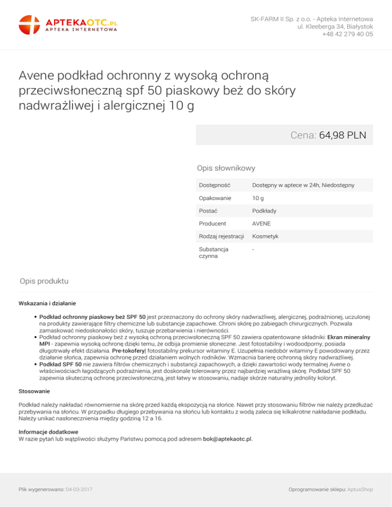 SK-FARM II Sp. z o.o. - Apteka Internetowa ul. Kleeberga 34, Białystok +48 42 279 40 05 Avene podkład ochronny z wysoką ochroną przeciwsłoneczną spf 50 piaskowy beż do skóry nadwrażliwej i alergicznej 10 g Cena: 64,98 PLN Opis słownikowy Dostępność Dostępny w aptece w 24h, Niedostępny Opakowanie 10 g Postać Podkłady Producent AVENE Rodzaj rejestracji Kosmetyk Substancja czynna - Opis produktu Wskazania i działanie Podkład ochronny piaskowy beż SPF 50 jest przeznaczony do ochrony skóry nadwrażliwej, alergicznej, podrażnionej, uczulonej na produkty zawierające filtry chemiczne lub substancje zapachowe. Chroni skórę po zabiegach chirurgicznych. Pozwala zamaskować niedoskonałości skóry, tuszuje przebarwienia i nierówności. Podkład ochronny piaskowy beż z wysoką ochroną przeciwsłoneczną SPF 50 zawiera opatentowane składniki: Ekran mineralny MPI - zapewnia wysoką ochronę dzięki temu, że odbija promienie słoneczne. Jest fotostabilny i wodoodporny, posiada długotrwały efekt działania. Pre-tokoferyl fotostabilny prekursor witaminy E. Uzupełnia niedobór witaminy E powodowany przez działanie słońca, zapewnia ochronę przed działaniem wolnych rodników. Wzmacnia barierę ochronną skóry nadwrażliwej. Podkład SPF 50 nie zawiera filtrów chemicznych i substancji zapachowych, a dzięki zawartości wody termalnej Avene o właściwościach łagodzących podrażnienia, jest doskonale tolerowany przez najbardziej wrażliwą skórę. Podkład SPF 50 zapewnia skuteczną ochronę przeciwsłoneczną, jest łatwy w stosowaniu, nadaje skórze naturalny jednolity koloryt. Stosowanie Podkład należy nakładać równomiernie na skórę przed każdą ekspozycją na słońce. Nawet przy stosowaniu filtrów nie należy przedłużać przebywania na słońcu. W przypadku długiego przebywania na słońcu lub kontaktu z wodą zaleca się kilkakrotne nakładanie podkładu. Należy unikać nasłonecznienia między godziną 12 a 16. Informacje dodatkowe W razie pytań lub wątpliwości służymy Państwu pomocą pod adresem [email protected]. Plik wygenerowano: 04-03-2017 Powered by TCPDF (www.tcpdf.org) Oprogramowanie sklepu: AptusShop