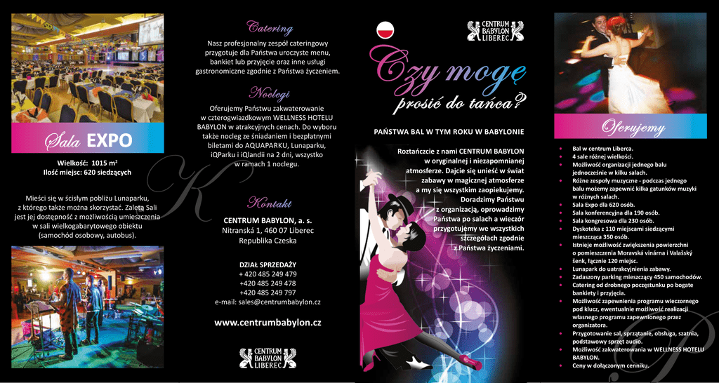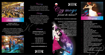 Catering Nasz profesjonalny zespół cateringowy przygotuje dla Państwa uroczyste menu, bankiet lub przyjęcie oraz inne usługi gastronomiczne zgodnie z Państwa życzeniem. Noclegi Sala EXPO Wielkość: 1015 m2 Ilość miejsc: 620 siedzących Mieści się w ścisłym pobliżu Lunaparku, z którego także można skorzystać. Zaletą Sali jest jej dostępność z możliwością umieszczenia w sali wielkogabarytowego obiektu (samochód osobowy, autobus). Oferujemy Państwu zakwaterowanie w czterogwiazdkowym WELLNESS HOTELU BABYLON w atrakcyjnych cenach. Do wyboru także nocleg ze śniadaniem i bezpłatnymi biletami do AQUAPARKU, Lunaparku, iQParku i iQlandii na 2 dni, wszystko w ramach 1 noclegu. Kontakt CENTRUM BABYLON, a. s. Nitranská 1, 460 07 Liberec Republika Czeska DZIAŁ SPRZEDAŻY + 420 485 249 479 +420 485 249 478 +420 485 249 797 e-mail: [email protected] www.centrumbabylon.cz Czy moge prosic do tanca? Oferujemy PAŃSTWA BAL W TYM ROKU W BABYLONIE Roztańczcie z nami CENTRUM BABYLON w oryginalnej i niezapomnianej atmosferze. Dajcie się unieść w świat zabawy w magicznej atmosferze a my się wszystkim zaopiekujemy. Doradzimy Państwu z organizacją, oprowadzimy Państwa po salach a wieczór przygotujemy we wszystkich szczegółach zgodnie z Państwa życzeniami. • • • • • • • • • • • • • • • • Bal w centrum Liberca. 4 sale różnej wielkości. Możliwość organizacji jednego balu jednocześnie w kilku salach. Różne zespoły muzyczne - podczas jednego balu możemy zapewnić kilka gatunków muzyki w różnych salach. Sala Expo dla 620 osób. Sala konferencyjna dla 190 osób. Sala kongresowa dla 230 osób. Dyskoteka z 110 miejscami siedzącymi mieszcząca 350 osób. Istnieje możliwość zwiększenia powierzchni o pomieszczenia Moravská vinárna i Valašský šenk, łącznie 120 miejsc. Lunapark do uatrakcyjnienia zabawy. Zadaszony parking mieszczący 450 samochodów. Catering od drobnego poczęstunku po bogate bankiety i przyjęcia. Możliwość zapewnienia programu wieczornego pod klucz, ewentualnie możliwość realizacji własnego programu zapewnionego przez organizatora. Przygotowanie sal, sprzątanie, obsługa, szatnia, podstawowy sprzęt audio. Możliwość zakwaterowania w WELLNESS HOTELU BABYLON. Ceny w dołączonym cenniku. MoravskáVinárna Sala konferencyjna Sala kongresowa DISCOClub Ilość miejsc: 60 siedzących Wielkość: 330 m2 Ilość miejsc: 190 siedzących Wielkość: 322 m2 Ilość miejsc: 230 siedzących Ilość miejsc: 110 siedzących, 350 miejsc stojących Znajdą ją Państwo przy głównym wejściu do części rozrywkowej CENTRUM BABYLON. Do dyspozycji jest technika audiowizualna (ściągany ekran 2,8 m x 2,8 m). Sala kongresowa znajduje się w nowej części WELLNESS HOTELU BABYLON. Do dyspozycji jest technika audiowizualna (ściągany ekran 2,8 m x 2,8 m). Mieści się przy głównym wejściu do CENTRUM BABYLON. Do dyspozycji są dwa bary, nowoczesny sprzęt oświetleniowy DMX, zaplecze dla wykonawców i pulpit dla DJ‘a. Stylowe pomieszczenia z atmosferą morawskich piwnic winnych w suterenie CENTRUM BABYLON. Istnieje możliwość połączenia obu sal. Ilość miejsc: 60 siedzących Valašský Šenk