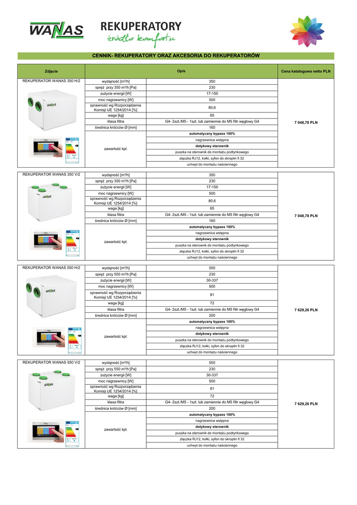 CENNIK- REKUPERATORY ORAZ AKCESORIA DO REKUPERATORÓW Zdjęcie REKUPERATOR WANAS 350 H/2 Opis wydajność [m³/h] Cena katalogowa netto PLN 350 spręż przy 350 m³/h [Pa] 230 zużycie energii [W] 17-150 moc nagrzewnicy [W] sprawność wg Rozporządzenia Komisji UE 1254/2014 [%] waga [kg] 80,6 klasa filtra G4- 2szt./M5 - 1szt. lub zamiennie do M5 filtr węglowy G4 średnica króćców Ø [mm] 160 500 65 7 048,78 PLN automatyczny bypass 100% nagrzewnica wstępna zawartość kpl. dotykowy sterownik puszka na sterownik do montażu podtynkowego złączka RJ12, kołki, syfon do skroplin fi 32 uchwyt do montażu naściennego REKUPERATOR WANAS 350 V/2 wydajność [m³/h] 350 spręż przy 350 m³/h [Pa] 230 zużycie energii [W] 17-150 moc nagrzewnicy [W] sprawność wg Rozporządzenia Komisji UE 1254/2014 [%] waga [kg] 80,6 klasa filtra G4- 2szt./M5 - 1szt. lub zamiennie do M5 filtr węglowy G4 średnica króćców Ø [mm] 160 500 65 7 048,78 PLN automatyczny bypass 100% nagrzewnica wstępna zawartość kpl. dotykowy sterownik puszka na sterownik do montażu podtynkowego złączka RJ12, kołki, syfon do skroplin fi 32 uchwyt do montażu naściennego REKUPERATOR WANAS 550 H/2 wydajność [m³/h] 550 spręż przy 550 m³/h [Pa] 230 zużycie energii [W] 30-337 moc nagrzewnicy [W] 500 sprawność wg Rozporządzenia Komisji UE 1254/2014 [%] 81 waga [kg] 72 klasa filtra G4- 2szt./M5 - 1szt. lub zamiennie do M5 filtr węglowy G4 średnica króćców Ø [mm] 200 7 629,26 PLN automatyczny bypass 100% nagrzewnica wstępna zawartość kpl. dotykowy sterownik puszka na sterownik do montażu podtynkowego złączka RJ12, kołki, syfon do skroplin fi 32 uchwyt do montażu naściennego REKUPERATOR WANAS 550 V/2 wydajność [m³/h] 550 spręż przy 550 m³/h [Pa] 230 zużycie energii [W] 30-337 moc nagrzewnicy [W] sprawność wg Rozporządzenia Komisji UE 1254/2014 [%] waga [kg] 500 klasa filtra G4- 2szt./M5 - 1szt. lub zamiennie do M5 filtr węglowy G4 średnica króćców Ø [mm] 200 81 72 automatyczny bypass 100% nagrzewnica wstępna zawartość kpl. dotykowy sterownik puszka na sterownik do montażu podtynkowego złączka RJ12, kołki, syfon do skroplin fi 32 uchwyt do montażu naściennego 7 629,26 PLN Zdjęcie REKUPERATOR WANAS 900 H Opis wydajność [m³/h] Cena katalogowa netto PLN 900 spręż przy 900 m³/h [Pa] 249 zużycie energii [W] 66-414 moc nagrzewnicy [W] 3 500 sprawność wg Rozporządzenia Komisji UE 1254/2014 [%] 86,5 waga [kg] 146 klasa filtra G4 - 2 szt. średnica króćców Ø [mm] 250 14 500,00 PLN automatyczny bypass 100% nagrzewnica wstępna zawartość kpl. dotykowy sterownik, moduł internetowy puszka na sterownik do montażu podtynkowego złączka RJ12, syfon do skroplin fi 32 REKUPERATOR WANAS 345 wydajność [m³/h] 345 spręż przy 345 m³/h [Pa] 150 zużycie energii [W] 21-131 moc nagrzewnicy [W] sprawność wg Rozporządzenia Komisji UE 1254/2014 [%] waga [kg] 82,4 klasa filtra G4 - 2 szt. średnica króćców Ø [mm] 160 500 56,4 7 050,00 PLN automatyczny bypass 100% nagrzewnica wstępna zawartość kpl. dotykowy sterownik, moduł internetowy puszka na sterownik do montażu podtynkowego złączka RJ12, syfon do skroplin fi 32 MODUŁ WANAS GWC 426 NAGRZEWNICA / CHŁODNICA WODNA WANAS 426 MODUŁ INTERNETOWY WANAS MOBILE CONTROL W-15 wydajność do [kW] 3,1 zużycie energii [W] 4-64 zasilanie [V/Hz] 230/50 średnica króćców Ø [mm] 200 waga [kg] 58 klasa filtra G4 układ króćców uniwersalny wydajność do [kW] 3,1 średnica króćców Ø [mm] 200 Wysokość/szerokość/głębokość 402/683/550 waga [kg] 30 układ króćców uniwersalny max. pobór prądu [mA] 100 wejście RJ 45 wyjście RJ12 zasilanie [V] 230 4 450,00 PLN 2 700,00 PLN 600,00 PLN zasilacz zawartość kpl. kabel z RJ 12 DTR ZESTAW FILTRÓW DO WANAS 350V lub WANAS 350H ZESTAW FILTRÓW DO WANAS 550V lub WANAS 550H klasa filtracji G3 szerokość [mm] 220 długość [mm] 480 wysokość [mm] 5 zawartość kpl. 2 szt. klasa filtracji G3 szerokość [mm] 220 długość [mm] 580 wysokość [mm] 5 zawartość kpl. 2 szt. 50,00 PLN 55,00 PLN Zdjęcie ZESTAW FILTRÓW DO WANAS 350V/2 lub WANAS 350H/2 ZESTAW FILTRÓW DO WANAS 550V/2 lub WANAS 550H/2 FILTR KASETOWY PLISOWANY M5 DO WANAS 350V/2 lub WANAS 350H/2 FILTR KASETOWY PLISOWANY M5 DO WANAS 550V/2 lub 550H/2 FILTR KASETOWY PLISOWANY G4 DO WANAS 900H FILTR KASETOWY PLISOWANY G4 DO WANAS 345 FILTR KASETOWY WĘGLOWY G4 DO WANAS 350V/2 lub 350H/2 FILTR KASETOWY WĘGLOWY G4 DO WANAS 550V/2 lub WANAS 550H/2 PRZEWÓD 4x0,14 Opis Cena katalogowa netto PLN klasa filtracji G4 szerokość [mm] 190 długość [mm] 480 wysokość [mm] 8 zawartość kpl. 2 szt. klasa filtracji G4 szerokość [mm] 190 długość [mm] 590 wysokość [mm] 8 zawartość kpl. 2 szt. klasa filtracji M5 szerokość [mm] 190 długość [mm] 480 wysokość [mm] 40 zawartość kpl. 1 szt. klasa filtracji M5 szerokość [mm] 190 długość [mm] 590 wysokość [mm] 40 zawartość kpl. 1 szt. klasa filtracji G4 szerokość [mm] 359 długość [mm] 647 wysokość [mm] 80 zawartość kpl. 1 szt. klasa filtracji G4 szerokość [mm] 260 długość [mm] 332 wysokość [mm] 40 zawartość kpl. 1 szt. klasa filtracji G4 szerokość [mm] 190 długość [mm] 480 wysokość [mm] 40 zawartość kpl. 1 szt. klasa filtracji G4 szerokość [mm] 190 długość [mm] 590 wysokość [mm] 40 zawartość kpl. 1 szt. przekrój [mm2] 4x0,14 ekranowany tak długość [mb] dowolna Przewód do połączenia rekuperatora ze sterownikiem. Cena za 1mb. 50,00 PLN 55,00 PLN 61,79 PLN 67,48 PLN 95,00 PLN 58,00 PLN 71,95 PLN 77,24 PLN 2,50 PLN Zdjęcie Opis Cena katalogowa netto PLN Czujnik temperatury W-1000 konieczny przy montażu GWC powietrznego lub glikolowego 69,11 PLN Stojak pod rekuperator, regulacja nóżek, wymiar: 750x450x200 (mm) 150,00 PLN Stojak pod rekuperator, regulacja nóżek, wymiar :750x550x200 (mm) 160,00 PLN CZUJNIK TEMPERATURY W-1000 STOJAK POD REKUPERATOR WANAS 350H/2 lub WANAS 350V/2 STOJAK POD REKUPERATOR WANAS 550H/