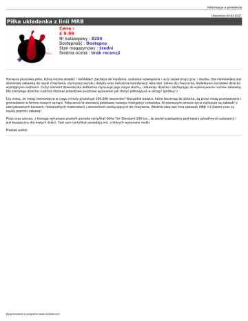 Informacje o produkcie Utworzono 04-03-2017 Piłka układanka z linii MRB Cena : £ 9.99 Nr katalogowy : 8256 Dostępność : Dostępny Stan magazynowy : średni Średnia ocena : brak recenzji Pierwsza pluszowa piłka, którą można składać i rozkładać! Zachęca do myślenia, szukania rozwiązania i uczy zasad przyczyny i skutku. Dla niemowlaka jest doskonałą zabawką do nauki chwytania, stymulacji wzroku, dotyku oraz ćwiczenia koordynacji ręka-oko. Łatwa do chwycenia, dodatkowo zaciekawi dziecko wystającymi metkami. Cichy element dzwoneczka delikatnie stymuluje jego zmysł słuchu, ciekawiąc dziecko i zachęcając do wykonywania ruchów zabawką. Dla starszego dziecka i rodzica stanowi prawdziwe puzzlowe wyzwanie! Jak złożyć półksiężyce w okrąg? Spróbuj!:) Czy wiesz, że mózg niemowlęcia w ciągu minuty produkuje 200.000 neuronów? Wszystkie bodźce, które docierają do dziecka, są przez mózg przetwarzane i gromadzone w formie nowych synaps. Połączenia te stanowią podstawę rozwoju inteligencji człowieka. W pierwszym okresie życia najlepsze są zabawki o zdecydowanych barwach, różnorodnych materiałach i elementach zachęcających do chwytania. Właśnie taka jest linia zabawek MRB <3 Zatem czas na naukę poprzez zabawę! Plusz oraz sztruks, z którego wykonano produkt posiada certyfikat Oeko-Tex Standard 100 tzn., że został przebadany pod kątem szkodliwych substancji i jest bezpieczny dla małych dzieci. Taki sam certyfikat posiadają nici, z których wykonano metki. Produkt polski. Wygenerowano w programie www.oscGold.com