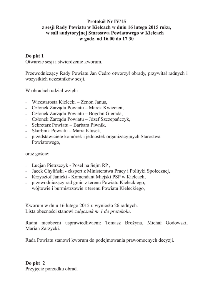 Protokół Nr IV/15 z sesji Rady Powiatu w Kielcach w dniu 16 lutego