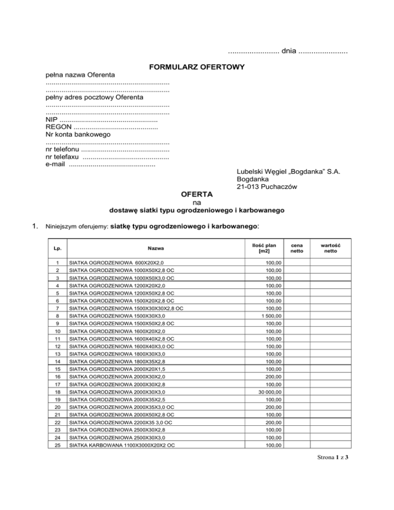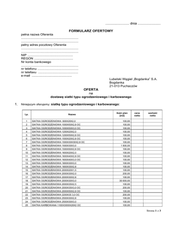 ........................ dnia ....................... FORMULARZ OFERTOWY pełna nazwa Oferenta ............................................................... ............................................................... pełny adres pocztowy Oferenta ............................................................... ............................................................... NIP .................................................. REGON ........................................... Nr konta bankowego ............................................................... nr telefonu ............................................. nr telefaxu ............................................ e-mail ............................................ OFERTA na Lubelski Węgiel „Bogdanka” S.A. Bogdanka 21-013 Puchaczów dostawę siatki typu ogrodzeniowego i karbowanego 1. Niniejszym oferujemy: siatkę typu ogrodzeniowego i karbowanego: Lp. Nazwa 1 SIATKA OGRODZENIOWA 600X20X2,0 3 SIATKA OGRODZENIOWA 1000X50X3,0 OC 2 4 5 6 7 8 9 10 11 12 13 14 15 16 17 18 19 20 21 22 23 24 25 SIATKA OGRODZENIOWA 1000X50X2,8 OC Ilość plan [m2] 100,00 100,00 100,00 SIATKA OGRODZENIOWA 1500X20X2,8 OC 100,00 SIATKA OGRODZENIOWA 1500X30X30X2,8 OC 100,00 100,00 SIATKA OGRODZENIOWA 1500X30X3,0 1 500,00 SIATKA OGRODZENIOWA 1600X20X2,0 100,00 SIATKA OGRODZENIOWA 1500X50X2,8 OC SIATKA OGRODZENIOWA 1600X40X2,8 OC SIATKA OGRODZENIOWA 1600X40X3,0 OC 100,00 100,00 100,00 SIATKA OGRODZENIOWA 1800X30X3,0 100,00 SIATKA OGRODZENIOWA 2000X20X1,5 100,00 SIATKA OGRODZENIOWA 1800X35X2,8 SIATKA OGRODZENIOWA 2000X30X2,0 SIATKA OGRODZENIOWA 2000X30X2,8 SIATKA OGRODZENIOWA 2000X30X3,0 SIATKA OGRODZENIOWA 2000X35X2,5 SIATKA OGRODZENIOWA 2000X35X3,0 OC SIATKA OGRODZENIOWA 2000X50X2,8 OC SIATKA OGRODZENIOWA 2200X35 3,0 OC 100,00 200,00 100,00 30 000,00 100,00 200,00 100,00 200,00 SIATKA OGRODZENIOWA 2500X30X2,8 100,00 SIATKA KARBOWANA 1100X3000X20X2 OC 100,00 SIATKA OGRODZENIOWA 2500X30X3,0 wartość netto 100,00 SIATKA OGRODZENIOWA 1200X20X2,0 SIATKA OGRODZENIOWA 1200X50X2,8 OC cena netto 100,00 Strona 1 z 3 26 SIATKA KARBOWANA 1500X3000X30X4 28 SIATKA KARBOWANA 1500X3000X50X4 27 29 2. 3. 4. 5. 6. 7. 8. 9. 10. 11. 12. 13. 14. 15. SIATKA KARBOWANA 1500X3000X30X4 OC SIATKA KARBOWANA 1500x3000x40x4 wartość razem 2 500,00 2 000,00 100,00 100,00 Oświadczamy, że powyższe ceny uwzględniają koszty związane z wykonaniem przedmiotu zamówienia, w tym: a) …., b) …., c) ….. Oświadczamy, że ceny określone powyżej są cenami maksymalnymi i mogą podlegać negocjacji. Akceptujemy, że zapłata ceny (wynagrodzenia) nastąpi w formie przelewu bankowego w terminie do 30 dni od daty dostarczenia Zamawiającemu wystawionej prawidłowo i zgodnie z postanowieniami umowy faktury VAT. Oferujemy realizację zamówienia okresowego w terminie ............... dni, liczone od dnia otrzymania danego zamówienia okresowego Oświadczamy, że udzielamy na przedmiot umowy ……. miesięcznej gwarancji jakości. Oświadczamy, że jesteśmy związani niniejszą ofertą przez okres 100 dni od dnia upływu terminu składania ofert. Wadium w kwocie ……………………………………. zł zostało wniesione w dniu ………………… w formie …………………………………………………… (potwierdzenie wniesienia w załączeniu). Oświadczamy, że zapoznaliśmy się z Warunkami przetargu, akceptujemy ich postanowienia oraz uznajemy się za związanych określonymi w nich wymaganiami i zasadami postępowania, a także zrzekamy się wszelkich roszczeń w stosunku do Zamawiającego w przypadku niezaproszenia oferenta do negocjacji (licytacji/aukcji elektronicznej), jak również niedokonania przez Zamawiającego wyboru oferty oferenta, w tym unieważnienia postępowania bez podawania przyczyn. Oświadczamy, że zapoznaliśmy się z zawartym w Warunkach przetargu projektem umowy (w tym odpowiednimi Ogólnymi Warunkami Umów Dostawy obowiązującymi w Lubelskim Węglu „Bogdanka” S.A., udostępnionymi poprzez umieszczenie w postaci elektronicznej na stronie internetowej www.lw.com.pl w zakładce: Serwis handlowy → Przetargi → Regulaminy i zarządzenia – jeżeli projekt umowy odsyła do postanowień OWUD), został on przez nas zaakceptowany i zobowiązujemy się w przypadku wyboru naszej oferty do zawarcia umowy na wyżej wymienionych warunkach w miejscu i terminie wyznaczonym przez Zamawiającego, z zastrzeżeniem uwag (propozycji zmian) zawartych na str. …. oferty*. Oświadczamy, że wyrażamy zgodę na przeprowadzenie audytu w naszej siedzibie przez służby LW Bogdanka na zasadach określonych w postanowieniach Rozdziału II pkt od 27 do 32 włącznie Ogólnych Warunków Umów obowiązujących w Grupie Kapitałowej Lubelskiego Węgla „BOGDANKA” S.A. w Bogdance (dalej: OWUD) udostępnionych poprzez umieszczenie w postaci elektronicznej na stronie internetowej www.lw.com.pl w zakładce: Serwis handlowy → Przetargi → Regulaminy i zarządzenia → Ogólne Warunki Umów Dostawy dla postępowań ogłaszanych po 20.07.2015 r. [http://www.lw.com.pl/pl,1,s57,regulaminy_i_zarzadzenia.html]. Oświadczamy, że przysługują nam uprawnienia do zawarcia umowy i wykonania świadczeń wynikających z tej umowy z poszanowaniem praw osób trzecich z jakiegokolwiek tytułu, w tym bez naruszania praw ochronnych z zakresu własności przemysłowej Oświadczamy, że: a) nie zalegamy z opłacaniem podatków i opłat / posiadamy dokument potwierdzający uzyskanie przewidzianego prawem zwolnienia, odroczenia lub rozłożenia na raty zaległych płatności lub wstrzymanie w całości wykonania decyzji właściwego organu podatkowego* b) nie zalegamy z opłacaniem opłat ani składek na ubezpieczenie zdrowotne i społeczne / posiadamy dokument potwierdzający uzyskanie przewidzianego prawem zwolnienia, odroczenia lub rozłożenia na raty zaległych płatności lub wstrzymanie w całości wykonania decyzji właściwego organu* Oświadczamy, że w stosunku do