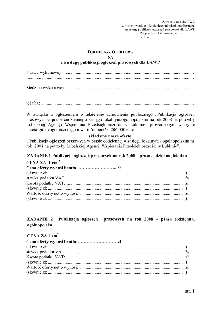 Załącznik nr 1 do SIWZ w postępowaniu o udzielenie zamówienia publicznego na usługę publikacji ogłoszeń prasowych dla LAWP Załącznik nr 1 do umowy nr ………..…. z dnia ………………………….………. FORMULARZ OFERTOWY NA na usługę publikacji ogłoszeń prasowych dla LAWP Nazwa wykonawcy ...................................................................................................................... ...................................................................................................................................................... Siedziba wykonawcy .................................................................................................................. ...................................................................................................................................................... tel./fax: ......................................................................................................................................... W związku z ogłoszeniem o udzielenie zamówienia publicznego „Publikacja ogłoszeń prasowych w prasie codziennej o zasięgu lokalnym/ogólnopolskim na rok 2008 na potrzeby Lubelskiej Agencji Wspierania Przedsiębiorczości w Lublinie” prowadzonym w trybie przetargu nieograniczonego o wartości poniŜej 206 000 euro. składamy naszą ofertę. „Publikacja ogłoszeń prasowych w prasie codziennej o zasięgu lokalnym / ogólnopolskim na rok 2008 na potrzeby Lubelskiej Agencji Wspierania Przedsiębiorczości w Lublinie”. ZADANIE 1 Publikacja ogłoszeń prasowych na rok 2008 – prasa codzienna, lokalna CENA ZA 1 cm 2 Cena oferty wynosi brutto …………………….. zł (słownie zł: .......................................................................................................................... stawka podatku VAT: ......................................................................................................... Kwota podatku VAT: ......................................................................................................... (słownie zł: .......................................................................................................................... Wartość oferty netto wynosi: ............................................................................................. (słownie zł: .......................................................................................................................... ZADANIE 2 ogólnopolska Publikacja ogłoszeń ) % zł ) zł ) prasowych na rok 2008 – prasa codzienna, CENA ZA 1 cm2 Cena oferty wynosi brutto:………………………zł (słownie zł: .......................................................................................................................... stawka podatku VAT: ......................................................................................................... Kwota podatku VAT: ......................................................................................................... (słownie zł: .......................................................................................................................... Wartość oferty netto wynosi: ............................................................................................. (słownie zł: .......................................................................................................................... ) % zł ) zł ) str. 1 1. Cena obejmuje wszystkie koszty niezbędne do prawidłowej realizacji przedmiotu zamówienia zgodnie z wymogami zawartymi w SIWZ. 2. Oświadczam, Ŝe zapoznałem się z warunkami przedstawionymi w SIWZ i nie zgłaszam do nich zastrzeŜeń. 3. W przypadku udzielenia nam zamówienia, zobowiązujemy się do zawarcia umowy w miejscu i terminie wskazanym przez Zamawiającego, lecz nie wcześniej niŜ 7 dni od dnia otrzymania powiadomienia o wyborze naszej oferty. 4. Oferta zawiera ..................ponumerowanych stron. 5. Oświadczmy, Ŝe uwaŜamy się za związanych niniejszą ofertą przez okres 30dni. ………………………………………………………………………………………………… …………………………………………………………………………………………… ................................, dn. ....................................... …………………………………………. (podpis i pieczątka imienna osoby upowaŜnionej do składania oświadczeń woli w imieniu Wykonawcy) str. 2