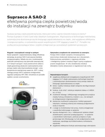 6 | Powietrzne pompy ciepła Supraeco A SAO-2 efektywna pompa ciepła powietrze/woda do instalacji na zewnątrz budynku Szukasz pompy ciepła powietrze/woda, która jest cicha i zajmie niewiele miejsca w domu? Pompa Supraeco A SAO-2 jest więc idealnym rozwiązaniem. Wyposażona w technologię inwerterową automatycznie dostosowuje się do bieżącego zapotrzebowania na ciepło. Jest wyjątkowo efektywna i energooszczędna, co potwierdza wysoki współczynnik COP sięgający nawet 5,1*. Ponadto ma podłączenia pozwalające łatwo i szybko zintegrować ją z posiadanym systemem grzewczym. Wygoda i oszczędność energii w jednym Optymalne urządzenie do ustawienia na zewnątrz Nowe sprężarki i zoptymalizowany obieg chłodniczy Pompa SAO-2 dzięki swojemu innowacyjnemu sprawiają, że pompa SAO-2 jest jeszcze bardziej wzornictwu doskonale komponuje się z otoczeniem. energooszczędna. Składa się ona z modulowanej Niskoszumowy wentylator z regulacją obrotów jednostki zewnętrznej oraz jednostki wewnętrznej i inteligentny system niwelacji drgań czynią urządzenie w 4 różnych wersjach. Duże powierzchnie odbioru prawie bezgłośnym. W celu dodatkowej redukcji ciepła gwarantują skuteczne wykorzystanie przez dźwięków można aktywować w regulatorze tryb cichy. pompę ciepła całej doprowadzanej energii – przy temperaturze zewnętrznej nawet do -20oC. Łatwą obsługę pompy SAO-2 zapewnia zintegrowany regulator pokojowy HPC 400. Umożliwia on ponadto Najważniejsze korzyści: szybkie i proste uruchomienie. XXwyjątkowa efektywność energetyczna (współczynnik COP sięgający 5,1*) dzięki zastosowaniu technologii inwertera z automatycznym dostosowaniem mocy pompy ciepła do bieżącego zapotrzebowania na ciepło XXłatwa i szybka instalacja dzięki wstępnie skonfigurowanym elementom XXfunkcja „tryb cichy”: redukcja natężenia hałasu o 3 dB(A) np. w nocy XXmożliwość łatwego i efektywnego energetycznie przejścia European Quality Label for Heat Pumps check the validity of this label at www.ehpa.org/QL między funkcją chłodzenia a trybem c.w.u. (w wersjach ze zintegrowanym dogrzewaczem) XXelastyczne możliwości połączenia z kotłem gazowym/ olejowym, instalacją solarną lub instalacją podgrzewania wody w basenie XXz uwagi na modulowany tryb pracy, można zrezygnować z zasobnika buforowego w systemie XXwysoka dostępność c.w.u. i efektywność systemu dzięki dodatkowemu zaworowi przełączającemu – w systemie z zasobnikiem buforowym, podczas przejścia z trybu grzewczego lub chłodzącego na tryb podgrzewania wody użytkowej, zapobiega się krótkotrwałemu schłodzeniu zasobnika XXwyjątkowo efektywne funkcje automatycznego odmrażania * w temp. +7/35°C wg EN 14511 Powietrzne pompy ciepła | 7 5 Budowa 6 1 Inwerter 2 Dwa elektroniczne zawory rozprężne 3 Pompa rotacyjna z tłokiem mimośrodowym 4 Z integrowana taca na skropliny 4 z kablem grzewczym 2 5 Obudowa odporna na warunki atmosferyczne 6 Wentylator pracujący w trybie modulacyjnym 7 7 Izolacja wykonana z EPP 1 3 Jednostka zewnętrzna pracująca w trybie modulacyjnym z jednostkami wewnętrznymi w 4 wersjach z wbudowanym modułem internetowym SAO-2 + Jednostka wewnętrzna ACB ACE ACM ACM-solar Obszar zastosowania modernizacja nowe budownictwo nowe budownictwo nowe budownictwo Tryb pracy biwalentny monoenergetyczny monoenergetyczny monoenergetyczny Podgrzewacz c.w.u. elastyczne rozwiązania systemów z zastosowaniem zasobników c.w.u. marki Junkers elastyczne rozwiązania systemów z zastosowaniem zasobników c.w.u. marki Junkers 190 l zasobnik c.w.u. 184 l zasobnik c.w.u. z wężownicą Wyposażenie zawór mieszający dogrzewacz elektryczny dogrzewacz elektryczny dogrzewacz elektryczny Dane techniczne Model Moc grzewcza: +2/35°C [kW] * Moc grzewcza: +7/35°C [kW] * COP +2/35°C * COP +7/35°C * SAO 60-2 SAO 80-2 SAO 110-2 SAO 140-2 6 8 11 14 7 9 13 17 4,1 4,3 4,1 4,0 4,8 5,1 4,9 4,8 -20 do +35 -20 do +35 -20 do +35 -20 do +35 62 62 62 62 R410A R410A R410A R410A 71 75 130 132 Wysokość [mm] 1370 1370 1680 1680 Szerokość [mm] 930 930 1200 1200 Głębokość [mm] 440 440 580 580 Temperatury graniczne [°C] Maks. temp. na zasilaniu [°C] Czynnik chłodniczy Masa [kg] Wymiary: Zawiera fluorowane gazy cieplarniane Rodzaj czynnika chłodniczego Ilość czynnika chłodniczego [kg] Tak Tak Tak Tak R410A R410A R410A R410A 1,75 2,35 3,3 4 GWP czynnika chłodniczego [kg CO2-eq] 2,088 2,088 2,088 2,088 Ilość czynnika chłodniczego [to CO2-eq] 3,654 4,907 6,89 8,352 Tak Tak Tak Tak Zamkniete hermetycznie * wg EN 14511 8 | Powietrzne pompy ciepła Supraeco A SAO-2 cztery jednostki wewnętrzne dostosowane do każdego zapotrzebowania Zarówno w nowym budownictwie, jak i obiektach modernizowanych: Junkers oferuje cztery różne wersje urządzeń, które zapewniają właściwe rozwiązanie dostosowane do indywidualnych potrzeb. Idealne wyposażenie Model ACE dla nowego budownictwa Wszystkie 4 jednostki wewnętrzne wyróżniają się Zamontowana na ścianie jednostka wewnętrzna ACE zwartą konstrukcją i niewielkimi wymiarami, jest wyposażona w dogrzewacz elektryczny pokrywający a modulowany tryb pracy sprawia, że zbiornik ewentualne dodatkowe zapotrzebowanie na ciepło buforowy staje się zbędny. i c.w.u. Model ACB dla obiektów modernizowanych Modele ACM, ACM-solar dla nowego budownictwa Zainstalowaną na ścianie jednostką wewnętrzną ACM: W stojącym module wewnętrznym jest już ACB można w łatwy sposób połączyć zintegrowany zasobnik c.w.u. o pojemności 190 litrów. z istniejącym urządzeniem grzewczym. To jednocześnie doskonałe rozwiązanie do ogrzewania oraz podgrzewu ciepłej wody w nowym budownictwie. ACM-solar: W stojącym module wewnętrznym zintegrowany jest zasobnik c.w.u. o pojemności 184 litrów. Moduł ten można połączyć z instalacją solarną do podgrzewu c.w.u. w nowym budownictwie. Najważniejsze korzyści: XXefektywna praca dzięki inteligentnemu regulatorowi pompy c